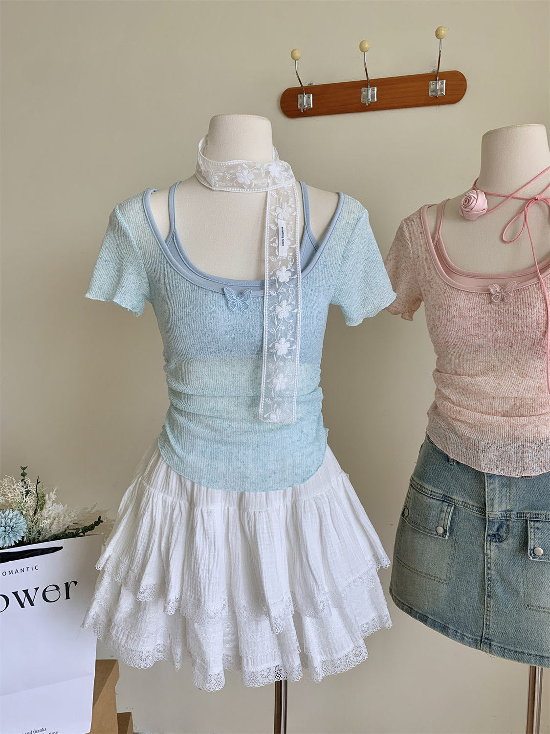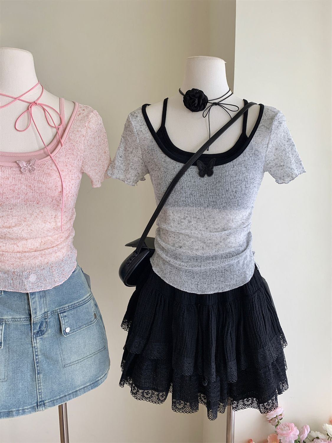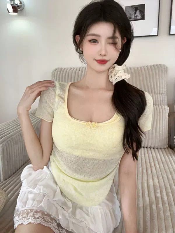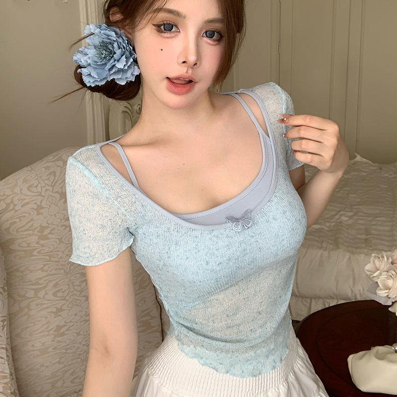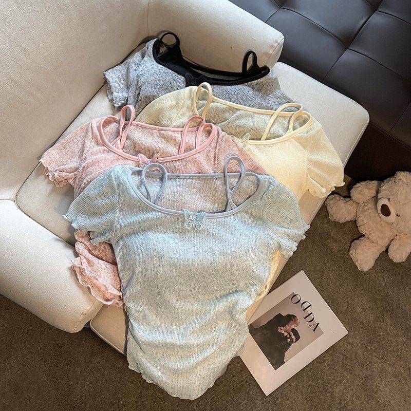 66011 # 퓨어 러스터 얇은 살짝 시스루 반팔 티셔츠 여름 패딩 캐미솔 탑 레이어드 투피스 세트스토어 가기