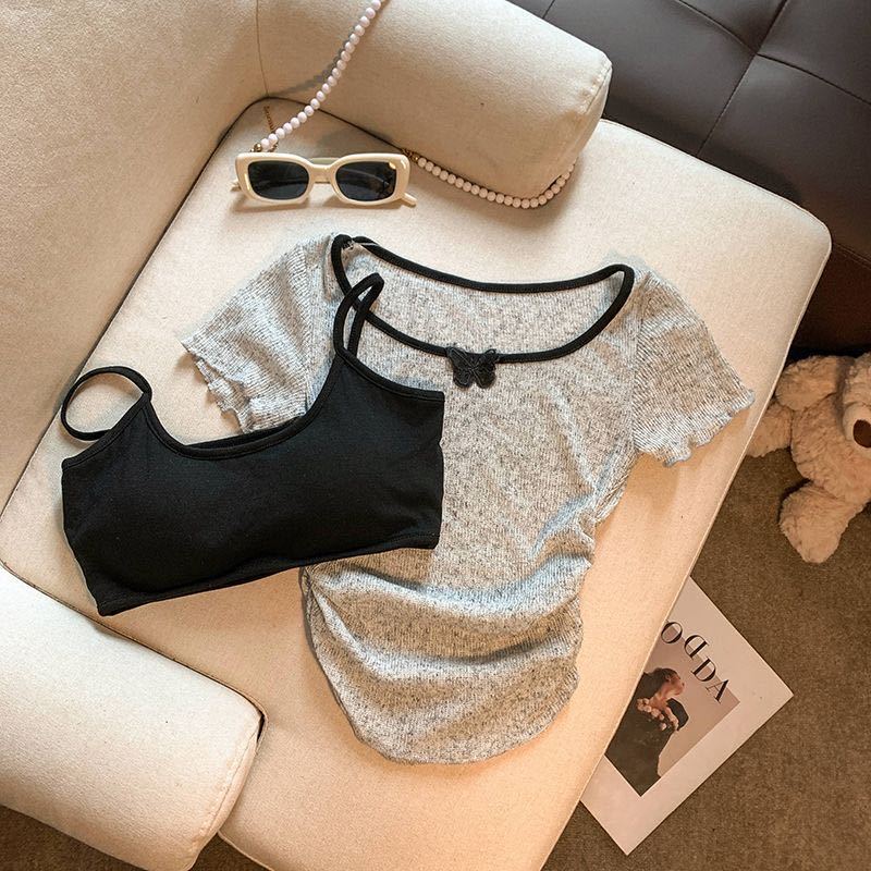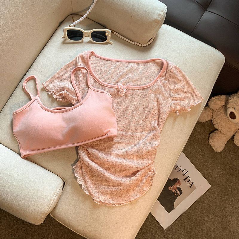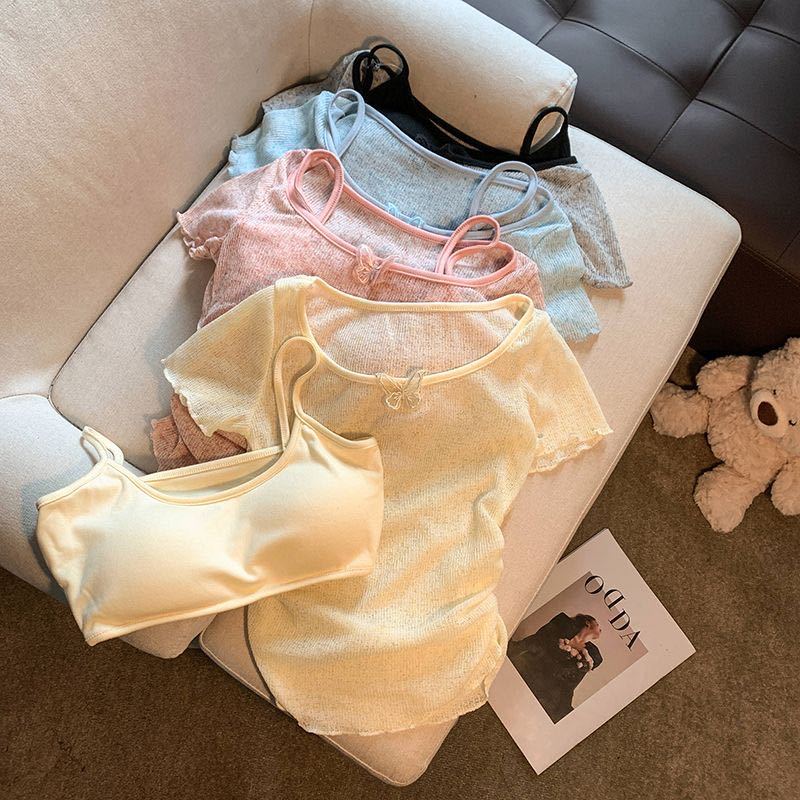 66011 # 퓨어 러스터 얇은 살짝 시스루 반팔 티셔츠 여름 패딩 캐미솔 탑 레이어드 투피스 세트