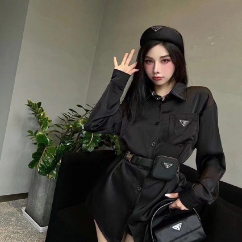 2024 이른 봄 새로운 스타일 아세테이트 셔츠와 허리 가방 루즈한 중간 길이 긴팔 셔츠 여성용 재고 있음