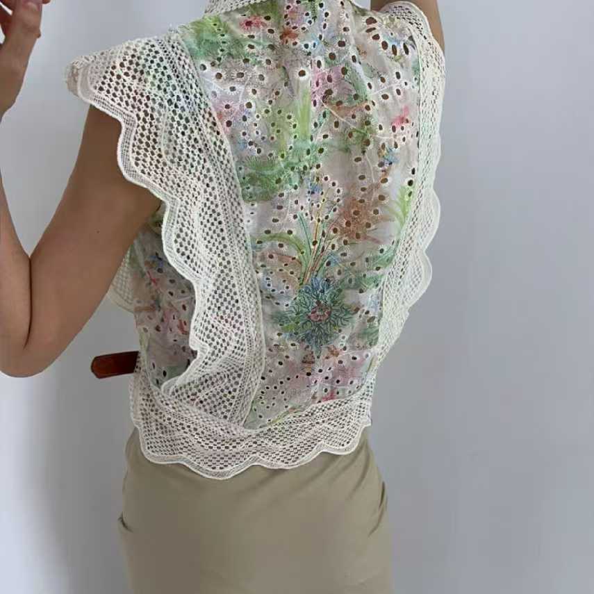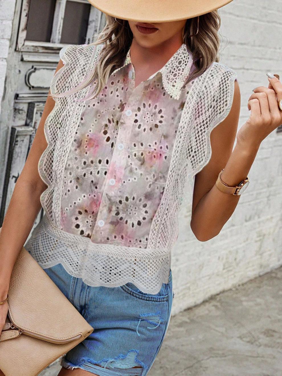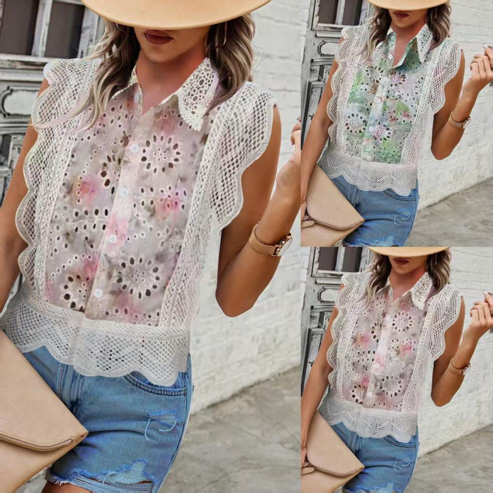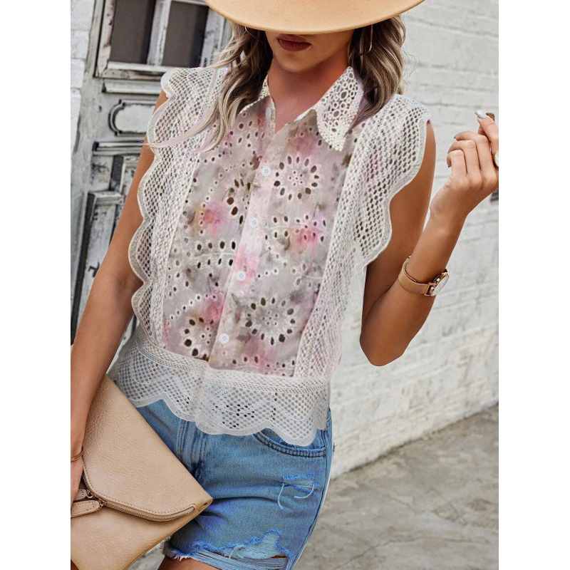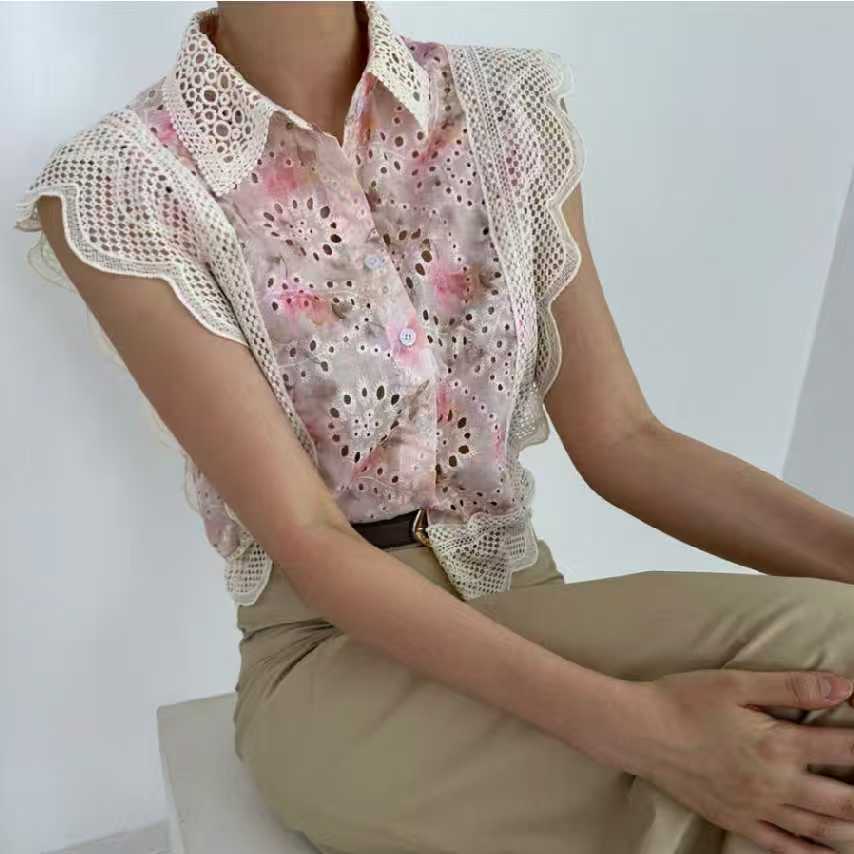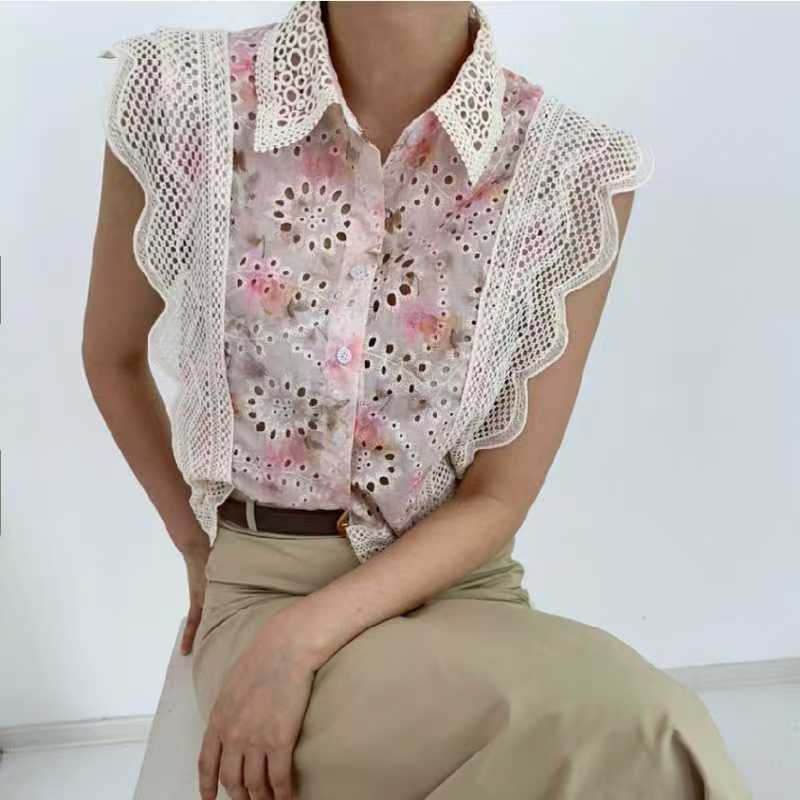 2025년 여름 신작 아마존 유럽과 미국의 베스트셀러 중공 라펠 크로셰 플라잉 슬리브 레이스 쉬폰 셔츠