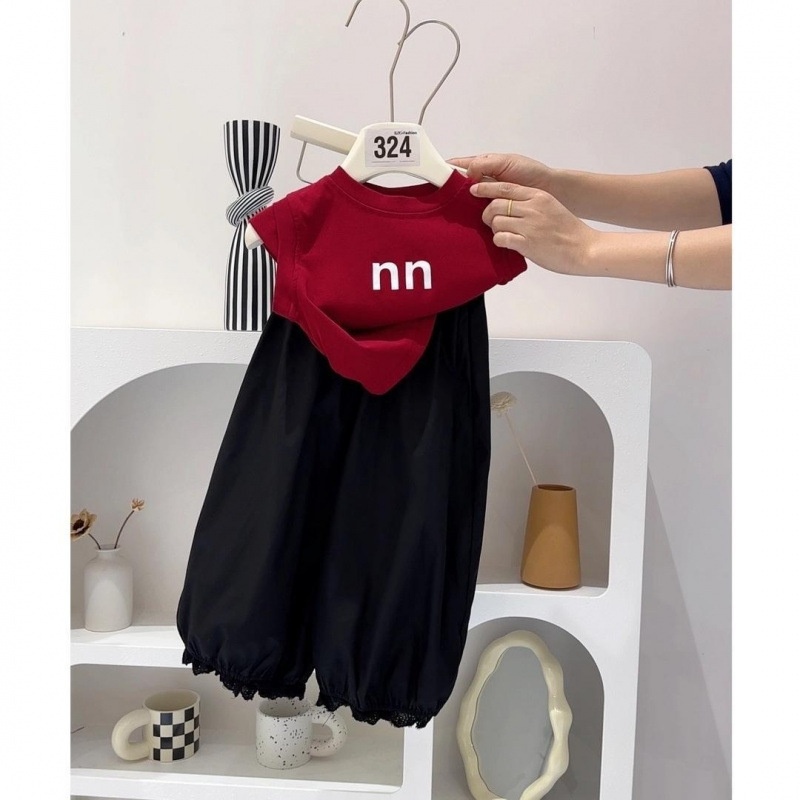 여자 여름 정장 2025 새로운 어린이 여름 정장 서양식 반팔 티셔츠 블루머 투피스 여름 정장스토어 가기