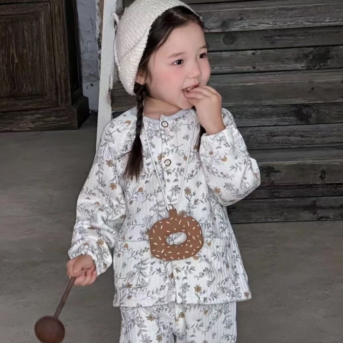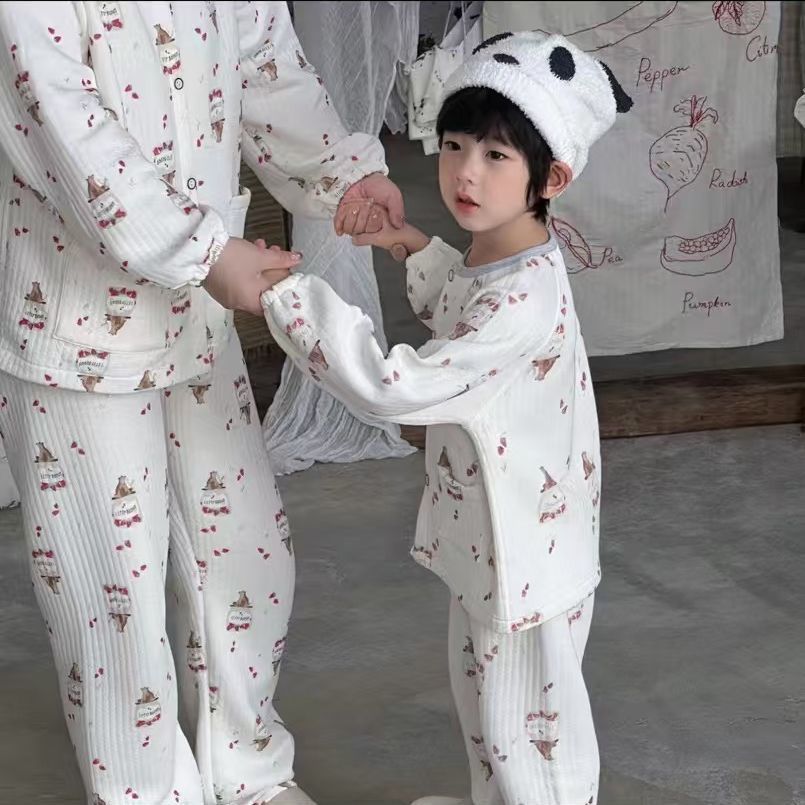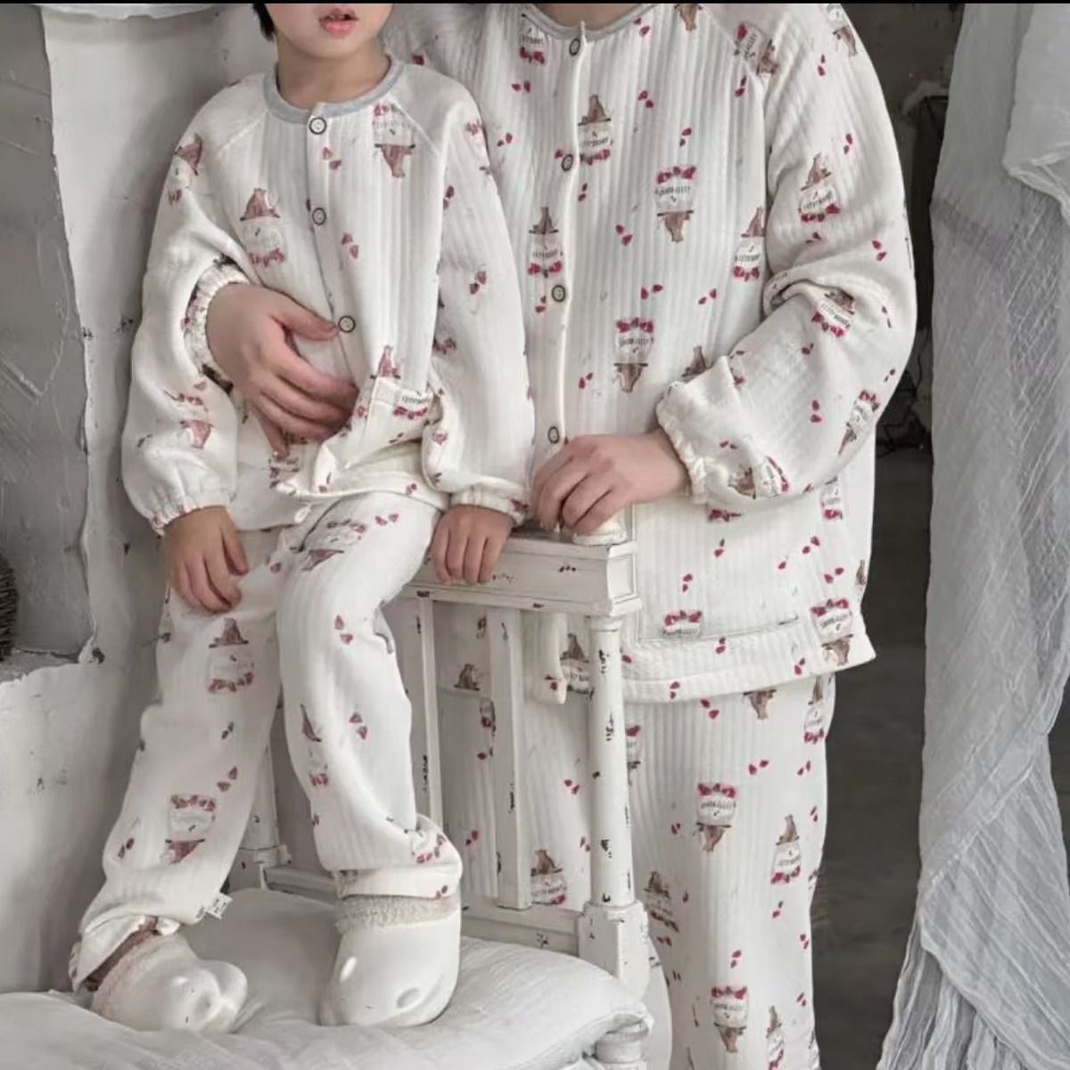 어린이 부모-자식 3겹 새 누비 꽃무늬 잠옷 아기 가정복 따뜻한 비수기 긴팔 양복