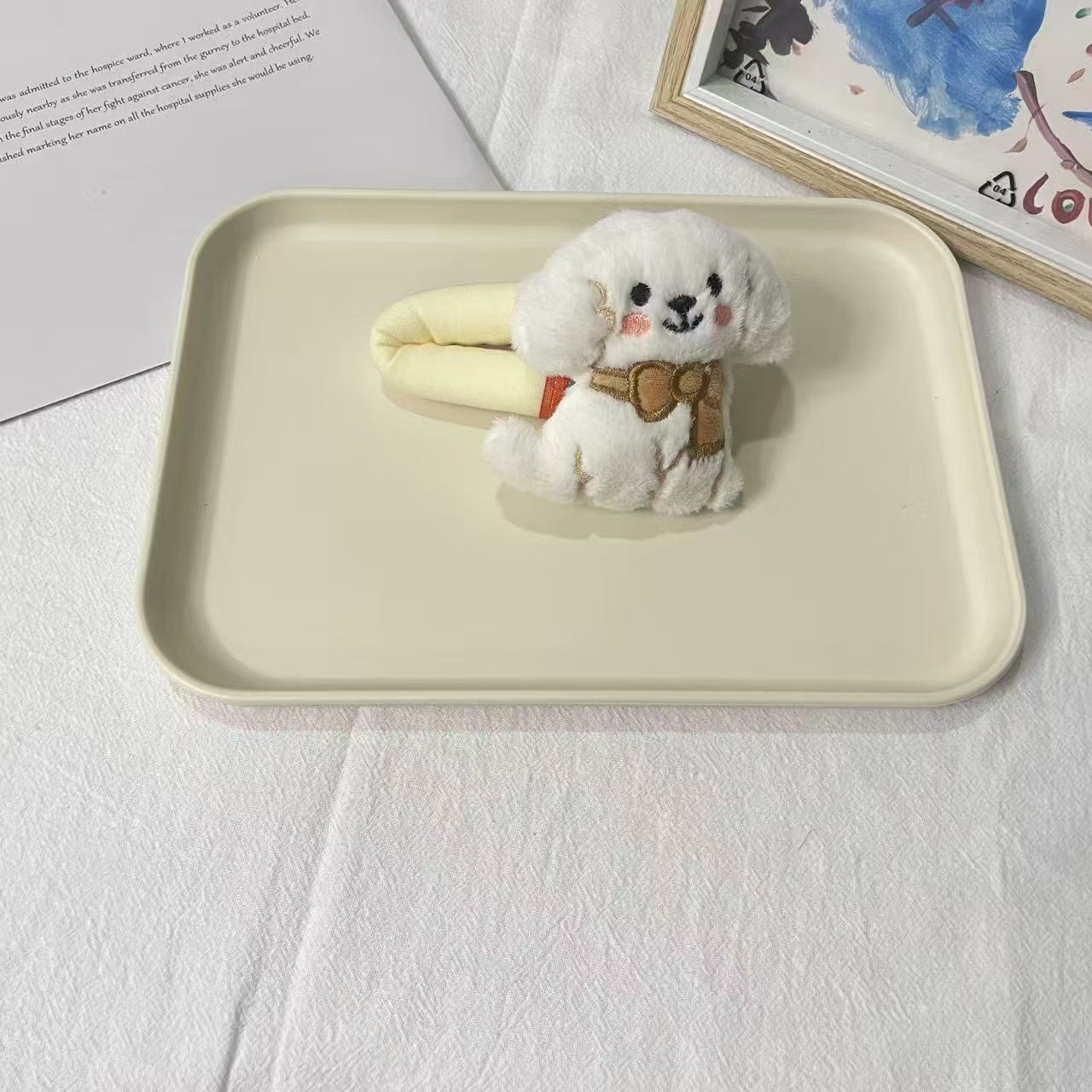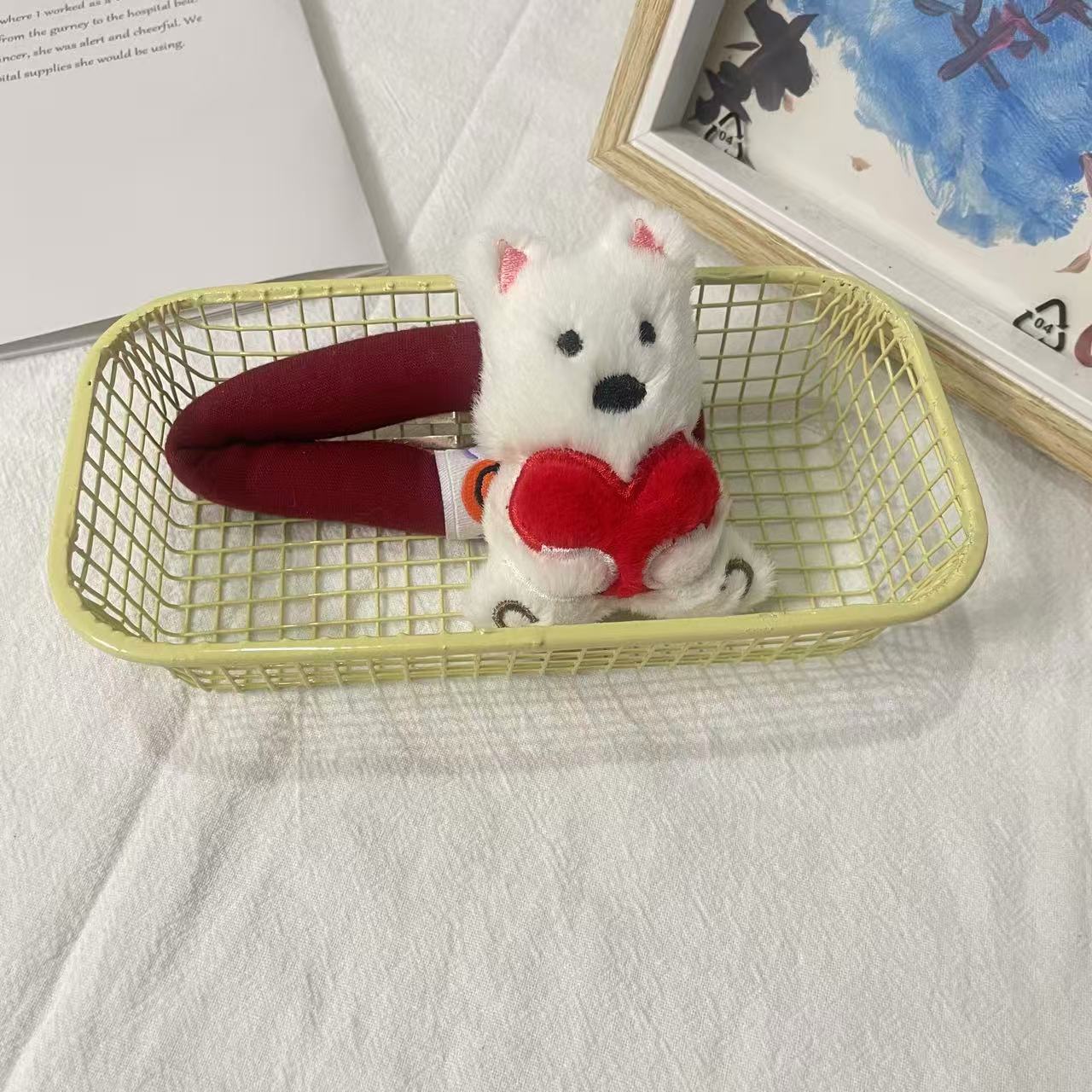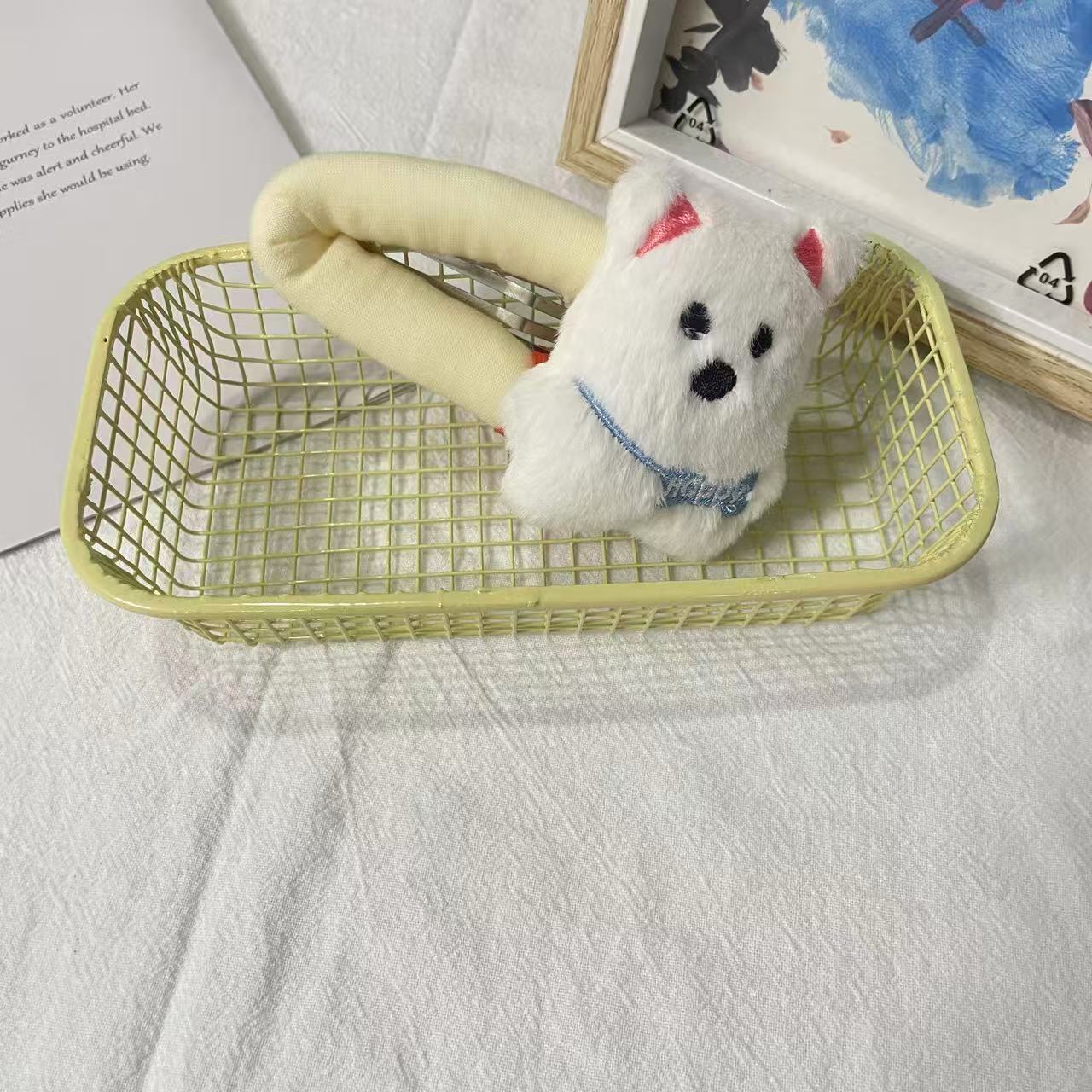 • 흰색 가방을 들고 있는 강아지