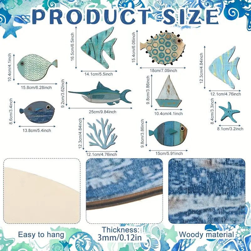 해변 테마 욕실 장식용 나무 벽걸이 물고기 모양 장식품 10개 (접착식)