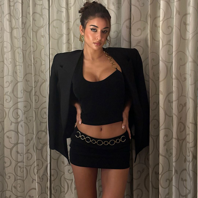 2025 봄 신작 여성 메탈 링 비대칭 캐미솔 백리스 슬리밍 힙 스커트 트렌디