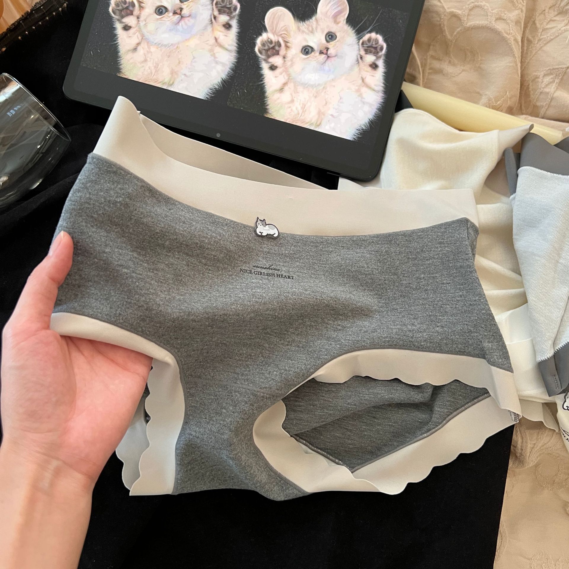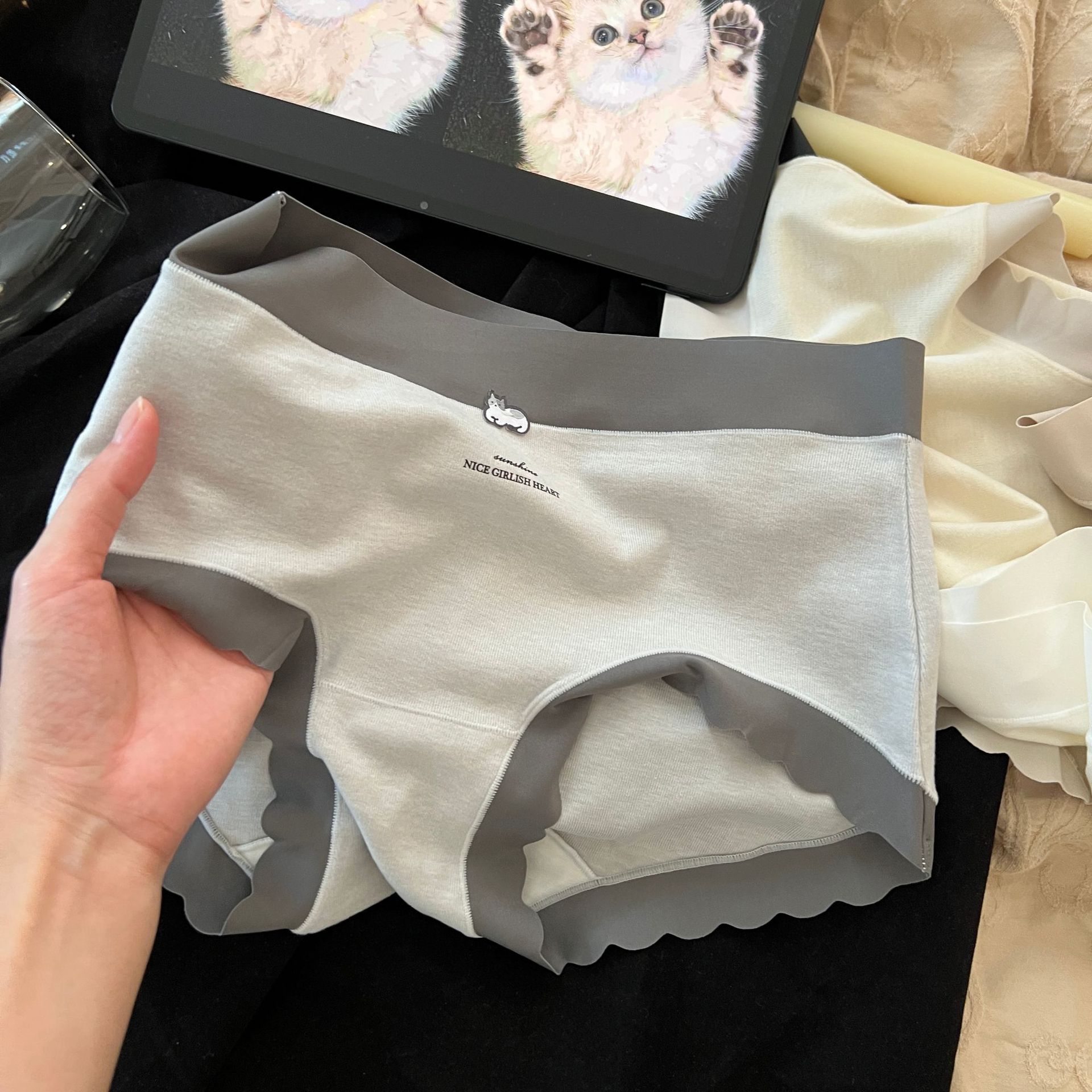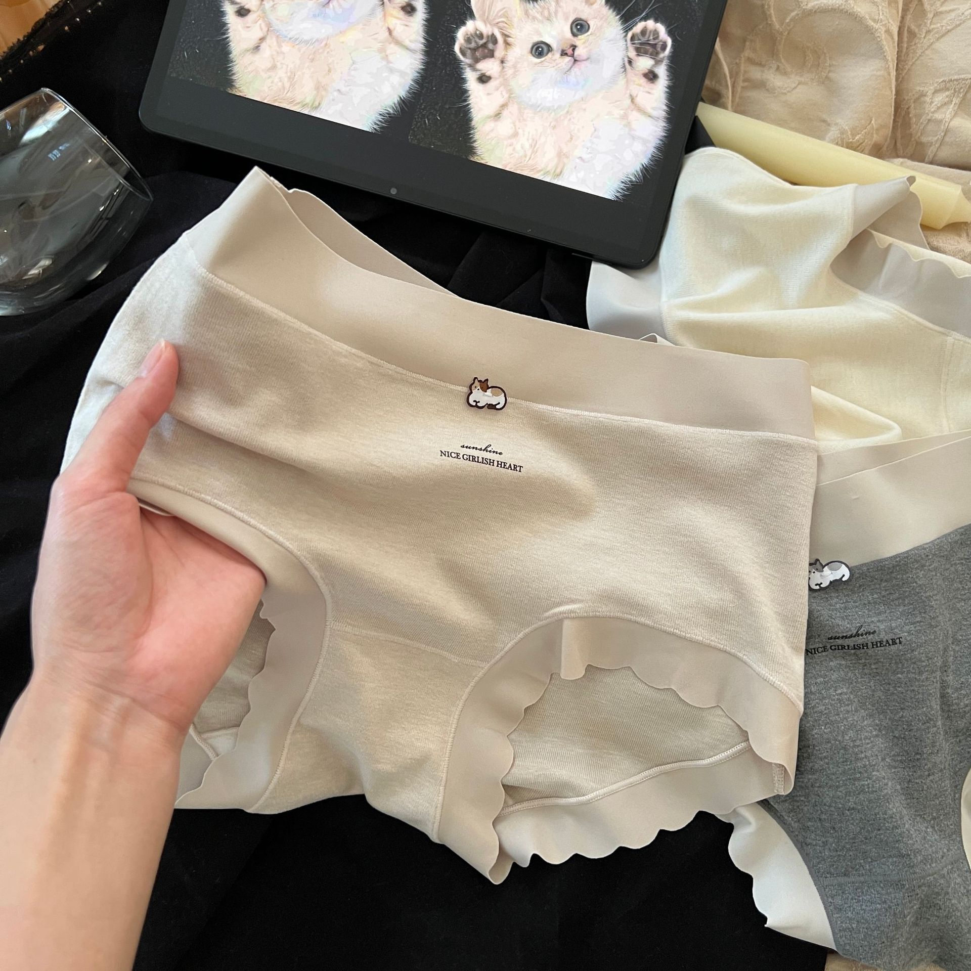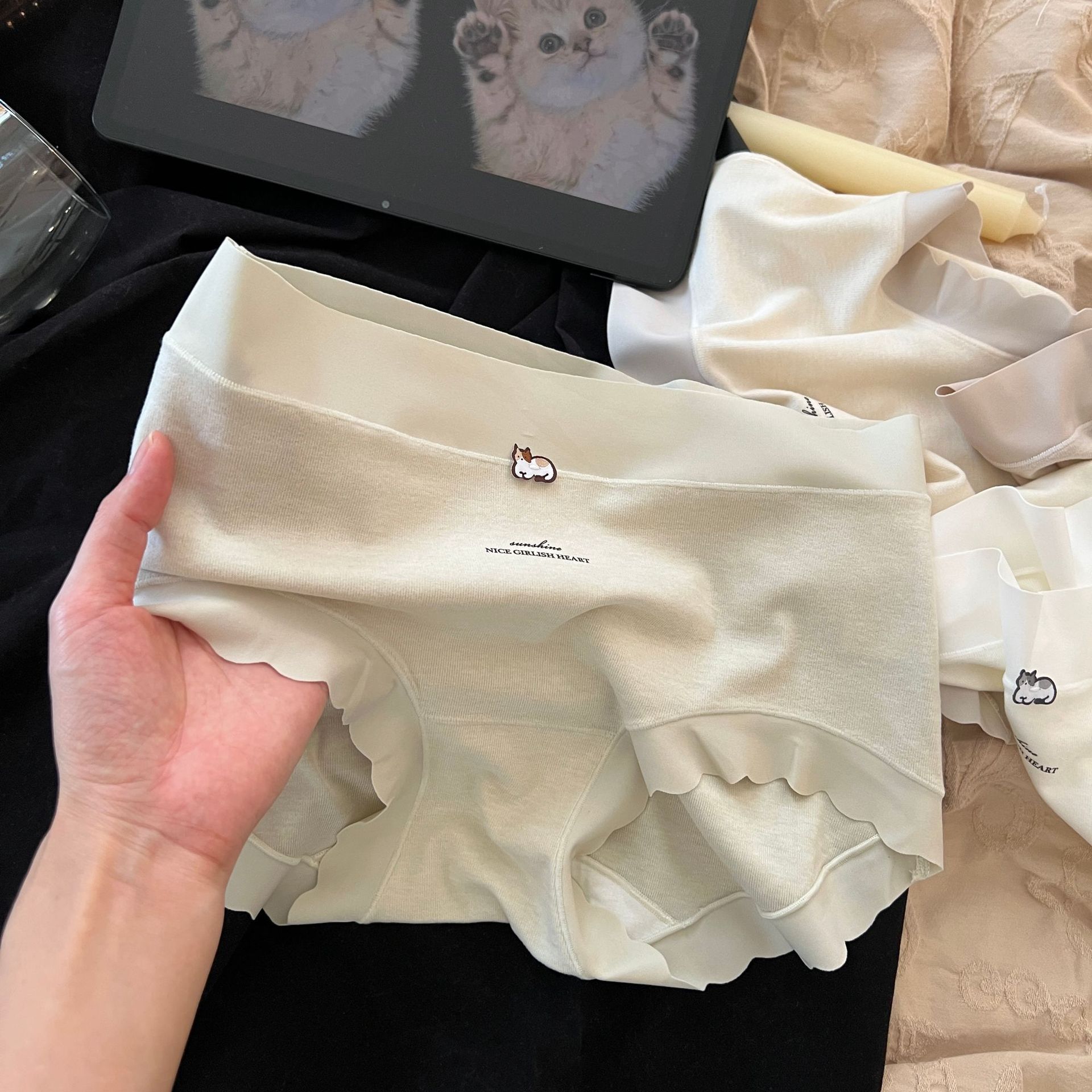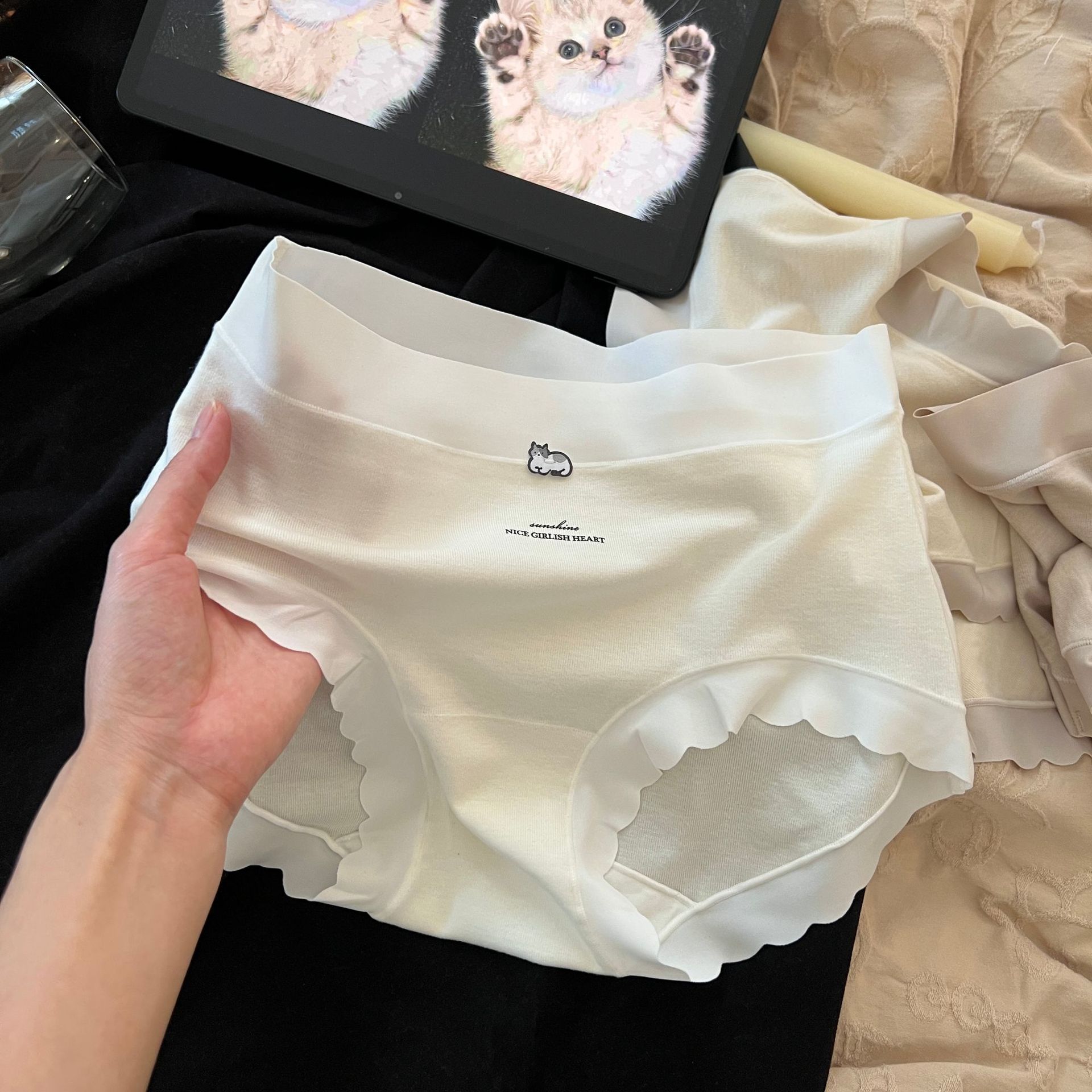 Peach Dona 가을 겨울 따뜻하고 피부 친화적인 기모 모리 크림 새끼 고양이 통기성 코튼 가랑이 여성용 중간 허리 팬티