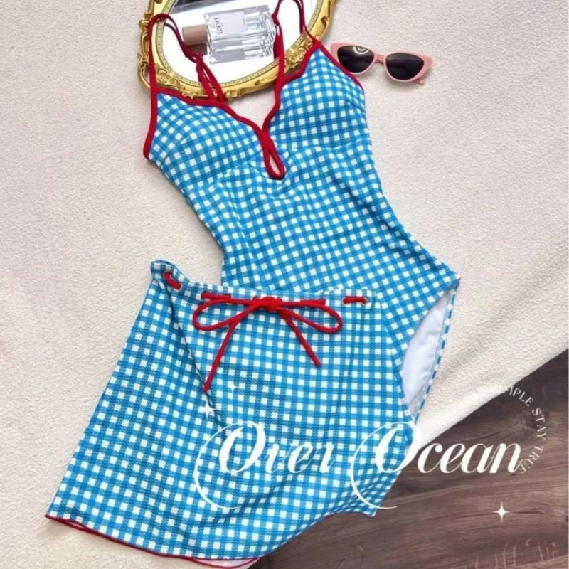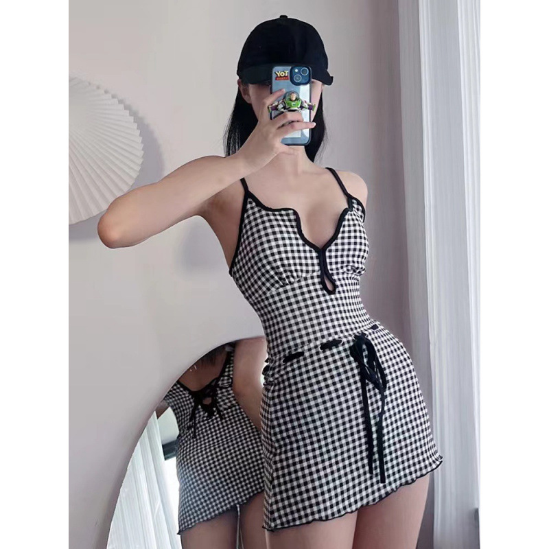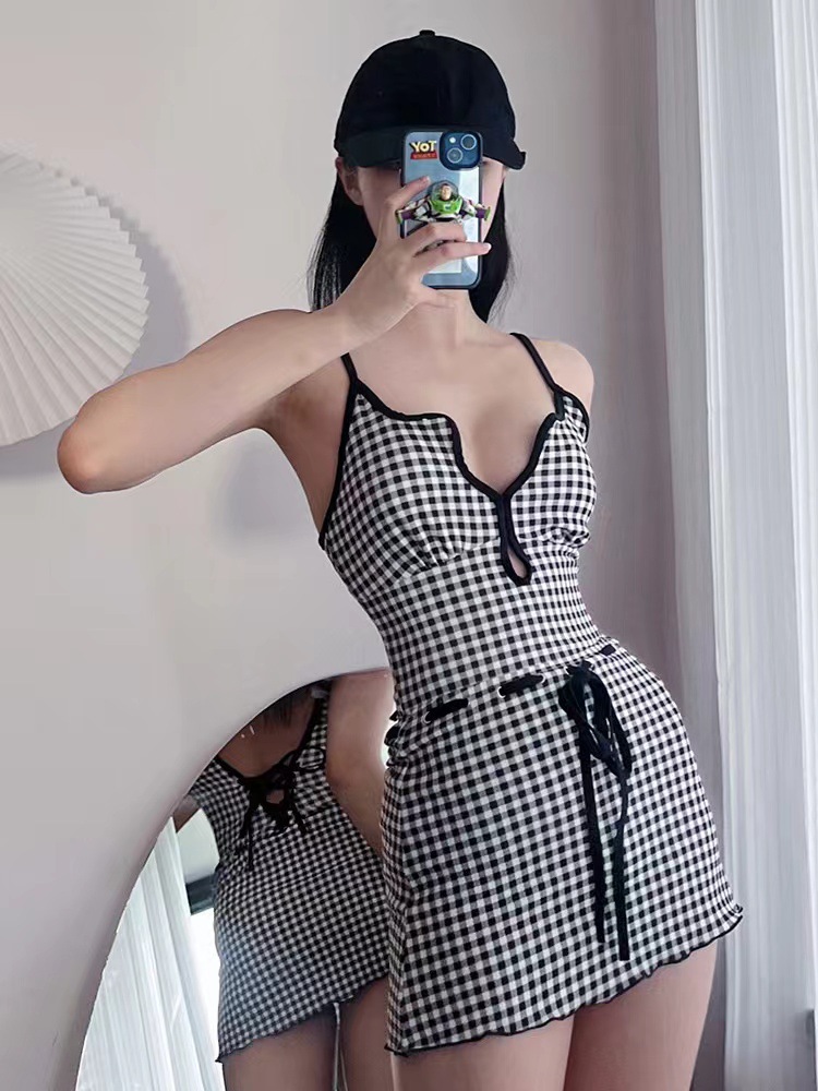 여름 신작 여성 일본식 작은 신선한 로리 순수한 욕망 학생 격자 무늬 멜빵 등이없는 섹시한 온천 원피스 수영복