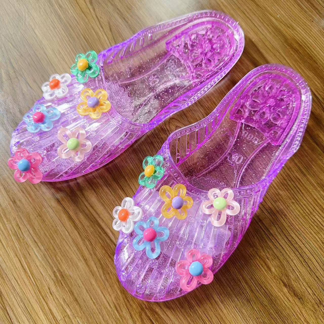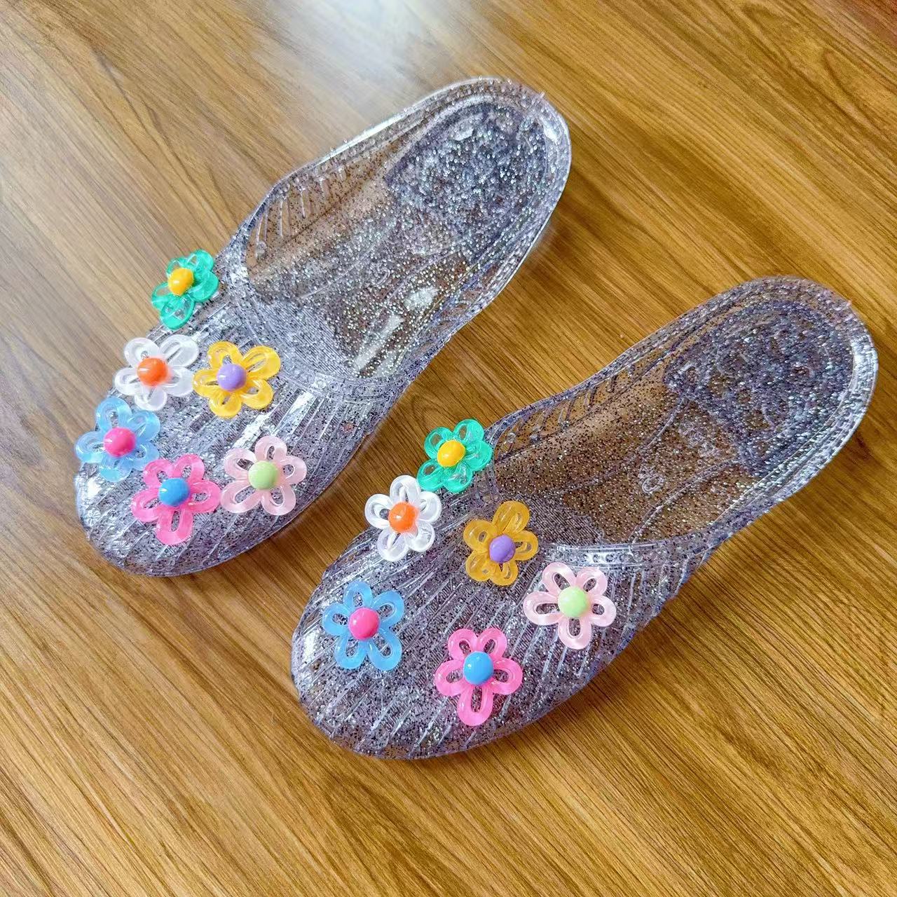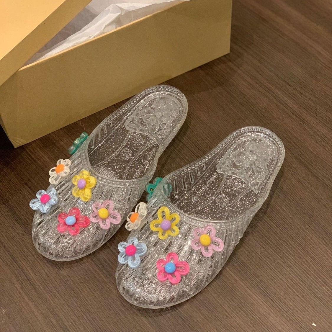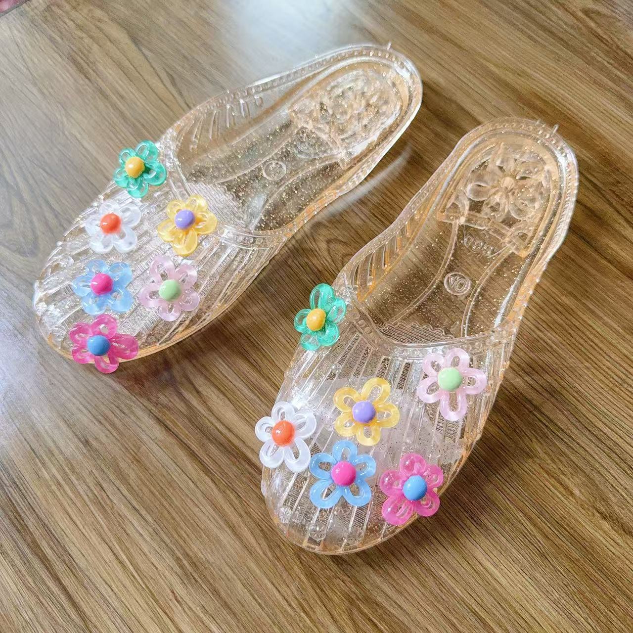 한국 젤리 슈즈 여성 슬리퍼 한국 패션 아우터 바오터우 플랫 바오터우 슈즈 투명 슈즈 꽃 액세서리 비치 슈즈스토어 가기