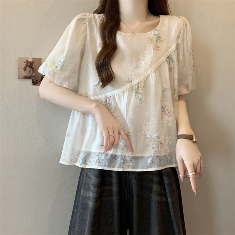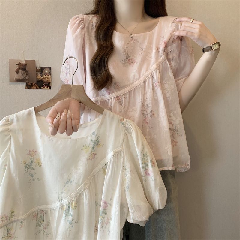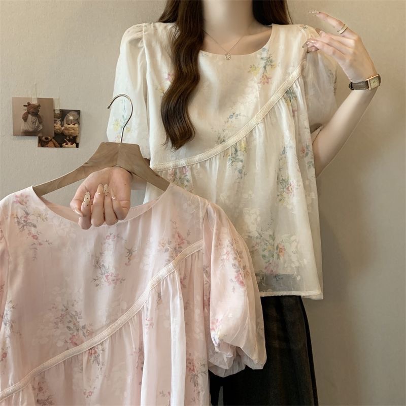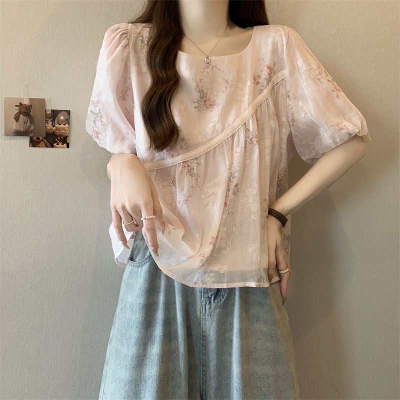 핑크 꽃 무늬 퍼프 슬리브 쉬폰 셔츠 여성 여름 신작 대형 지방 mm 루즈 배 커버 인형 셔츠 스퀘어 넥 탑스토어 가기