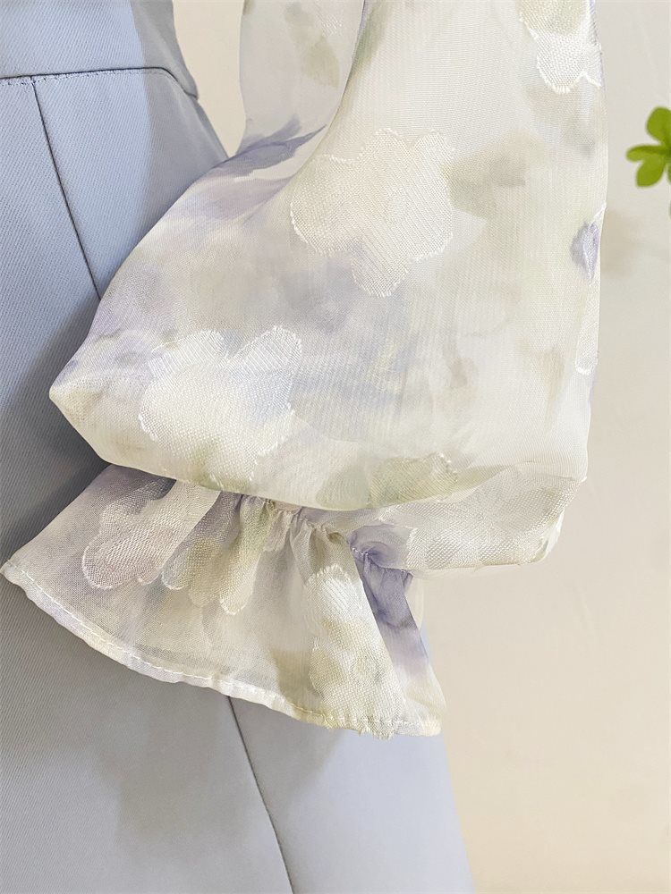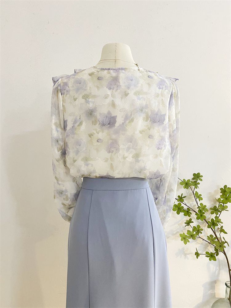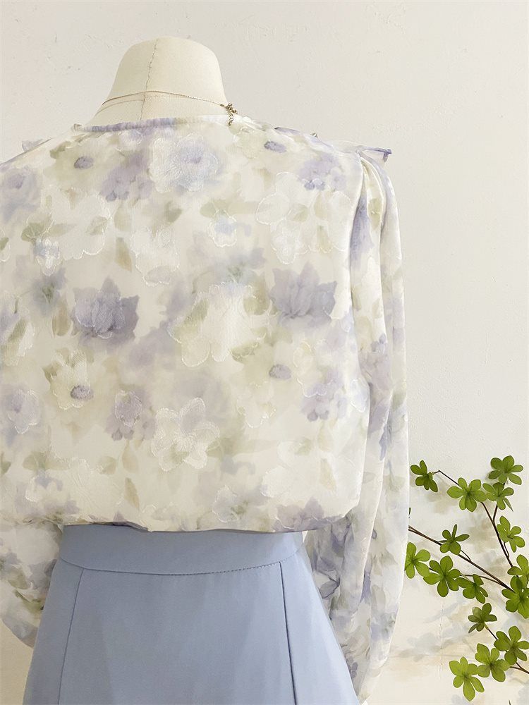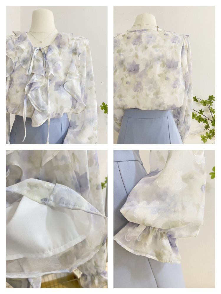여성을위한 프랑스 로맨틱 프릴 꽃 쉬폰 셔츠 봄 디자인 레이스 업 v 넥 프린트 긴팔 셔츠 탑스토어 가기