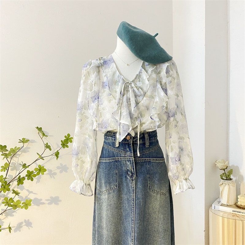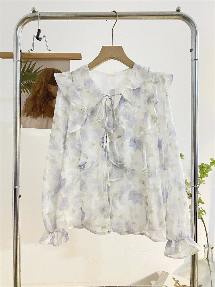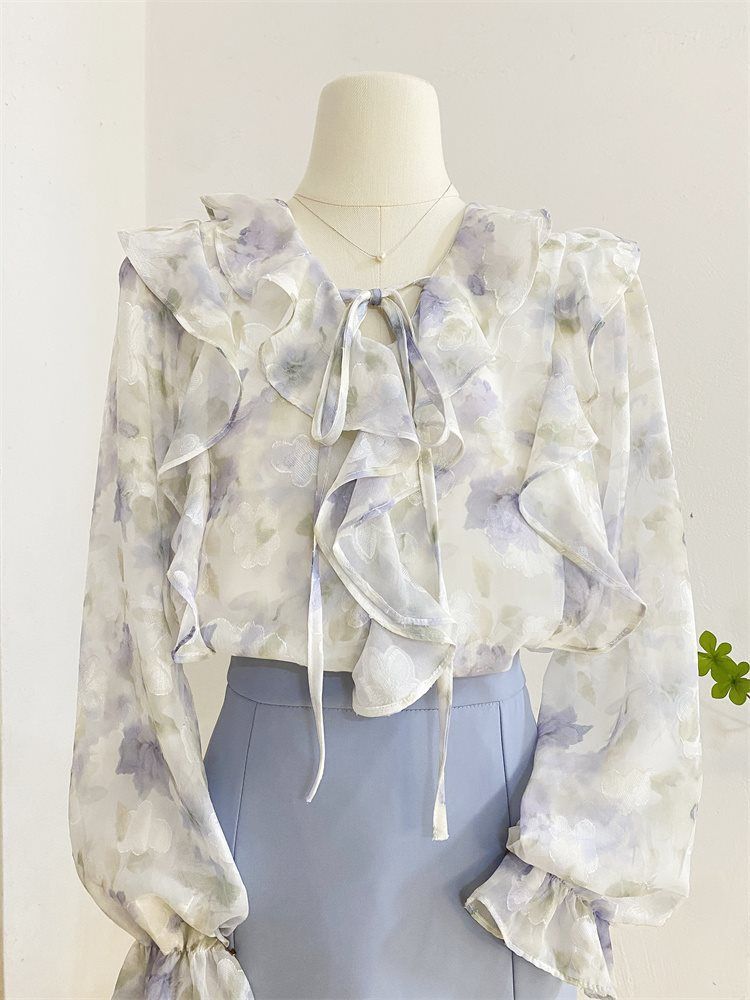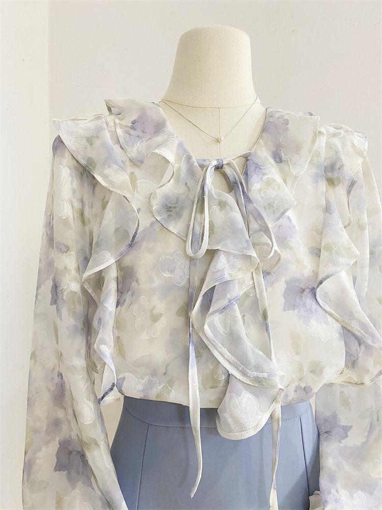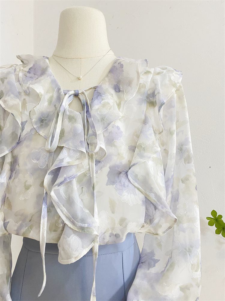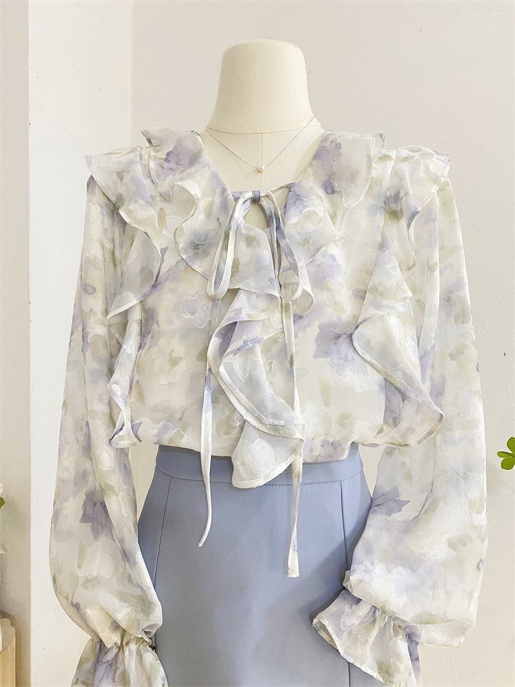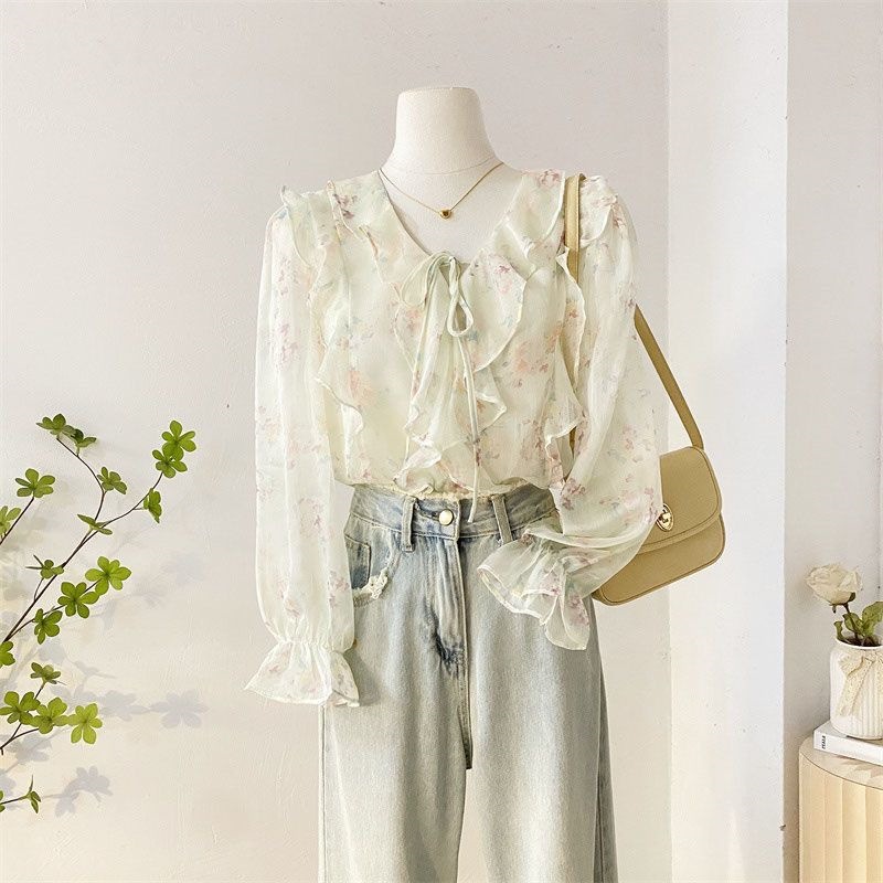여성을위한 프랑스 로맨틱 프릴 꽃 쉬폰 셔츠 봄 디자인 레이스 업 v 넥 프린트 긴팔 셔츠 탑