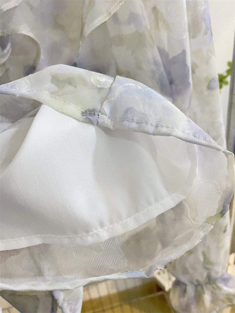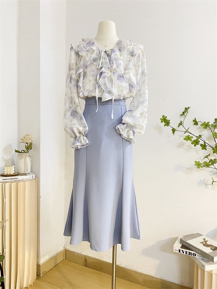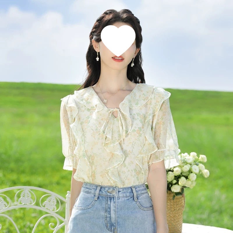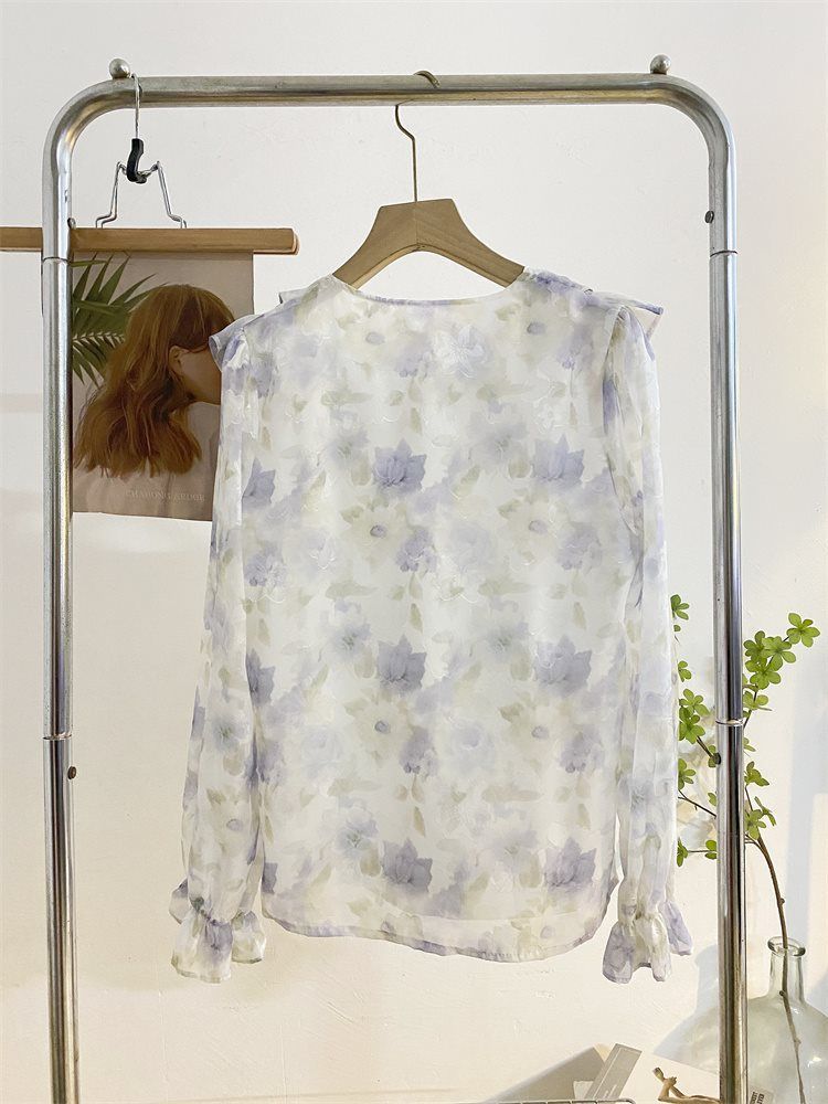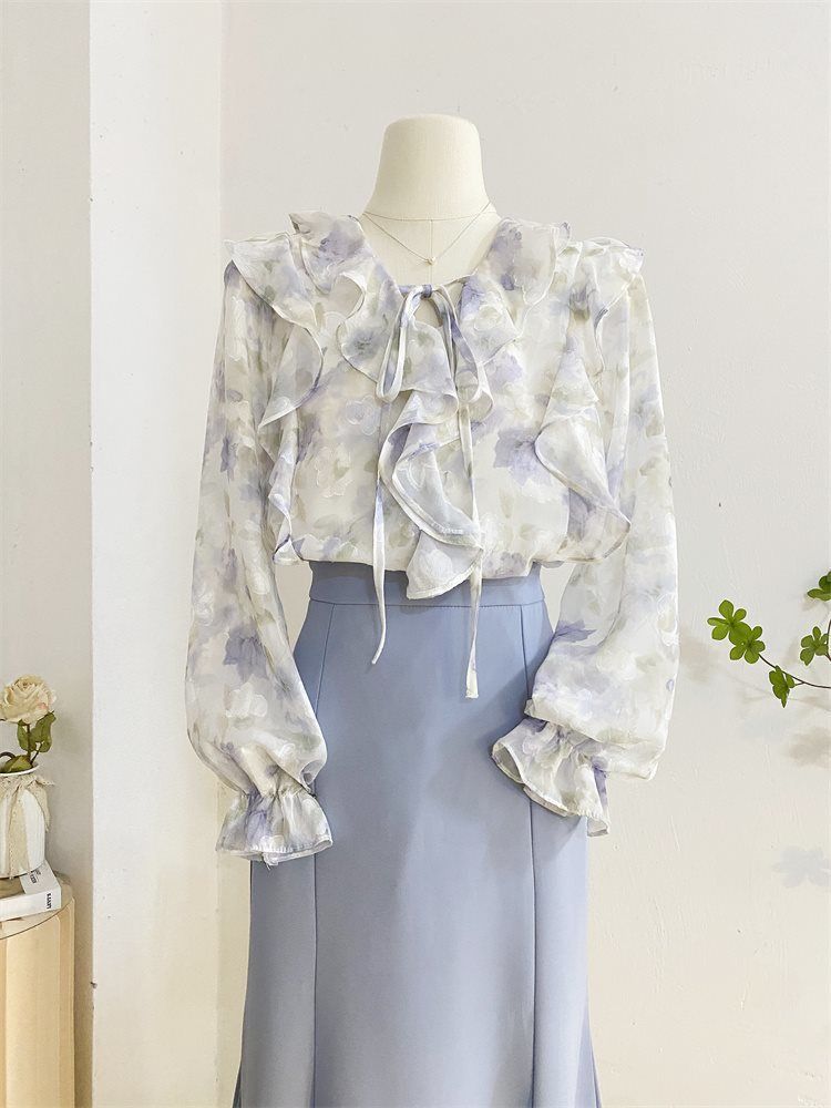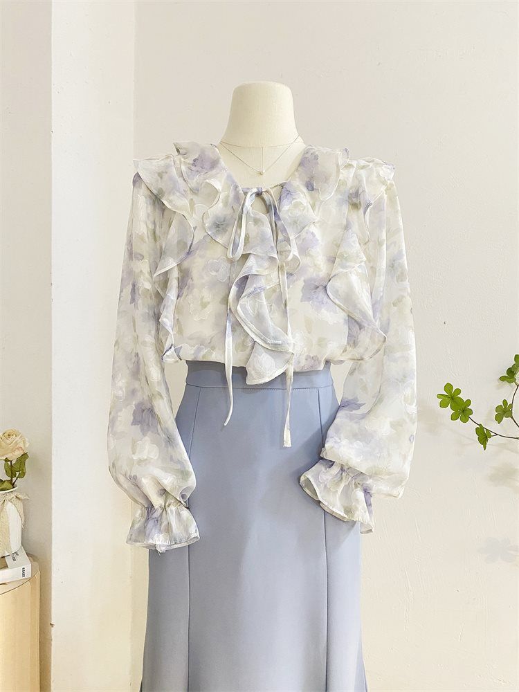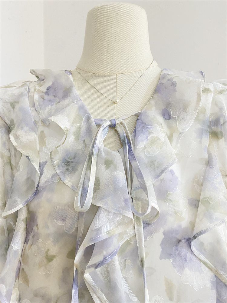 여성을위한 프랑스 로맨틱 프릴 꽃 쉬폰 셔츠 봄 디자인 레이스 업 v 넥 프린트 긴팔 셔츠 탑