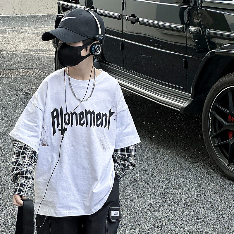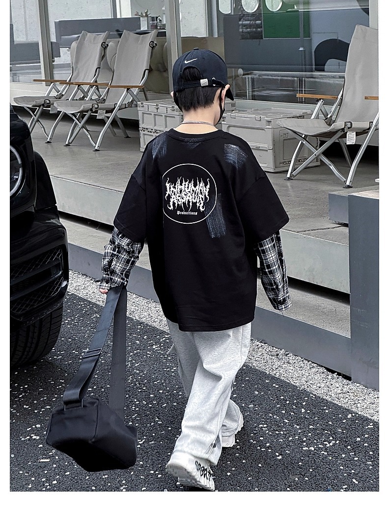 아동용 가짜 투피스 티셔츠 봄, 가을 소년 긴팔 라운드 넥 셔츠 소년 가을 멋진 스트리트 댄스 탑