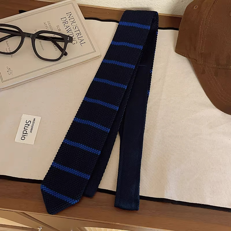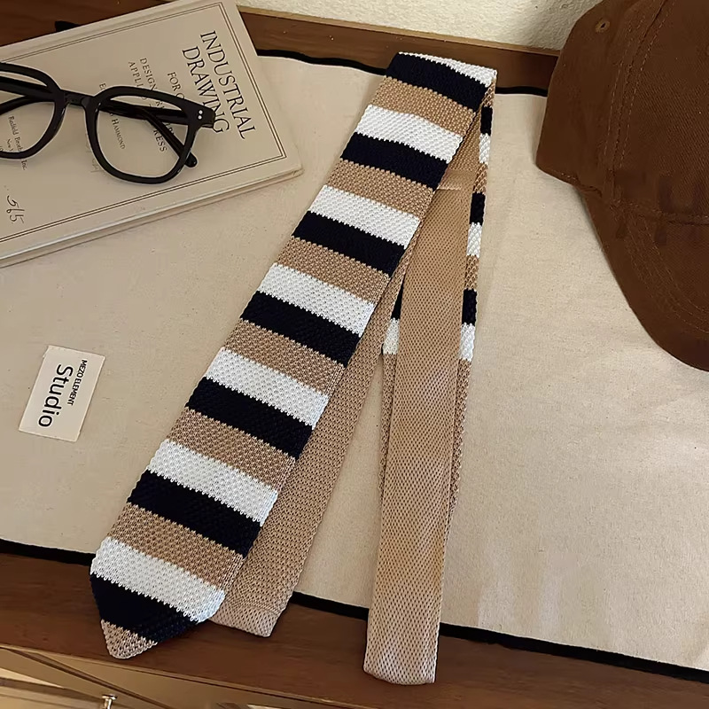 • 니트 카키색 바탕에 파란색과 흰색 줄무늬 넥타이