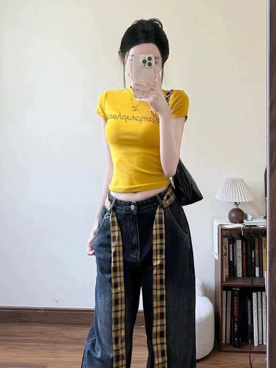 • 블랙과 옐로우 컬러의 패치워크 패브릭 체크무늬 벨트-136CM