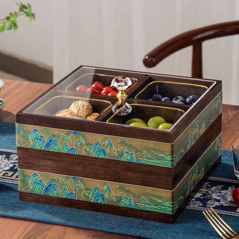 • Qianli Jiangshan 4칸 단층 과일 상자 + 금테 사각 그릇 4개
