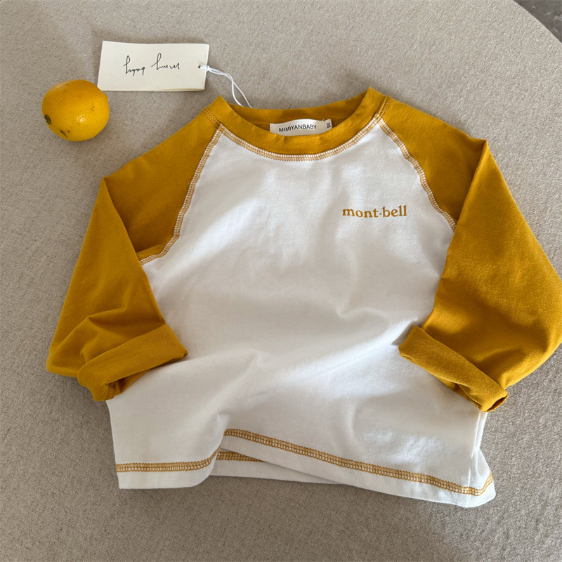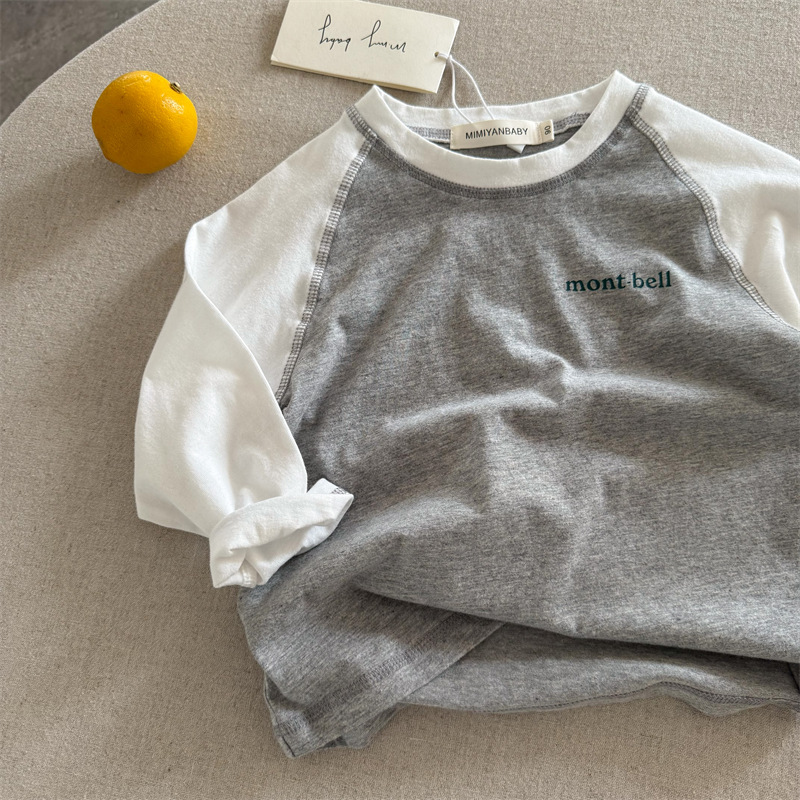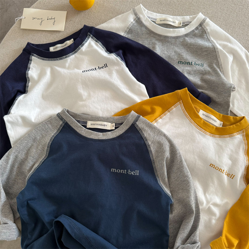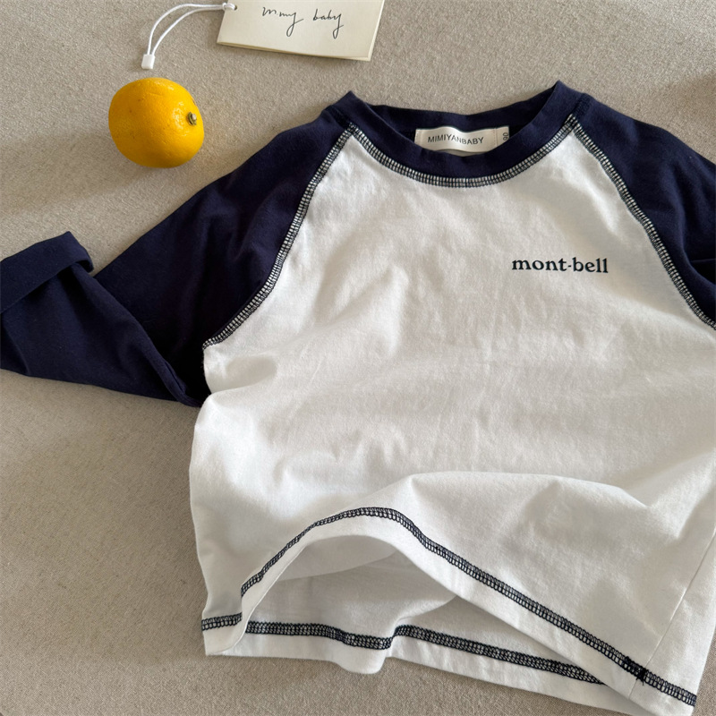 어린이 긴팔 T2025 가을 새로운 스타일 소년과 소녀를위한 대비 색상 긴팔 T 베이비 레터 스플 라이스 티셔츠 유행스토어 가기