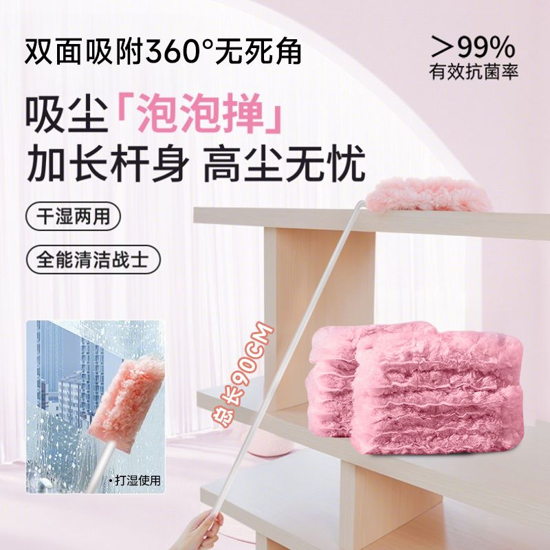 • 90cm 텔레스코픽 접이식 긴 폴 + 양면 먼지떨이 핑크 2개 - 매직 버블 먼지떨이 세탁 가능하고 정전기 방지 푹신함