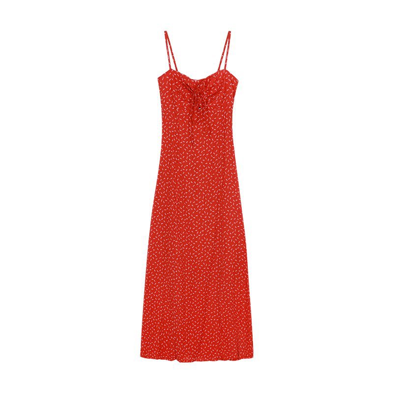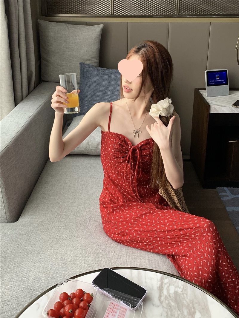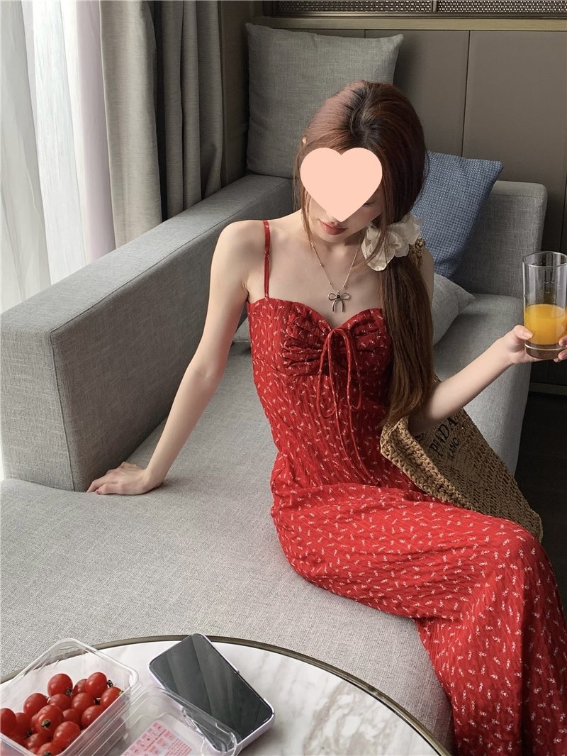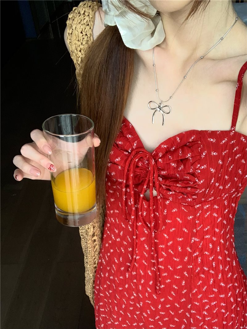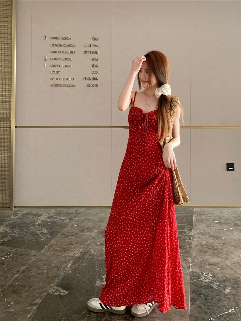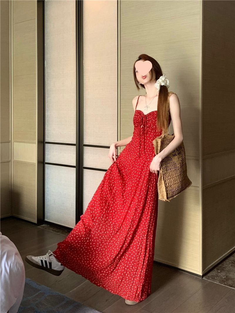 레트로 꽃무늬 스커트 레드 드레스 여성 여름 핫 소녀 a 라인 스커트 서스펜더 스커트 리조트 스타일 해변 롱 스커트