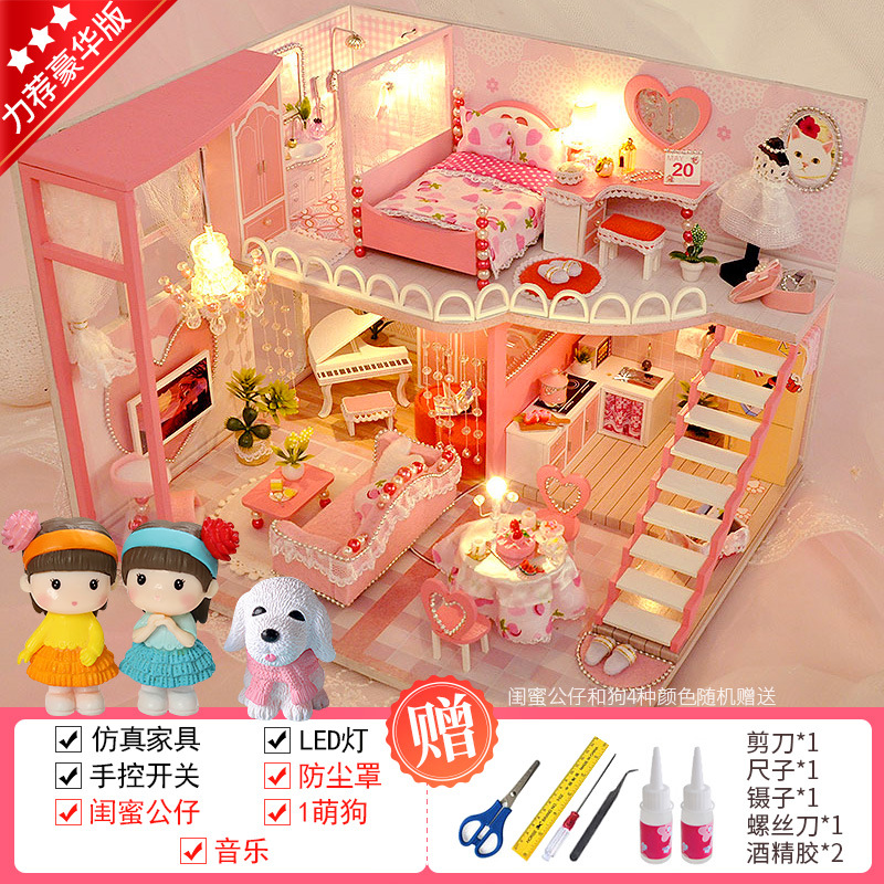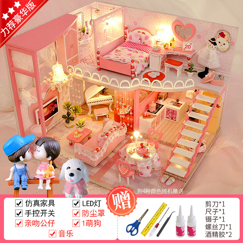 • Sweetheart Dream Loft + 먼지 커버 + 도구 접착제 + 음악 + 여자 친구 인형 + 개 + LED 조명