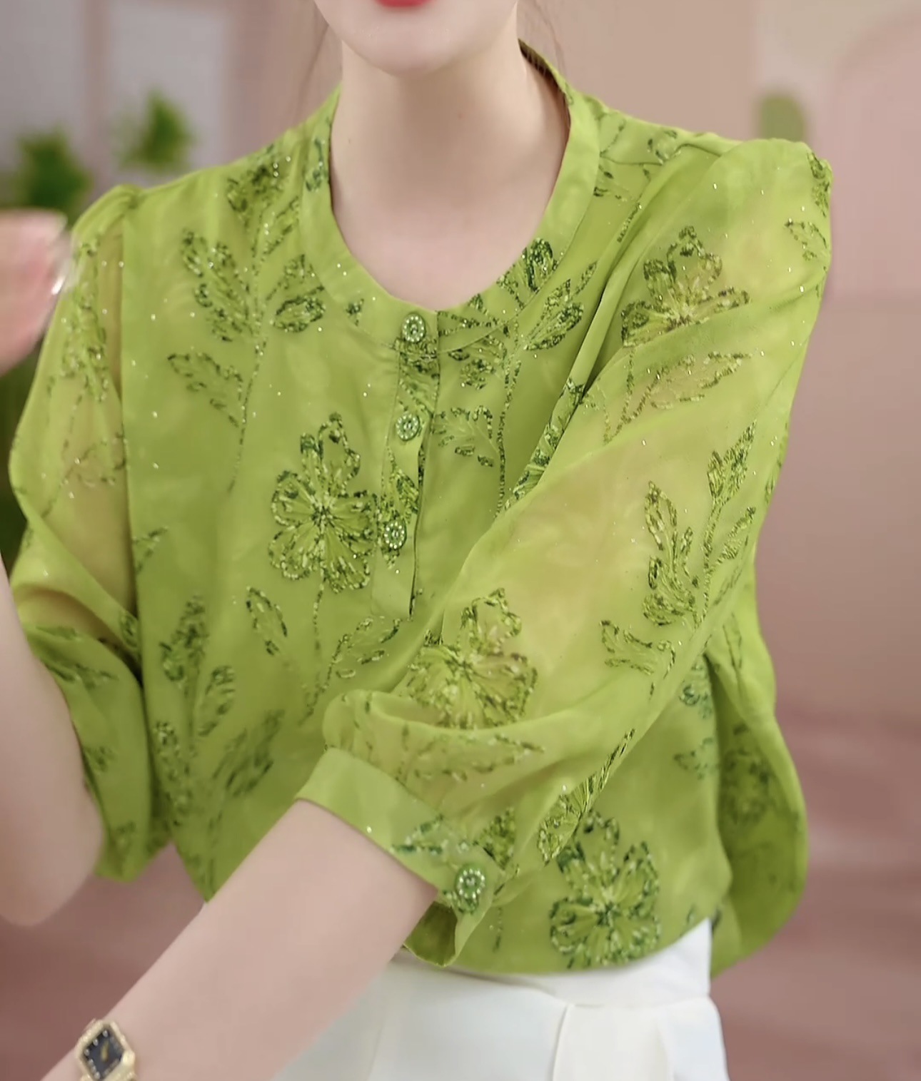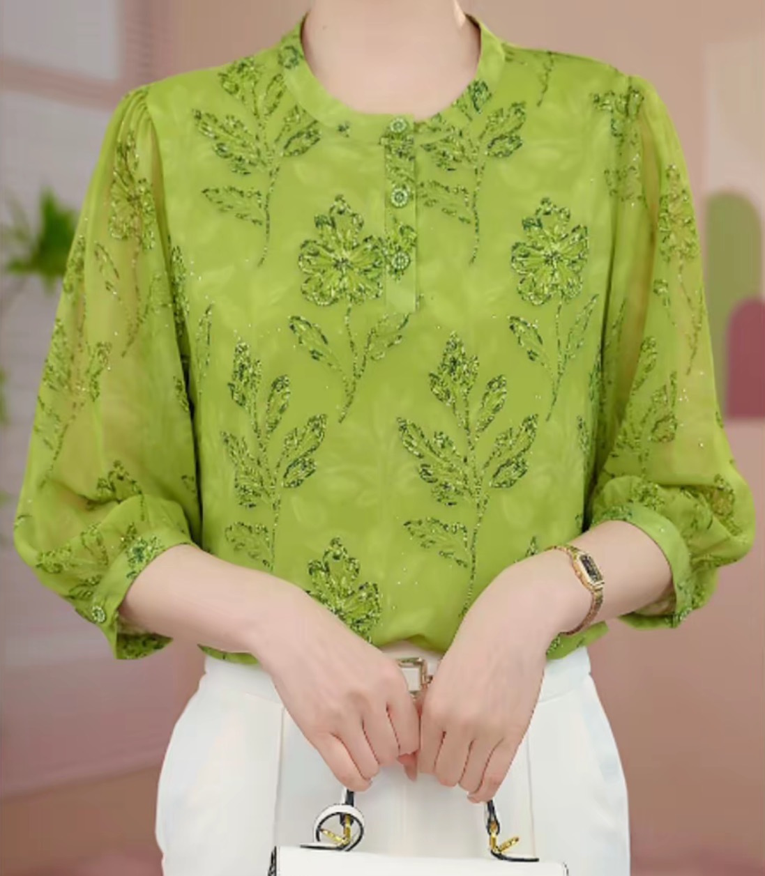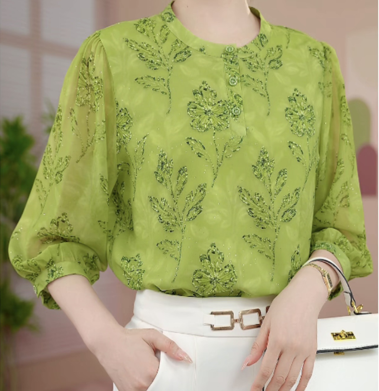 여성을 위한 가벼운 고급 쉬폰 셔츠 2025 새로운 여름 고급 중년 어머니의 나이를 줄여주는 스타일리시한 셔츠 슬리밍 탑스토어 가기