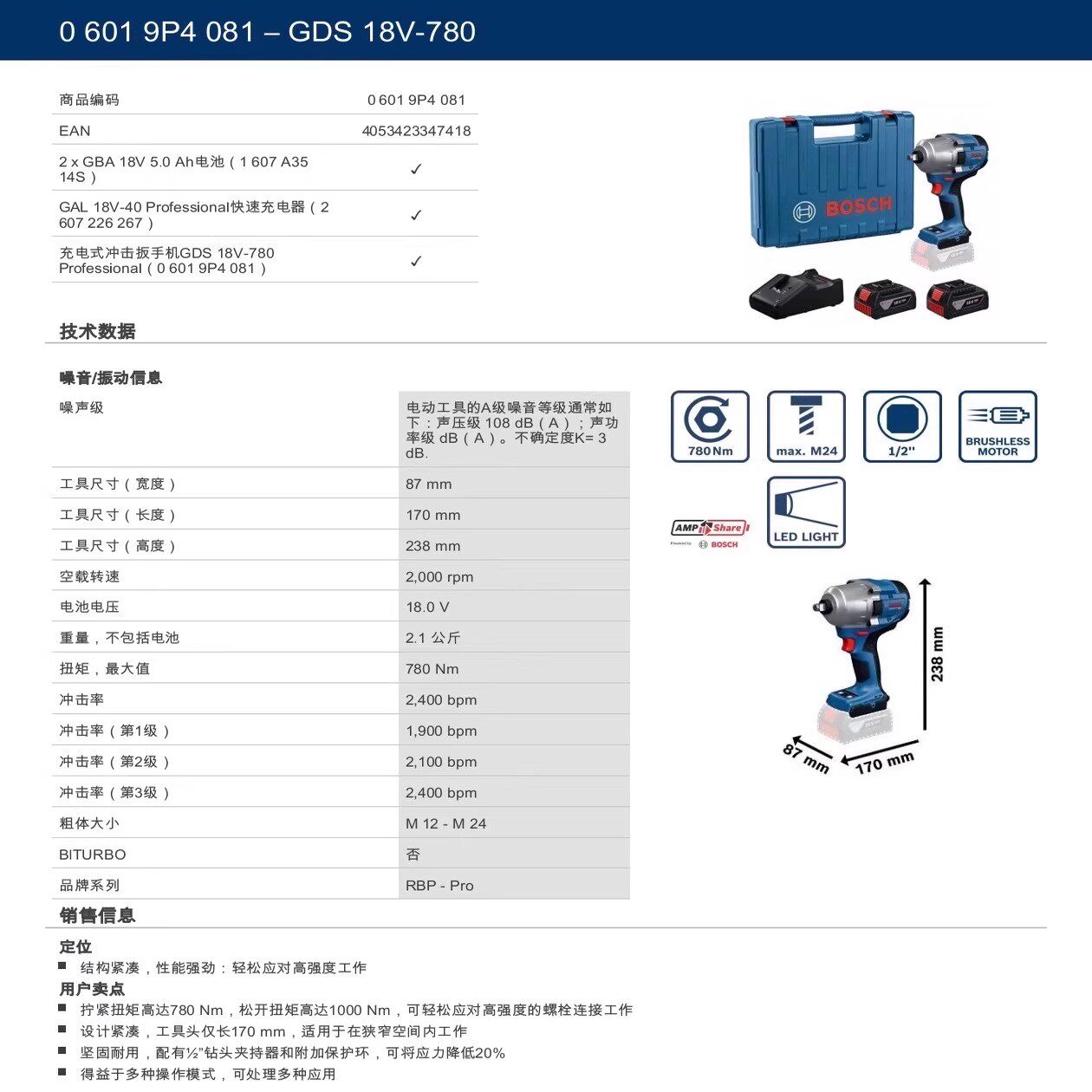 BOSCH Bosch GDS18V-780 브러시리스 충전식 렌치 소켓 렌치 전기 임팩트 렌치 전기 렌치