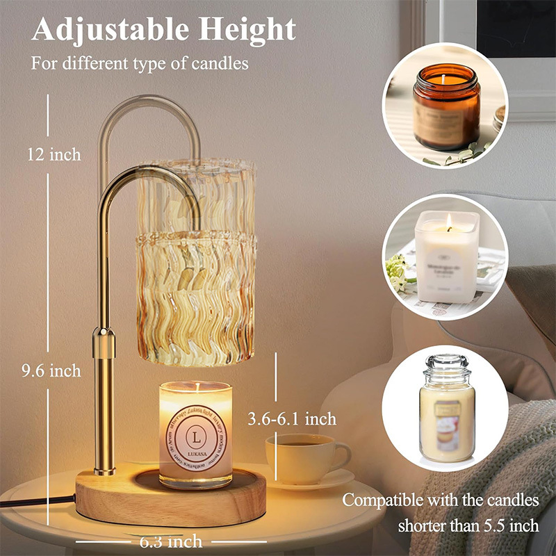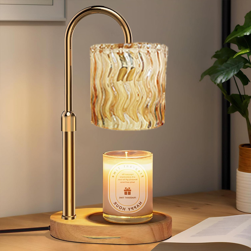 • 호박색 직선 물결무늬 갓 + 금색 램프 기둥 + 타원형 목재 색상 베이스