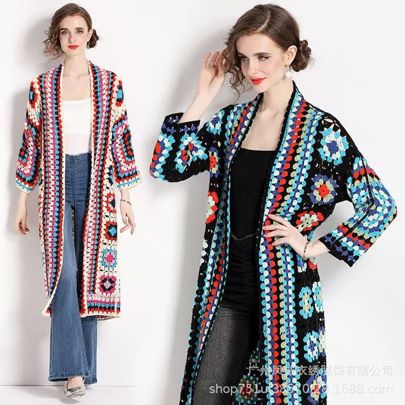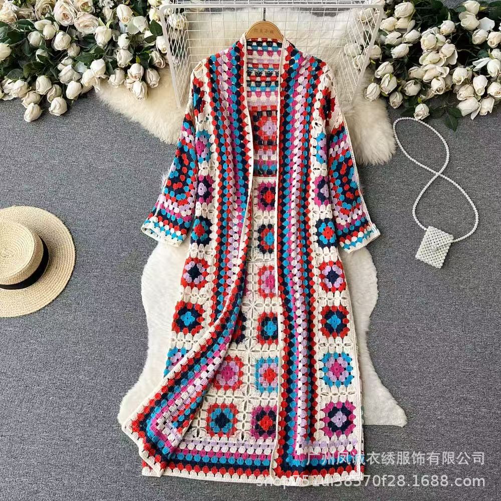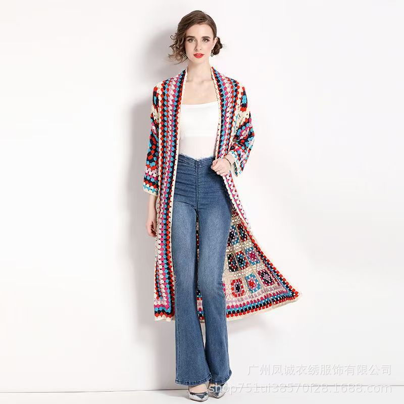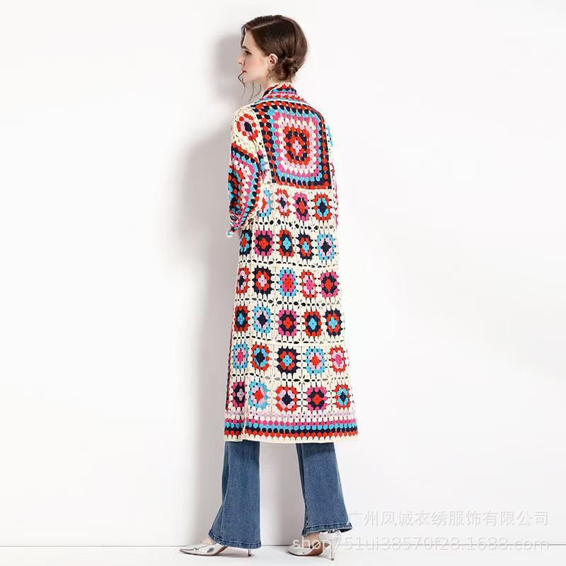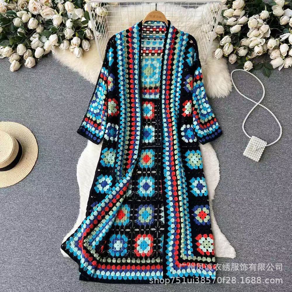 보헤미안 리조트 스타일 크로셰 컬러 블록 체크 무늬 니트 재킷 여성 가을, 겨울 루즈한 중간 길이 숄 카디건 탑