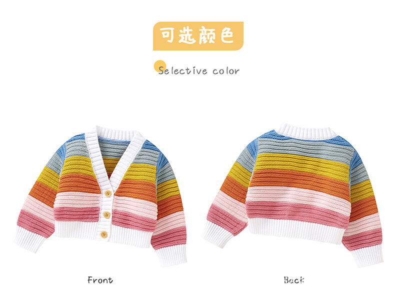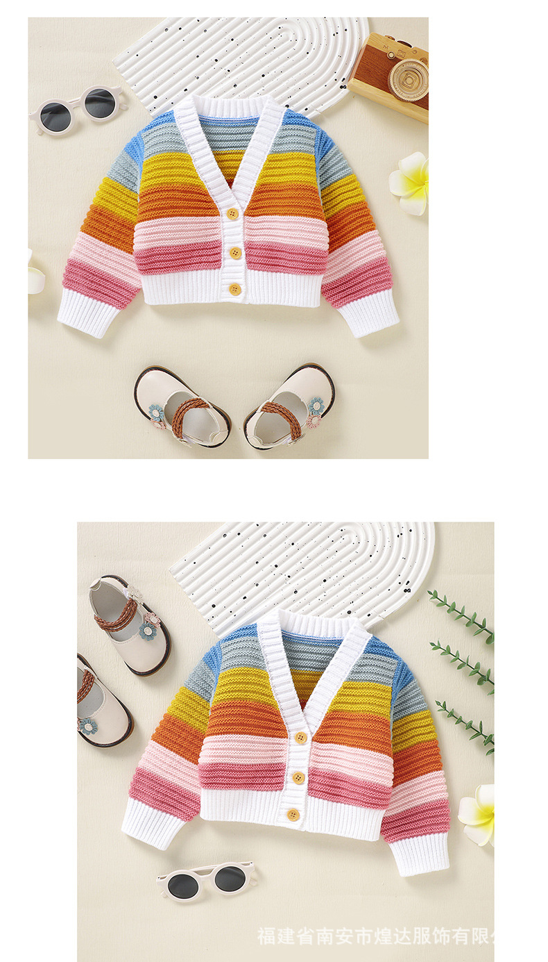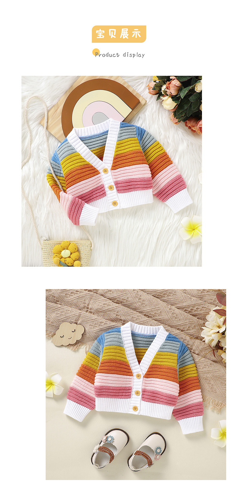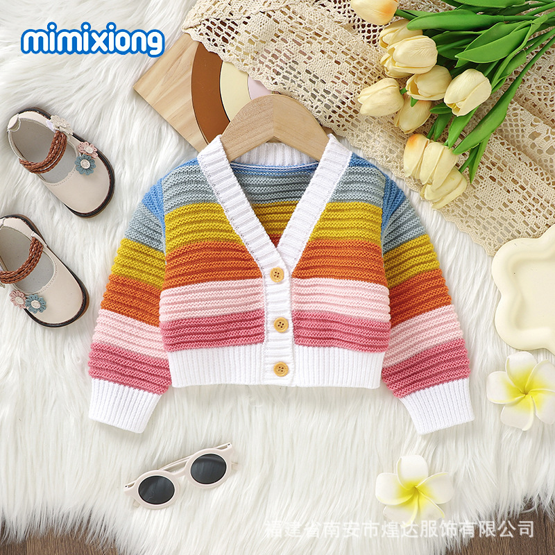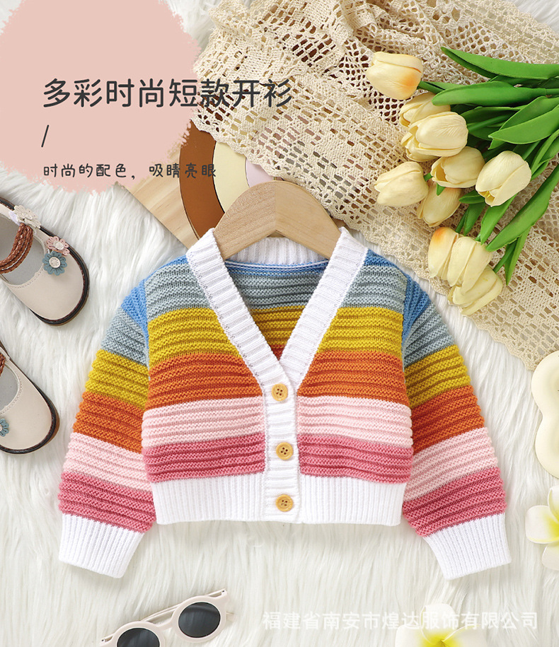 Ins 뜨거운 판매 가을, 겨울 새로운 유아 니트 무지개 줄무늬 짧은 코트 아기 소녀 따뜻한 방풍 카디건
