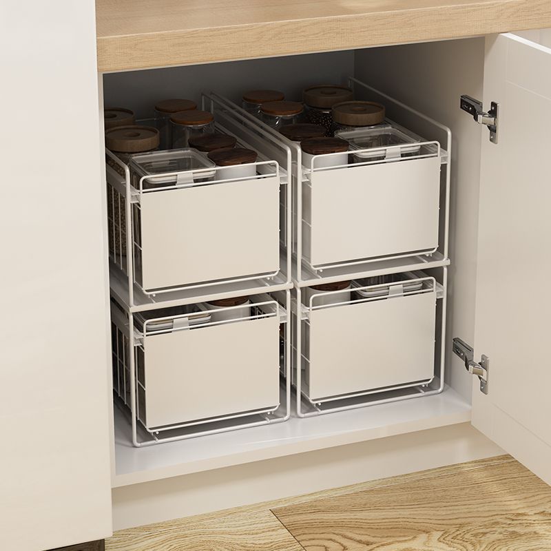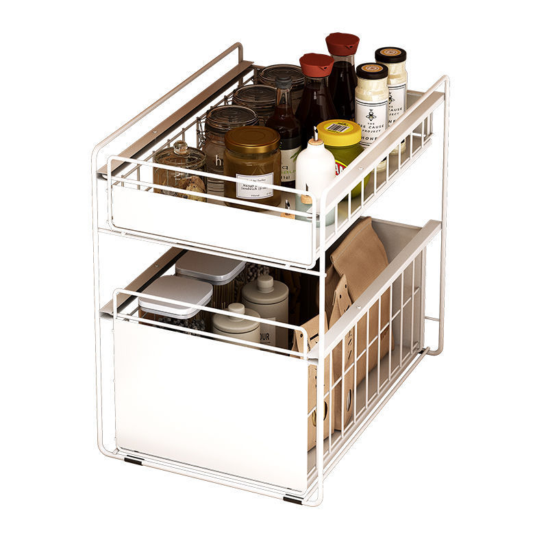설치가 필요 없는 주방용 풀아웃 수납선반, 싱크대 아래 2단 수납선반, 캐비닛 전체에 작은 수납선반을 레이어드 ZM스토어 가기