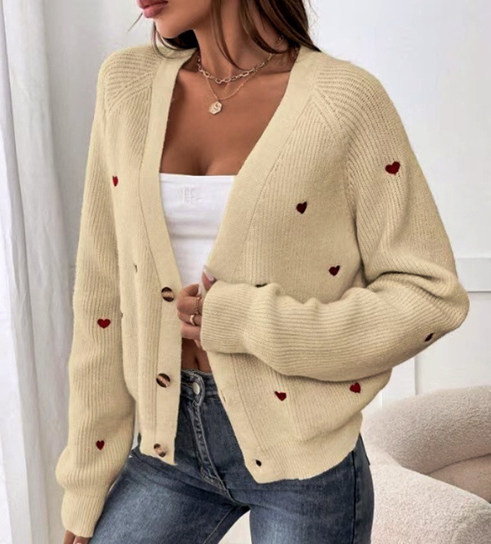 국경 간 대외 무역 아마존 사랑 자수 스웨터 재킷 유럽과 미국의 가을, 겨울 싱글 브레스트 v 넥 스웨터 카디건 여성용