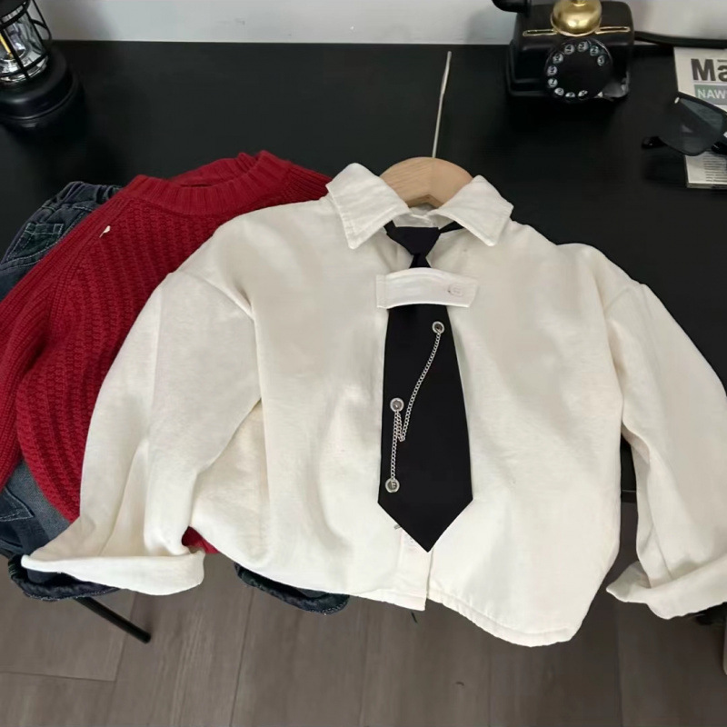 넥타이가 포함된 남아용 겨울 벨벳 셔츠, 트렌디하고 멋진 아동용 따뜻한 베이스 셔츠, 대학 스타일 남아용 한국식 상성롱스토어 가기