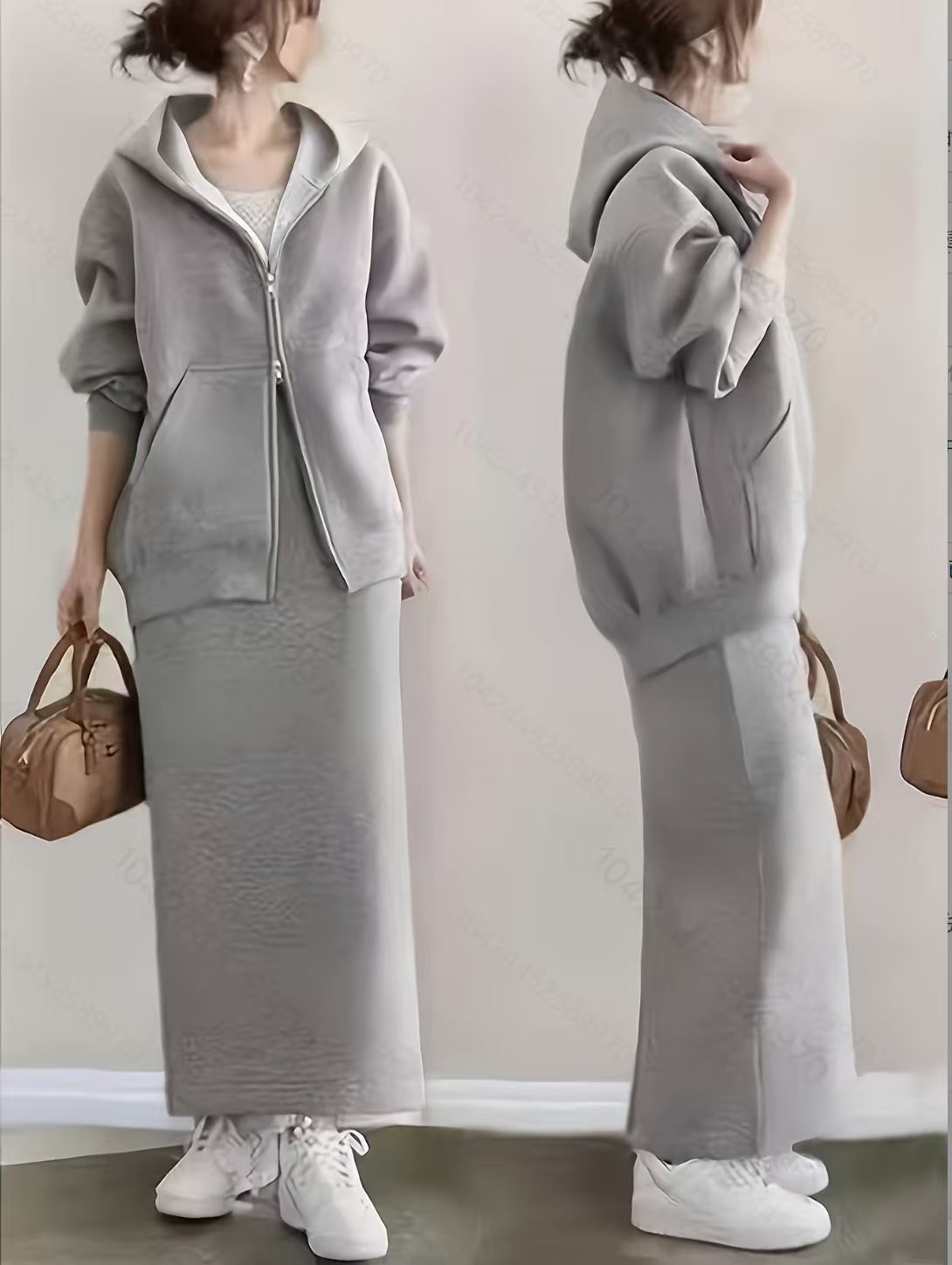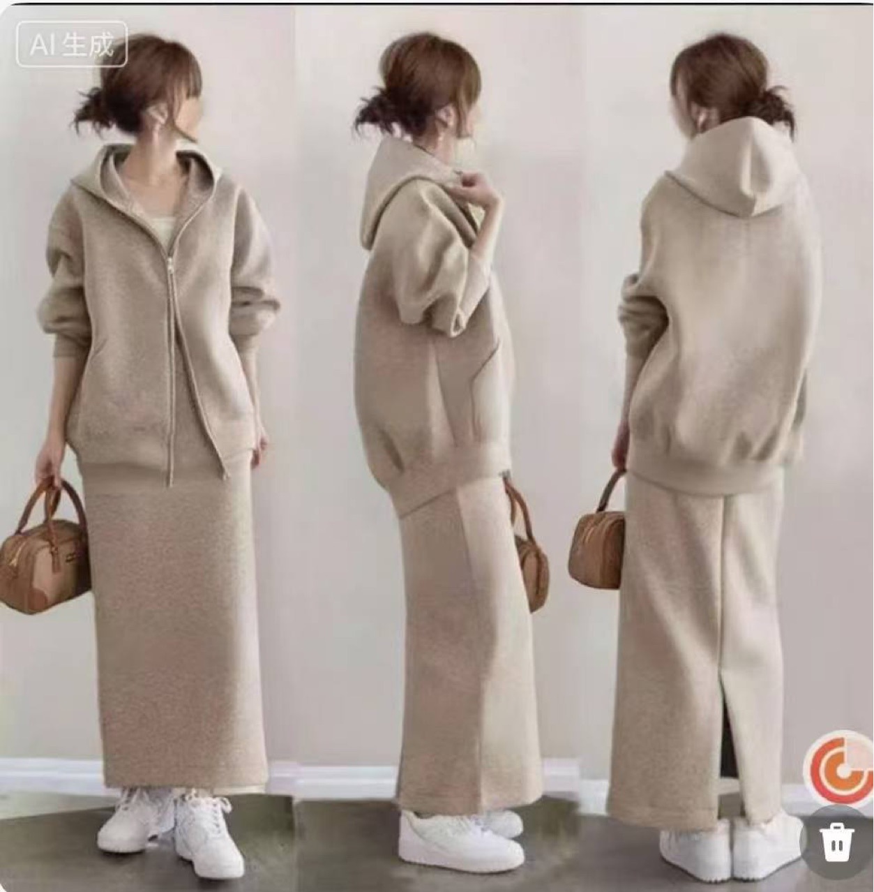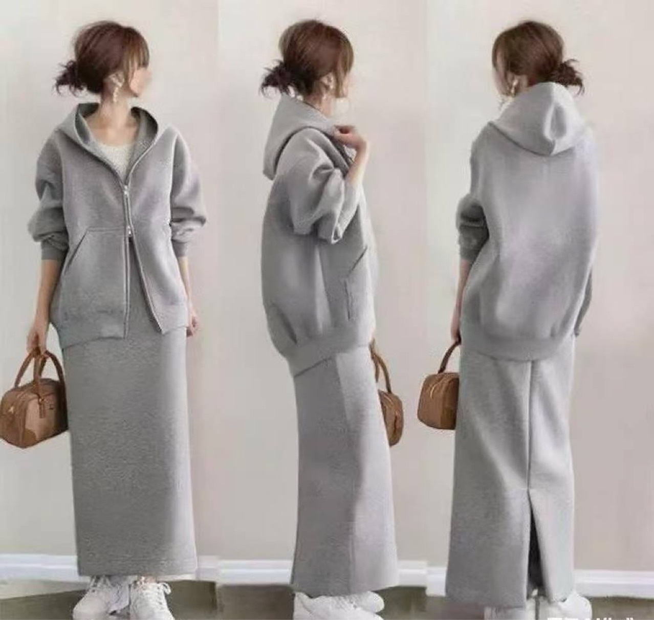 가을 겨울 여성용 스웨트셔츠 세트, 루즈핏 질감 패턴 코트, 가디건, 후드탑 + 슬릿 스커트 투피스 세트스토어 가기