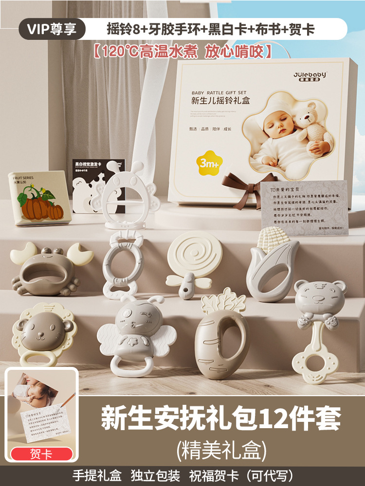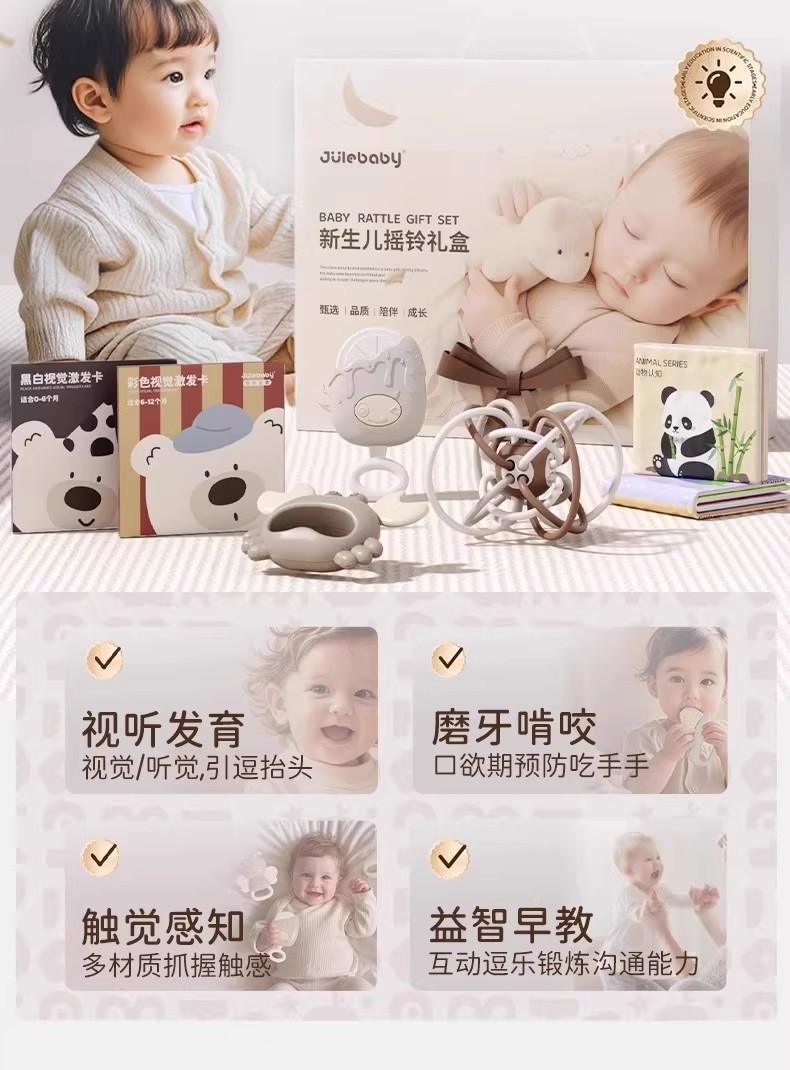• Julebaby - 신생아 진정 선물팩 12종 세트 [8개 딸랑이 + 치발기 팔찌 + 축하 카드 + 흑백 카드 + 천책] - 6256B