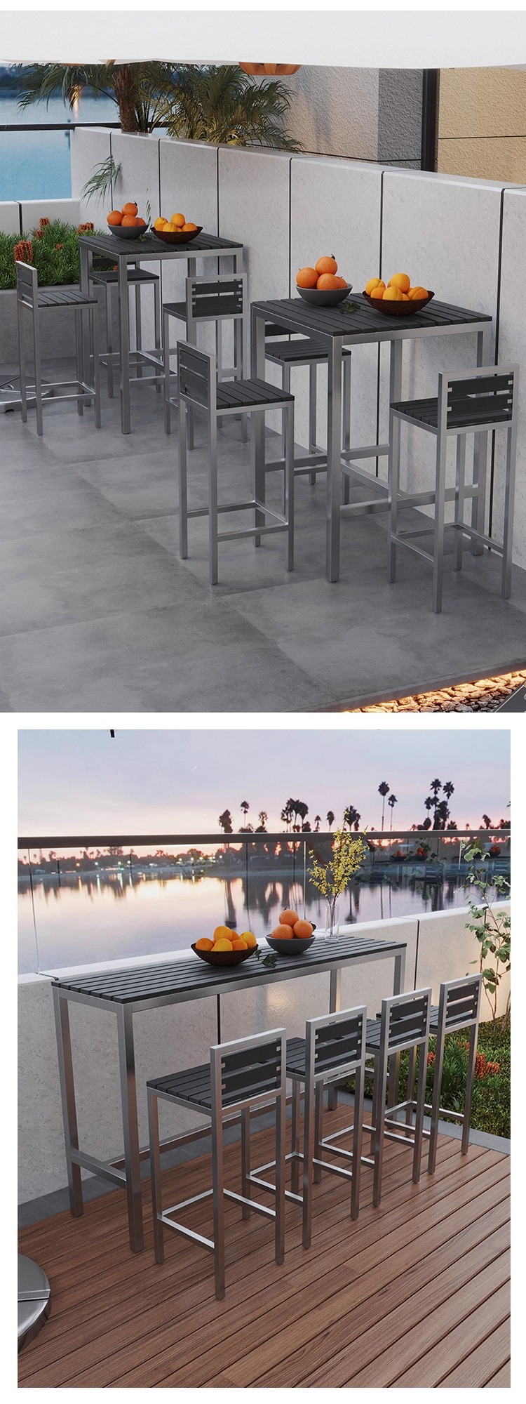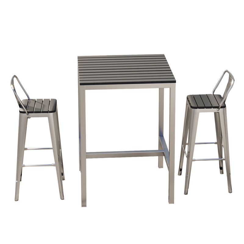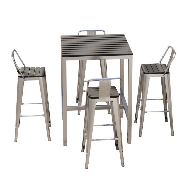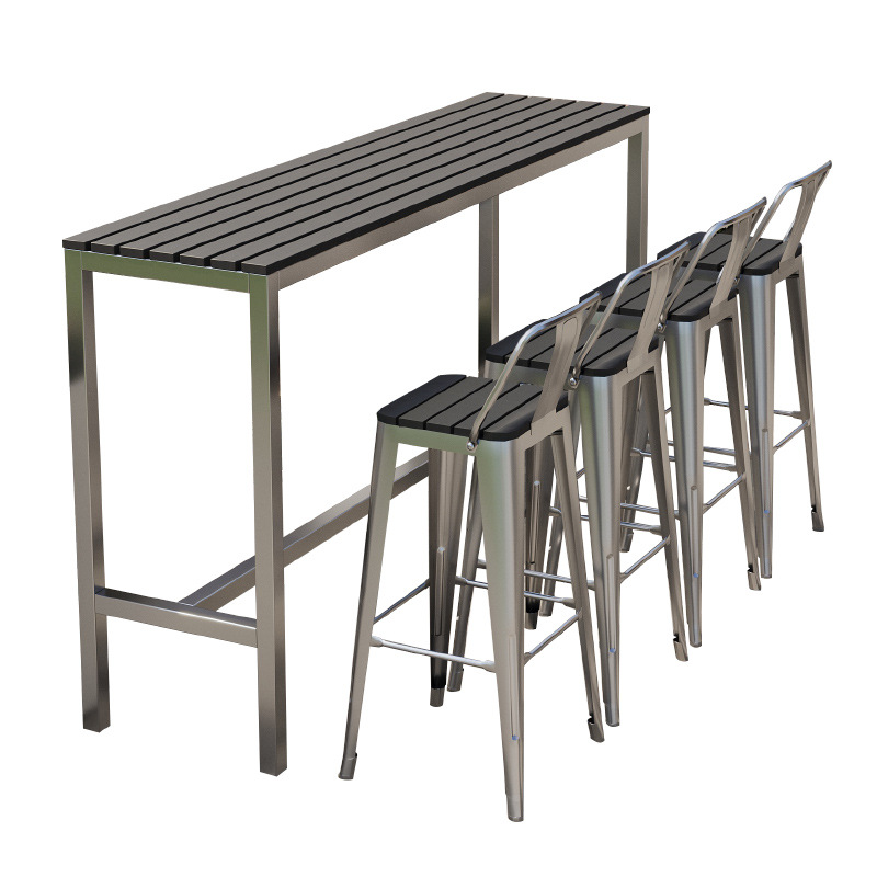 야외 플라스틱 목재 바 테이블과 의자, 야외 발코니 벽걸이형 긴 테이블 바, 야외 부식 방지 높은 바 테이블 조합