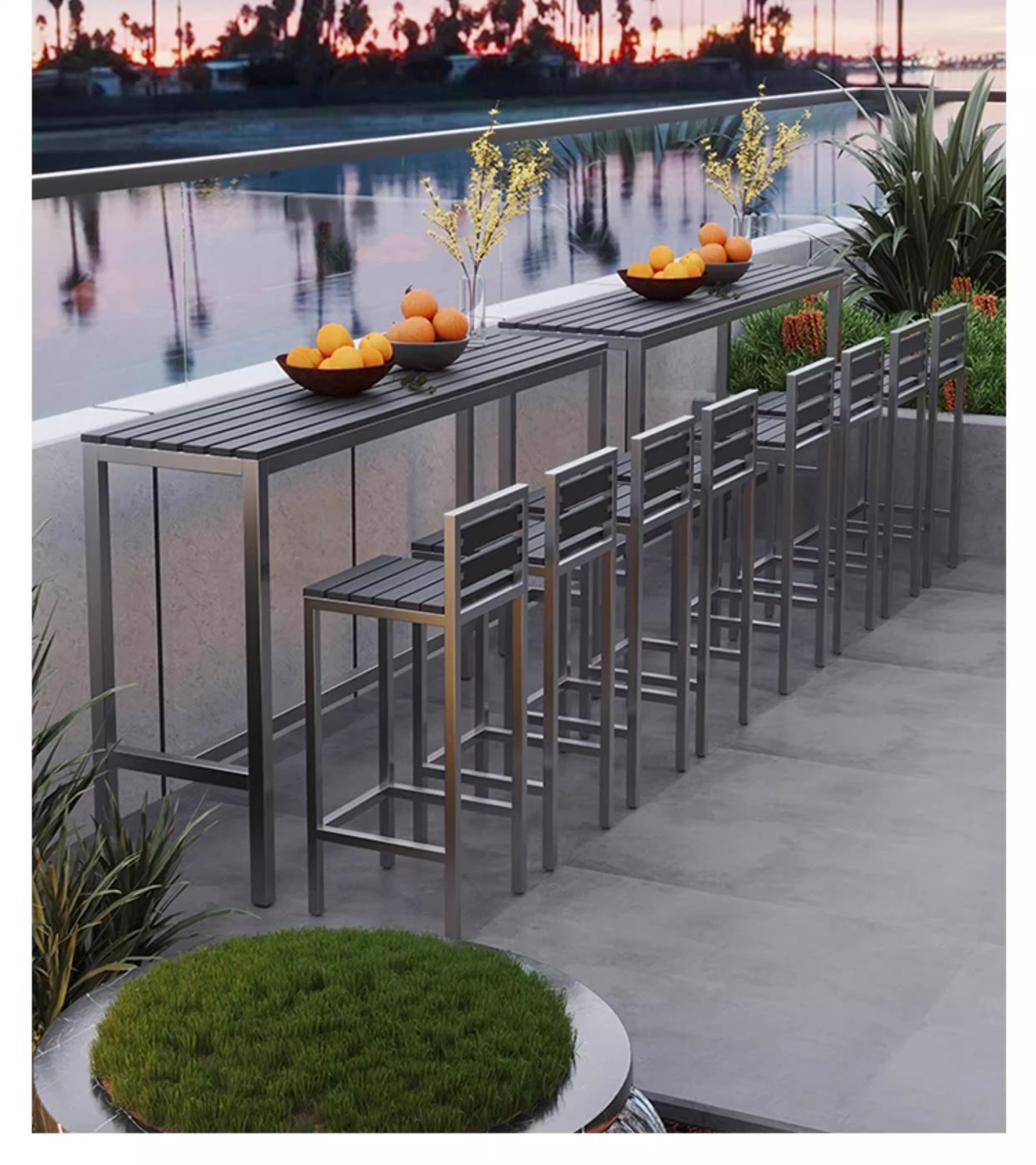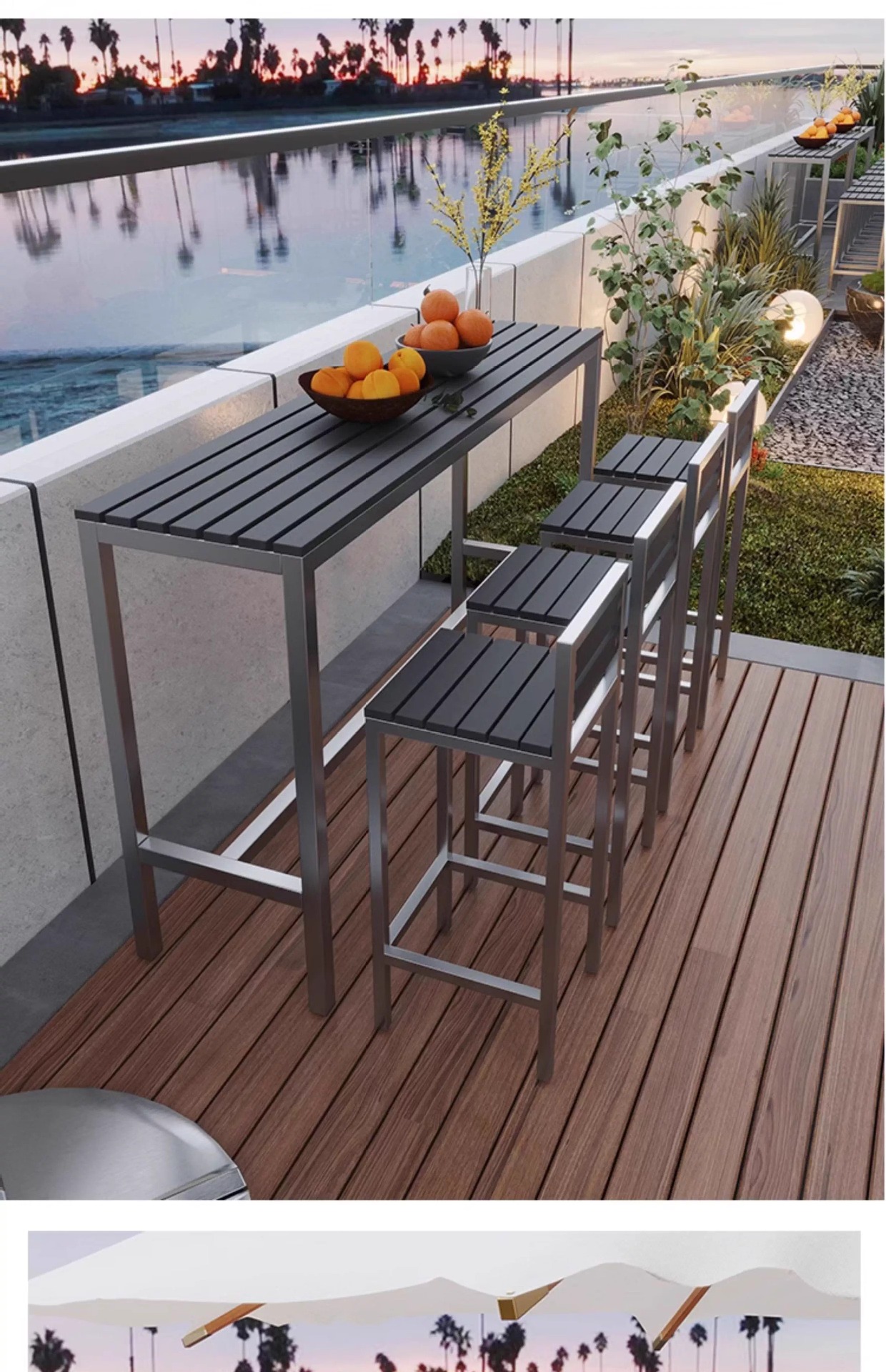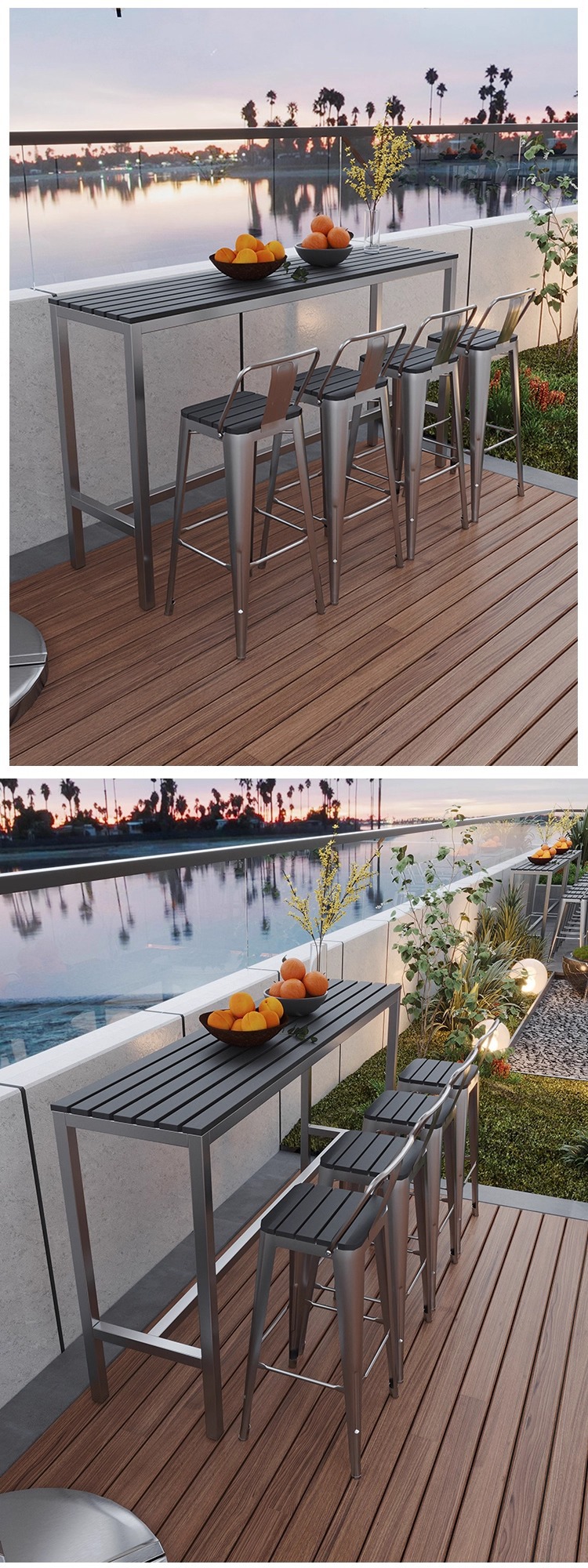 야외 플라스틱 목재 바 테이블과 의자, 야외 발코니 벽걸이형 긴 테이블 바, 야외 부식 방지 높은 바 테이블 조합