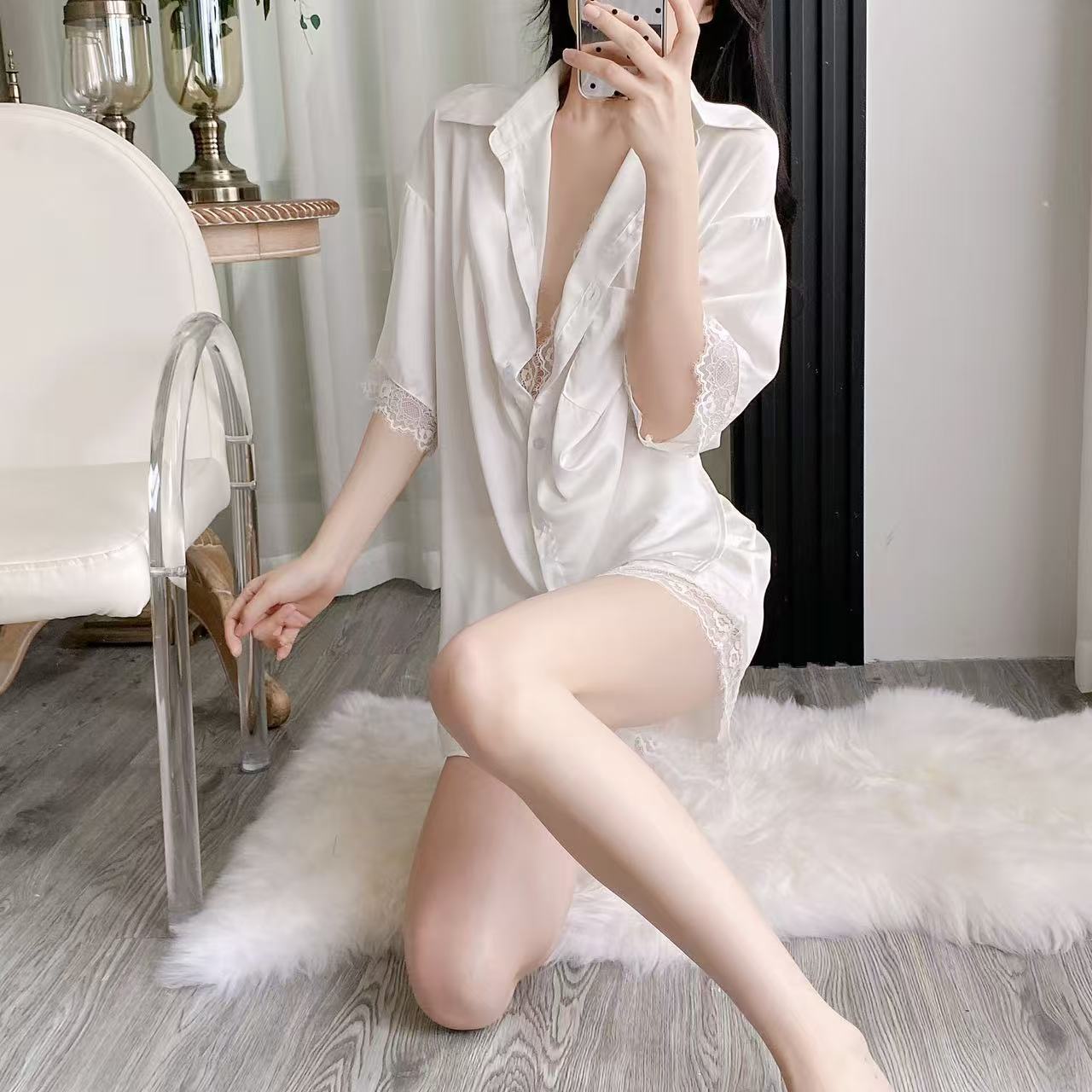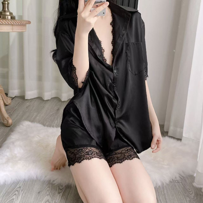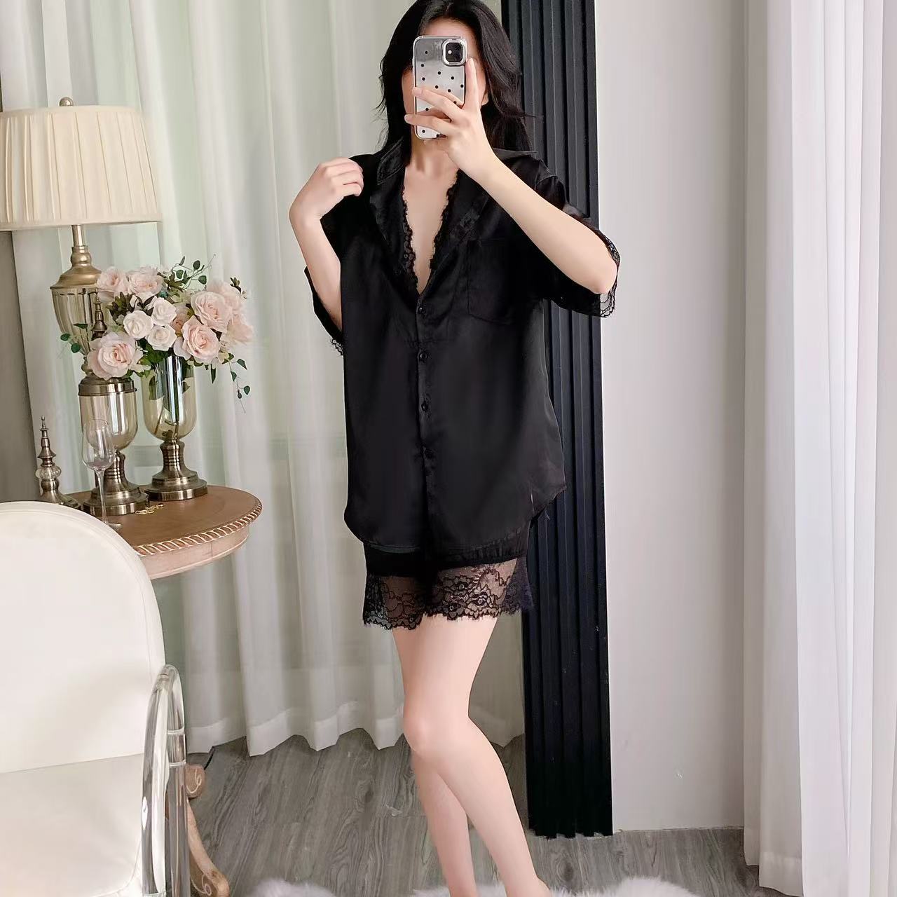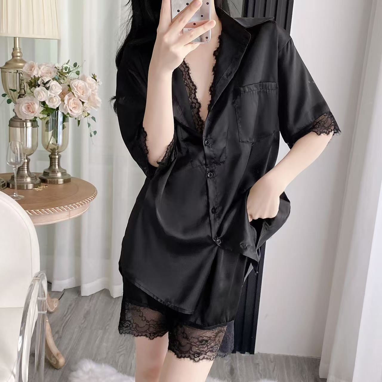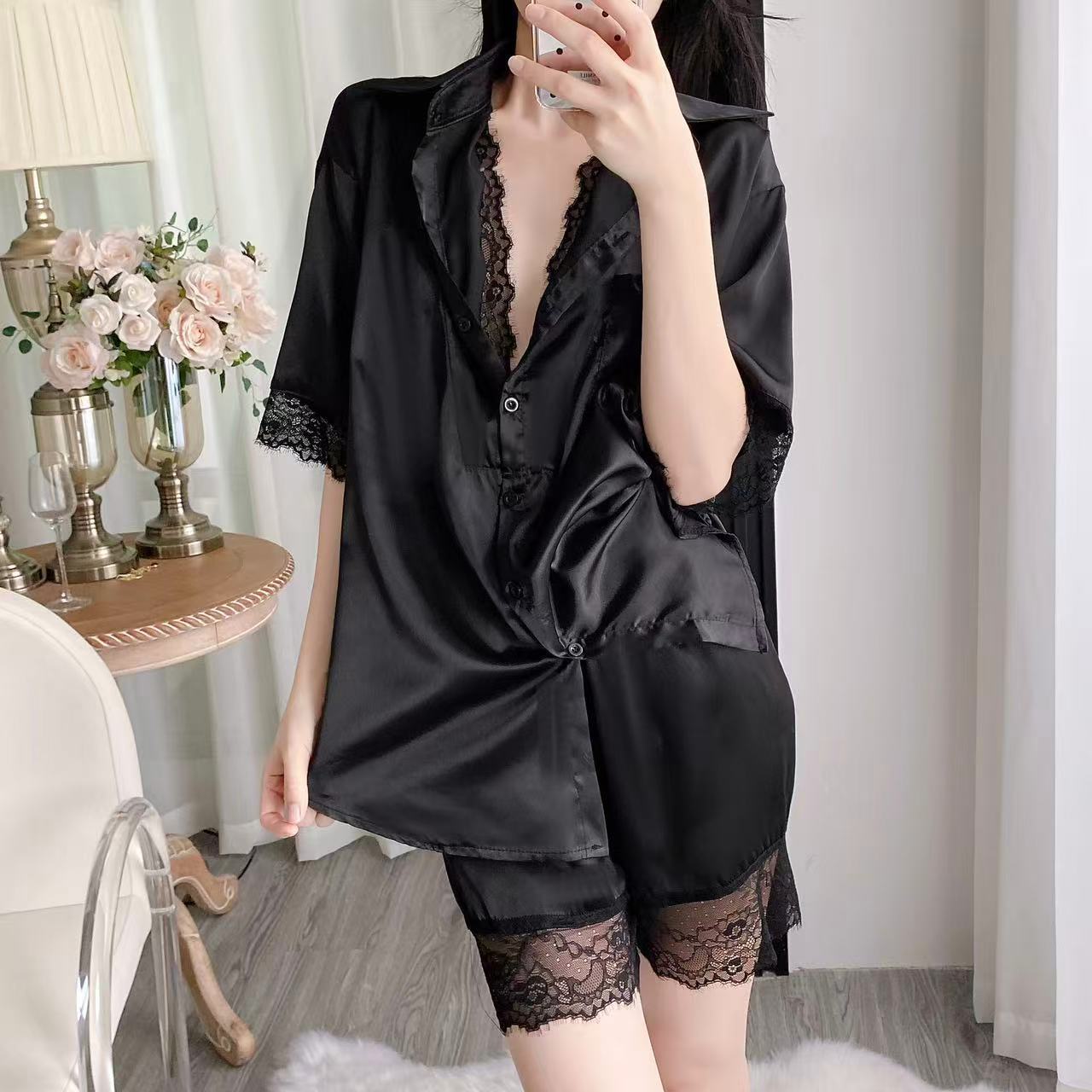 레이스 섹시한 얼음 실크 얇은 반팔 검은 셔츠 스타일 잠옷 2025 새로운 성인 잠옷 남자 친구 스타일 홈웨어스토어 가기