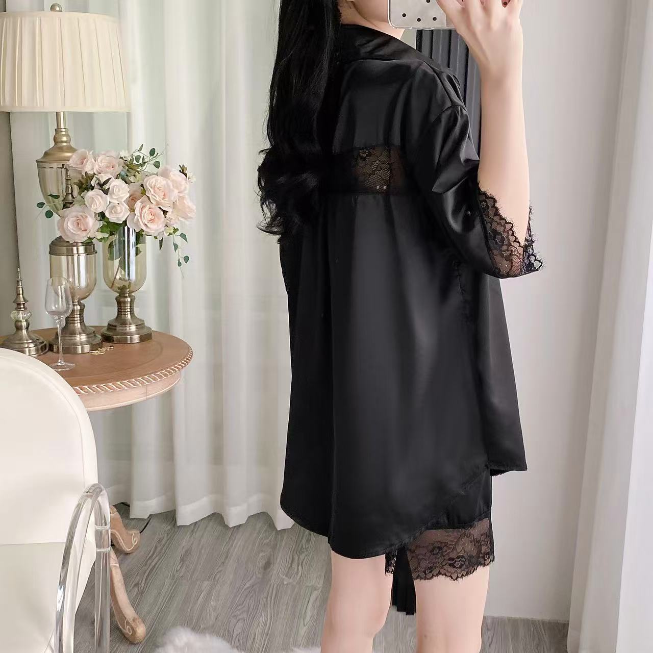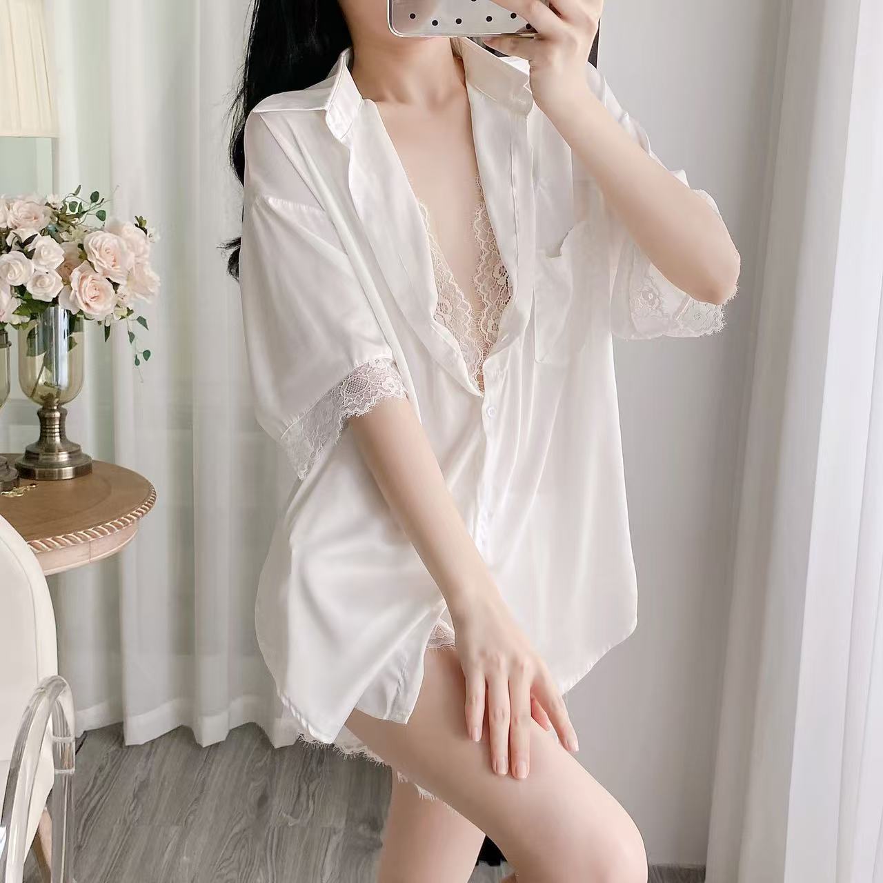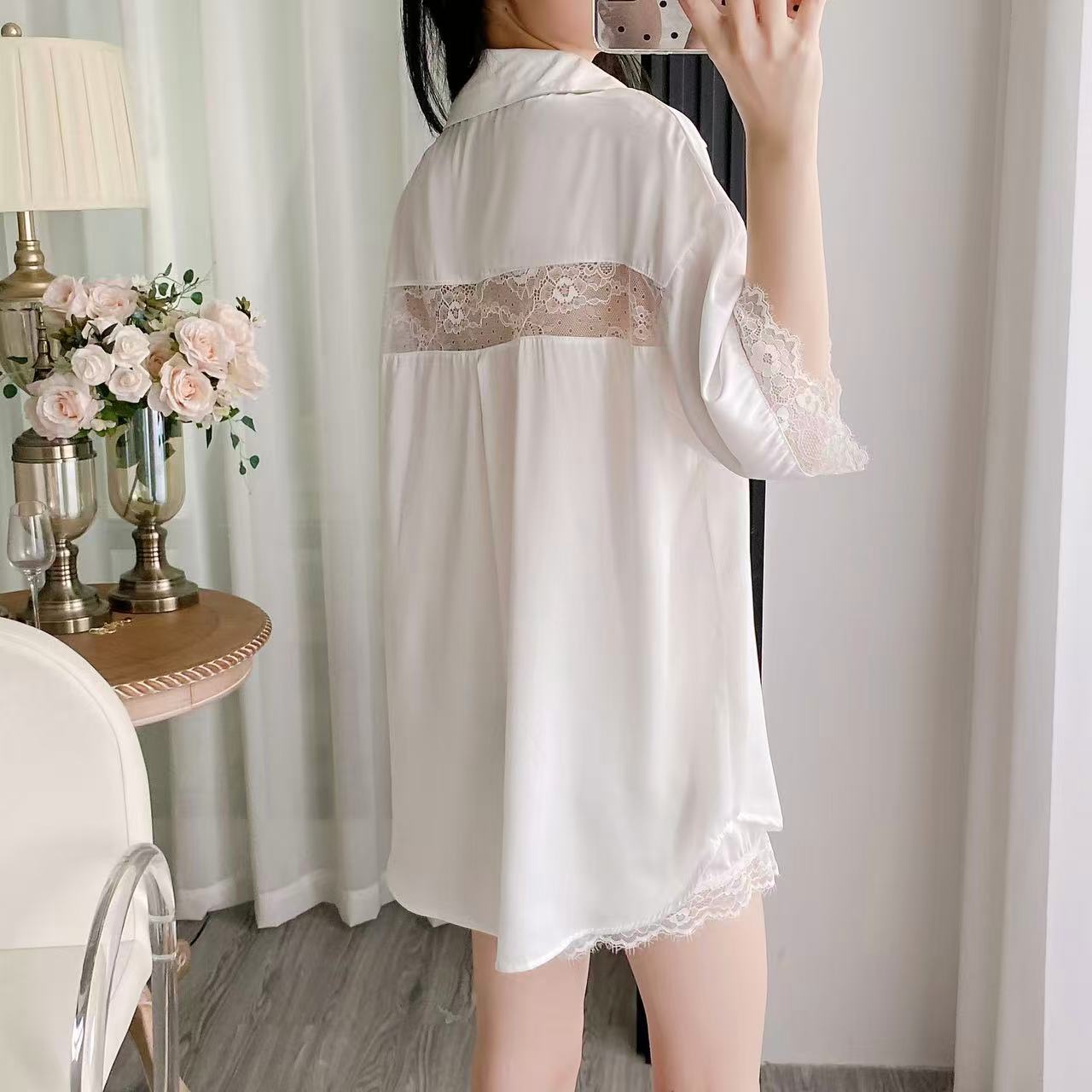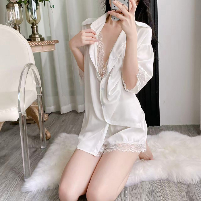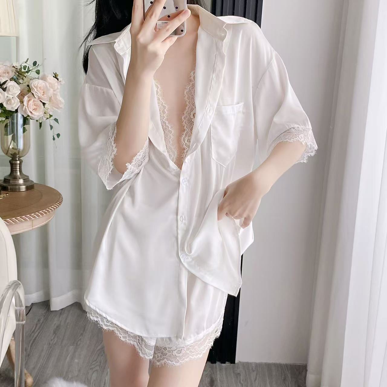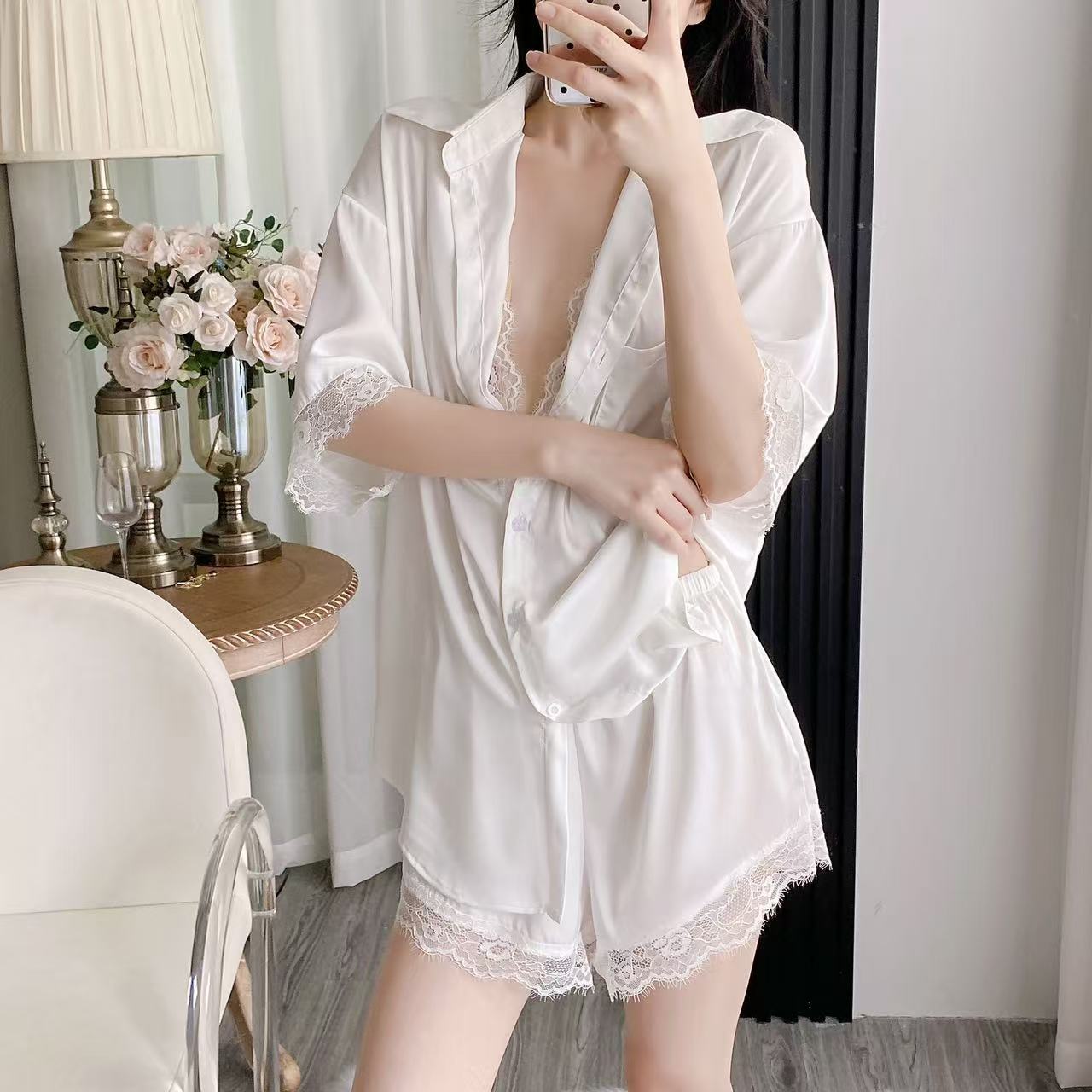 레이스 섹시한 얼음 실크 얇은 반팔 검은 셔츠 스타일 잠옷 2025 새로운 성인 잠옷 남자 친구 스타일 홈웨어스토어 가기