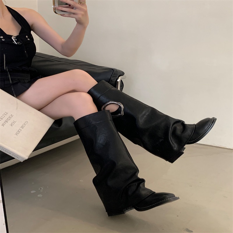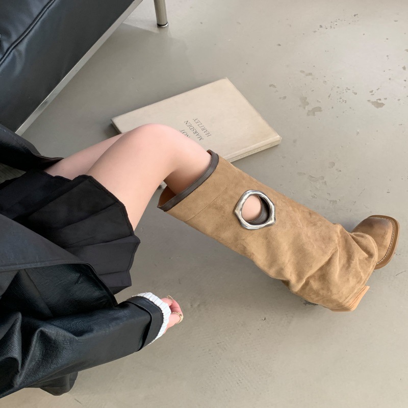 여성을위한 심플 스퀘어 토 스트레이트 팬츠 부츠 2025 봄 여름 신작 다용도 두꺼운 굽 웨스턴 부츠 레트로 가죽 나이트 부츠