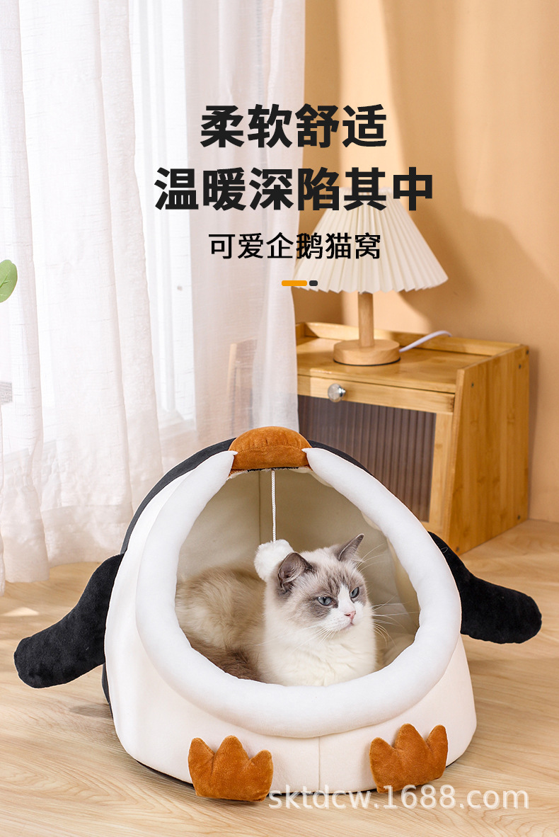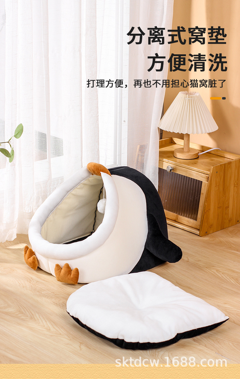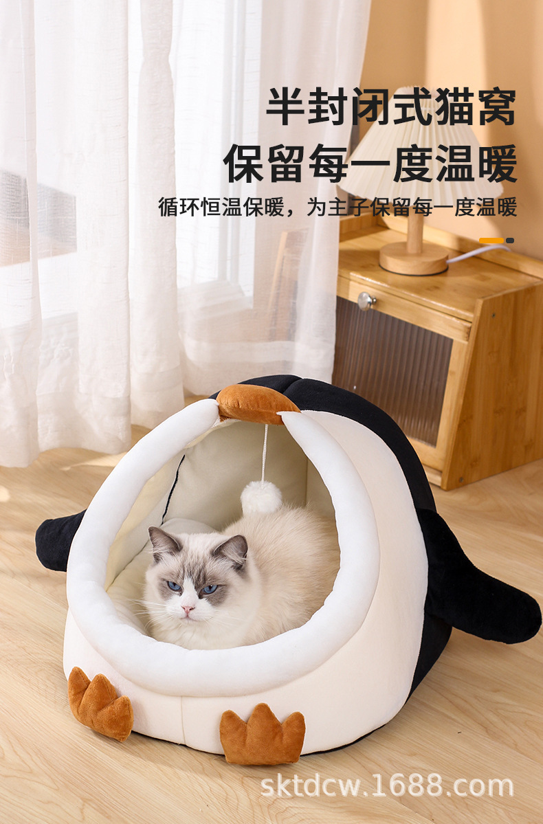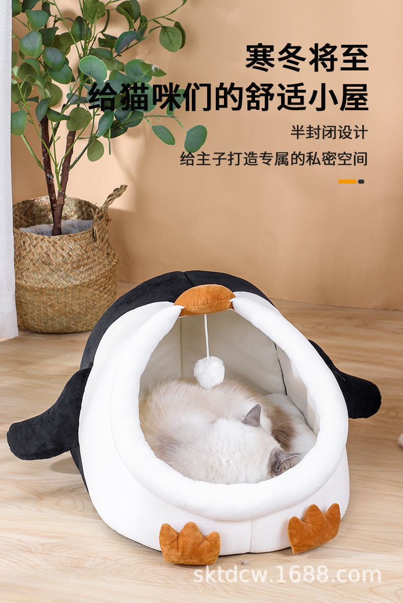 고양이 개집 펭귄 스타일 짧은 플러시 부드럽고 따뜻한 애완 동물 분리형 및 세척 가능한 반 밀폐형 고양이 애완 동물 용품스토어 가기