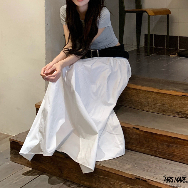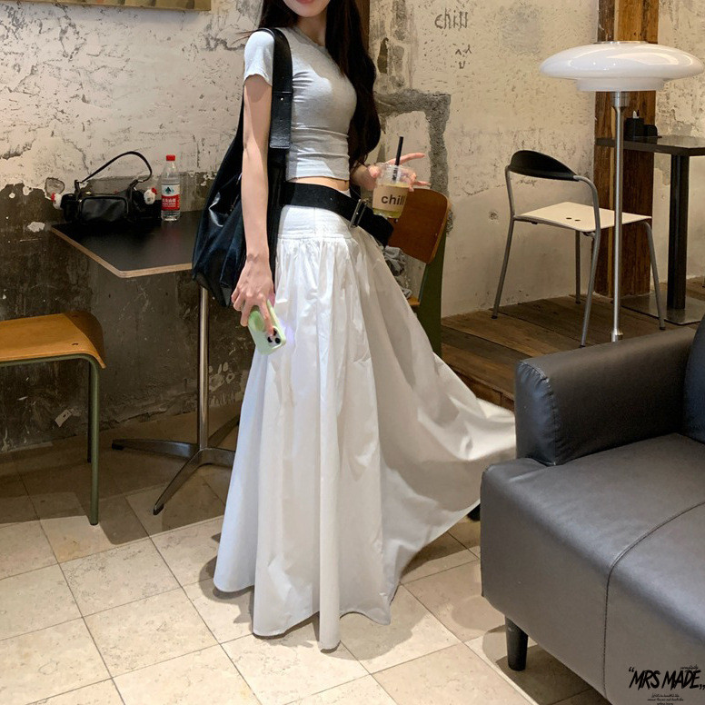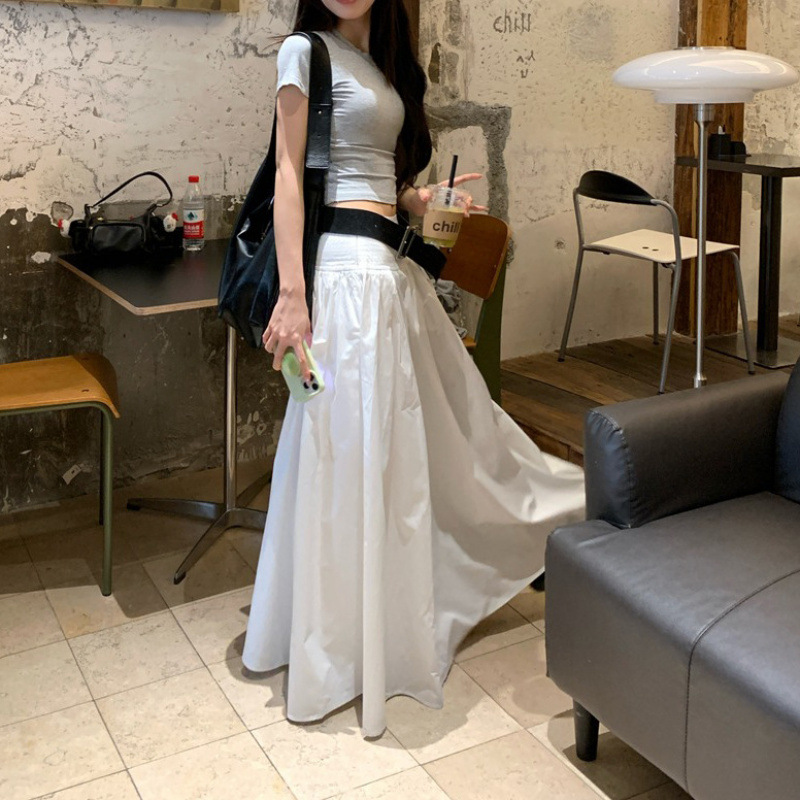 한국 핫걸 배꼽 노출 회색 라운드 넥 짧은 티셔츠 여성 여름 신작 로우 웨이스트 화이트 스커트 투피스 세트스토어 가기