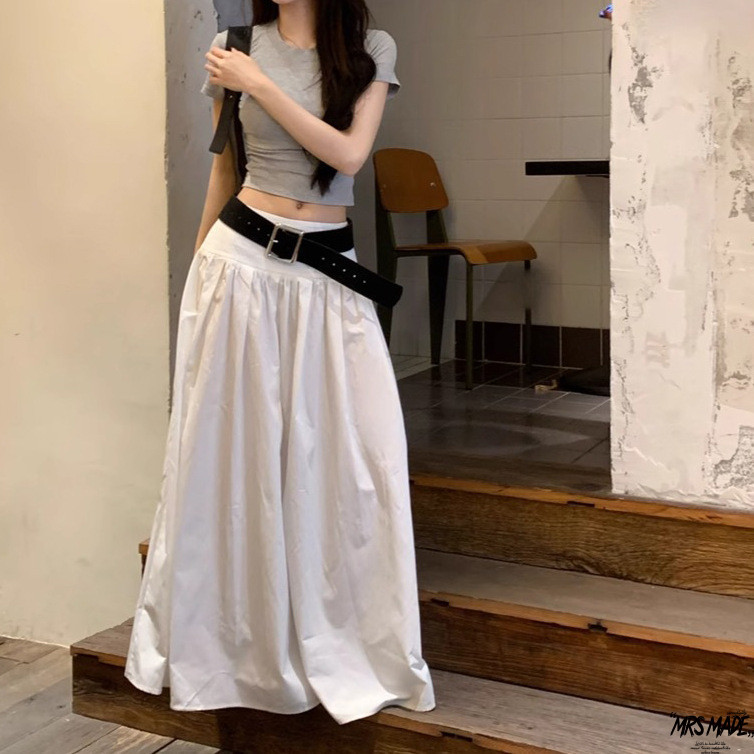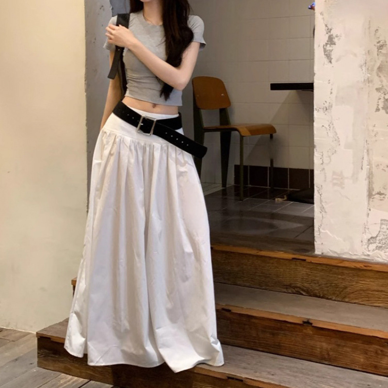 한국 핫걸 배꼽 노출 회색 라운드 넥 짧은 티셔츠 여성 여름 신작 로우 웨이스트 화이트 스커트 투피스 세트