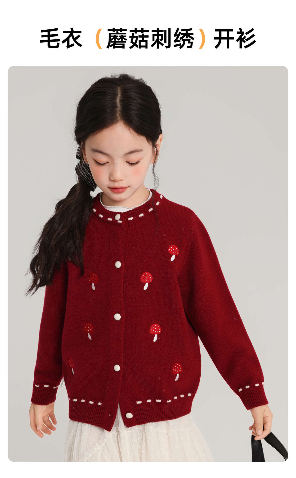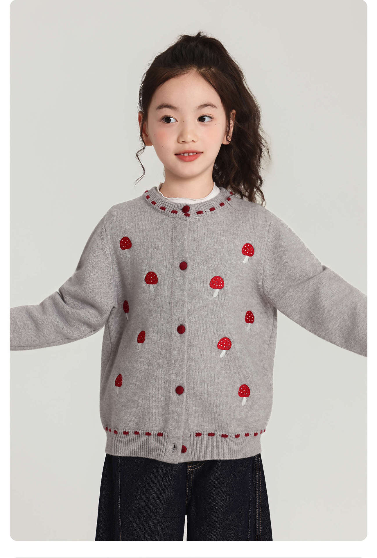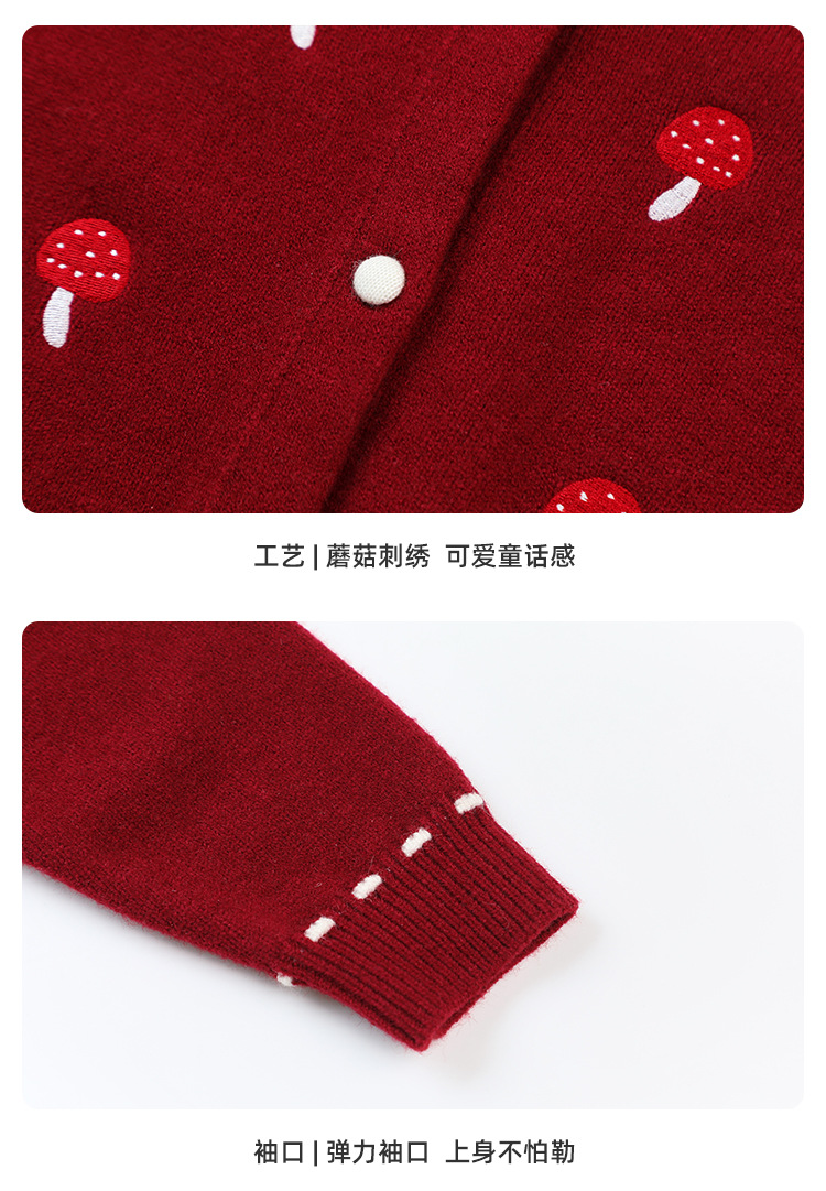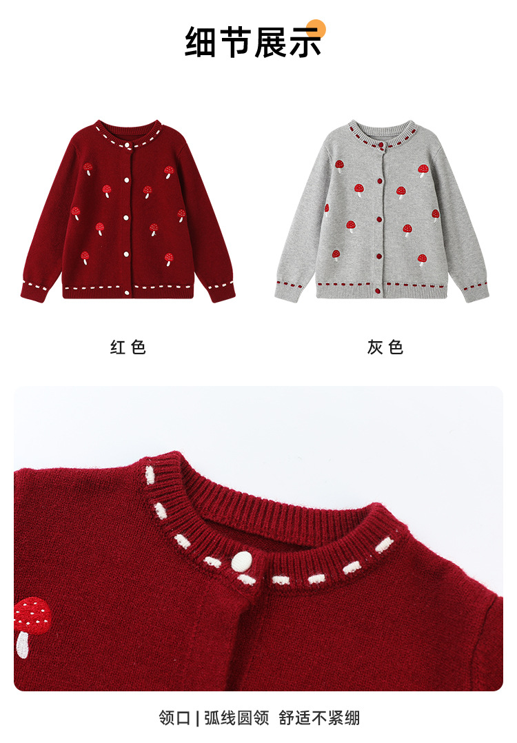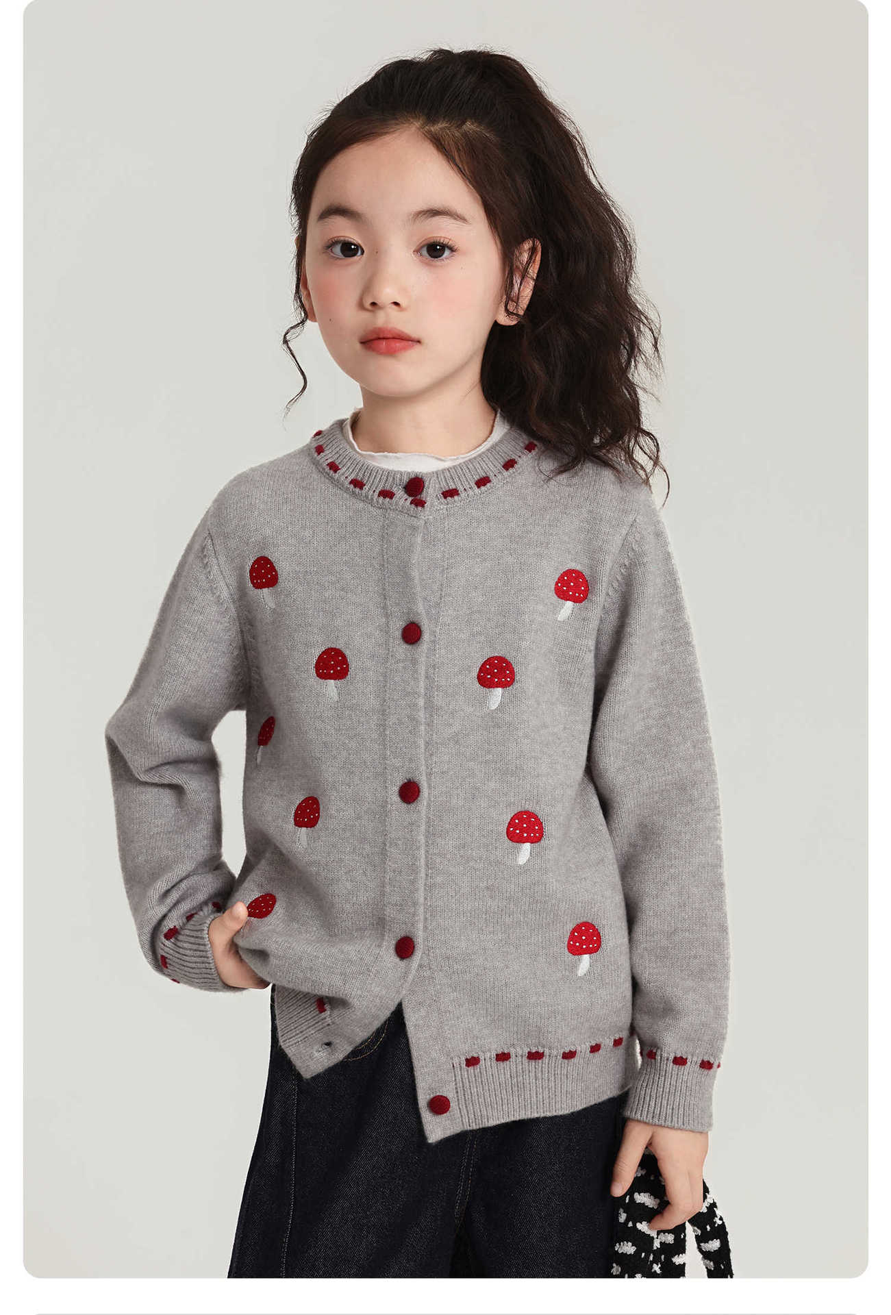 Pudding Haru Girls Top 2025 새로운 어린이 긴팔 버섯 자수 스웨터 카디건 소녀 가을 코트