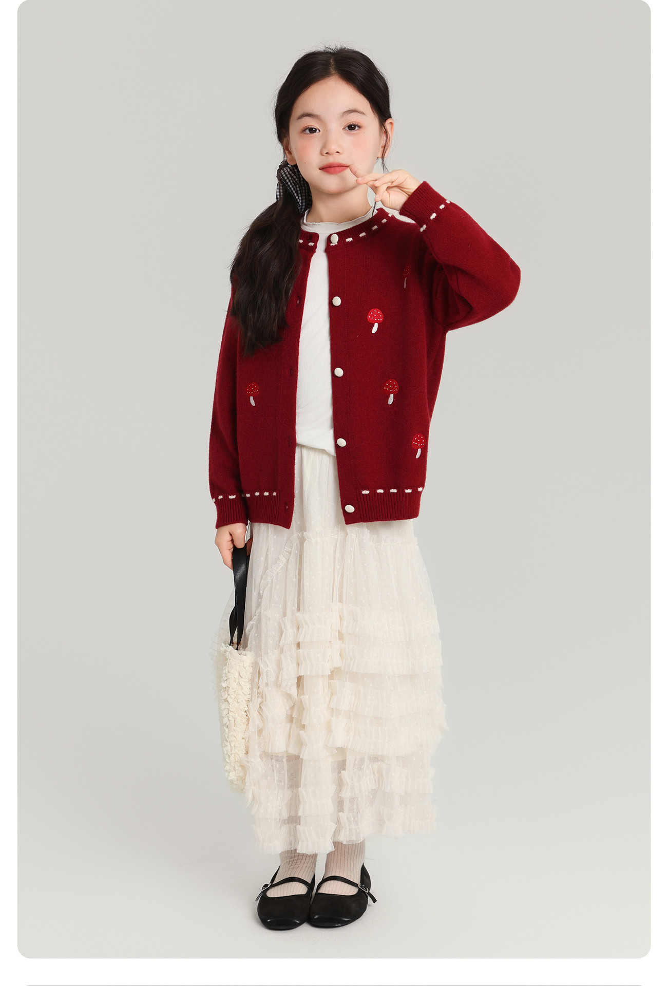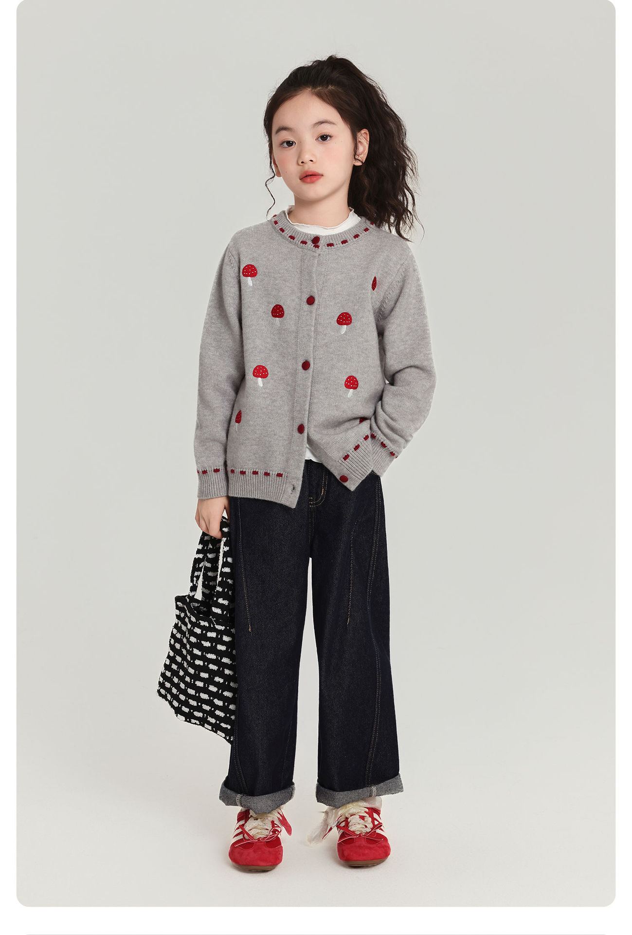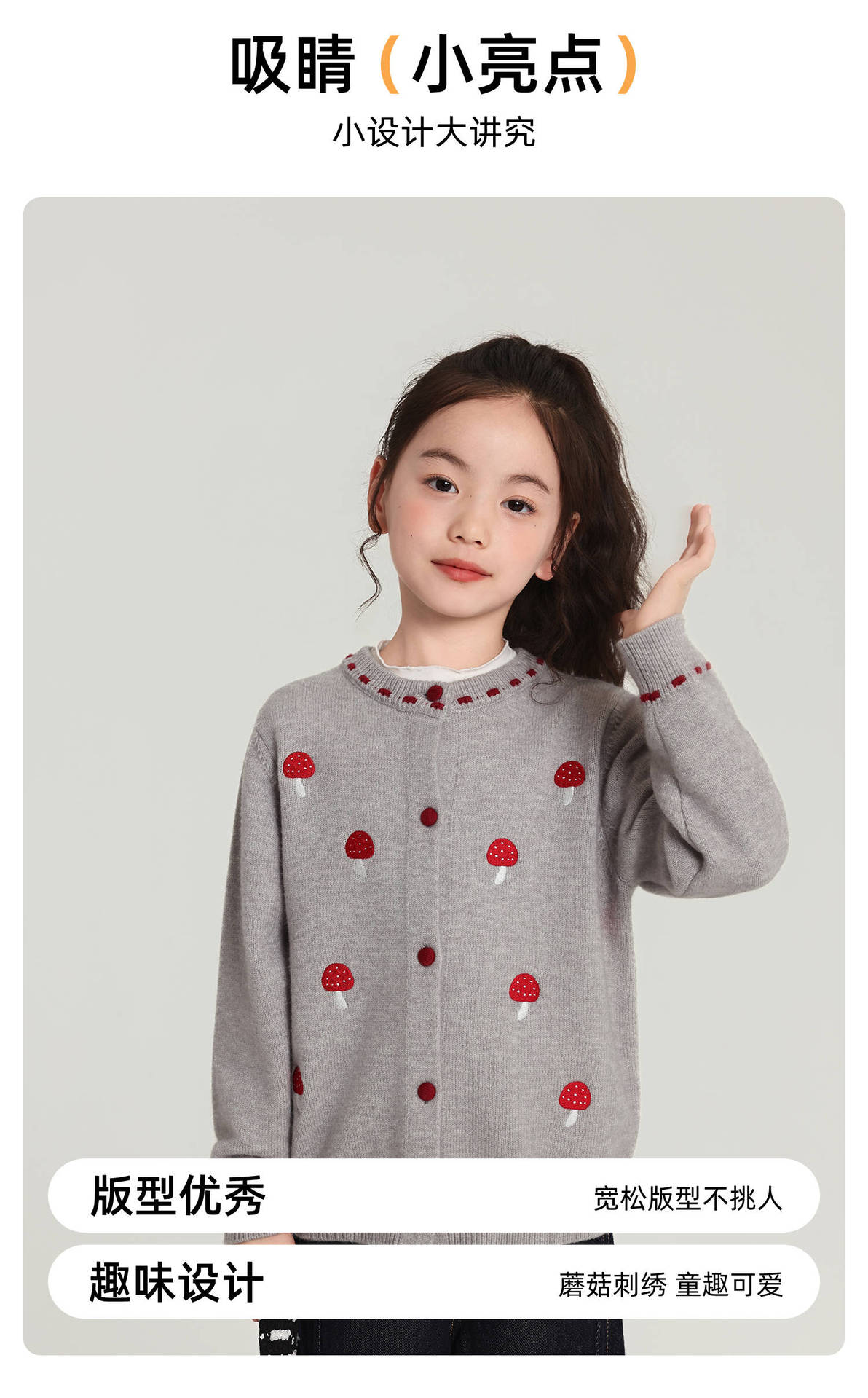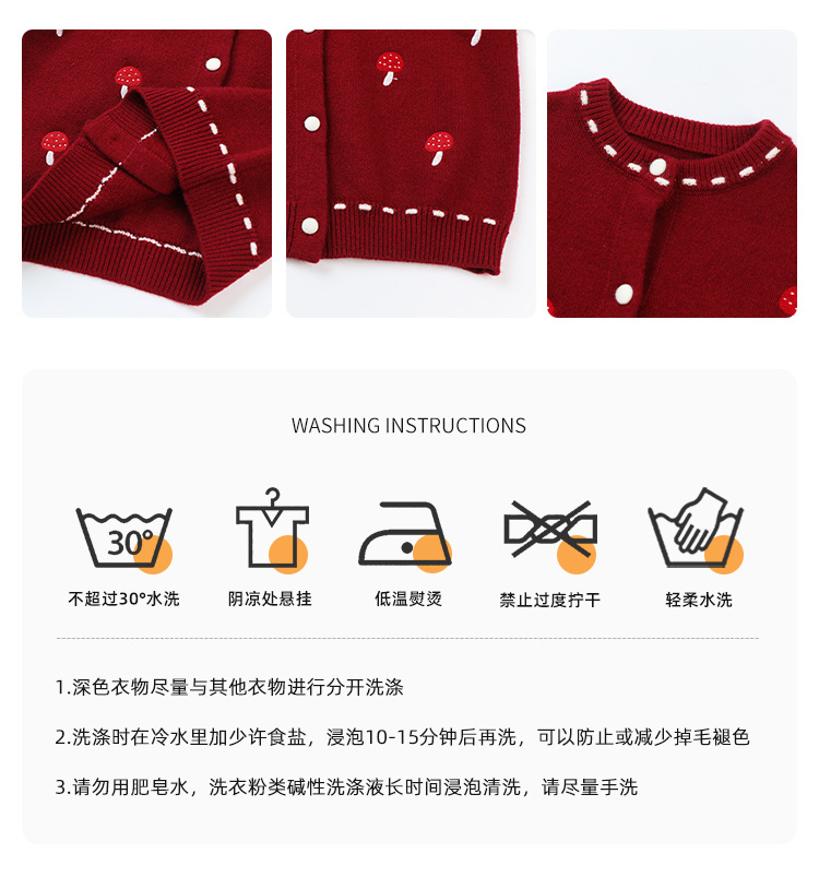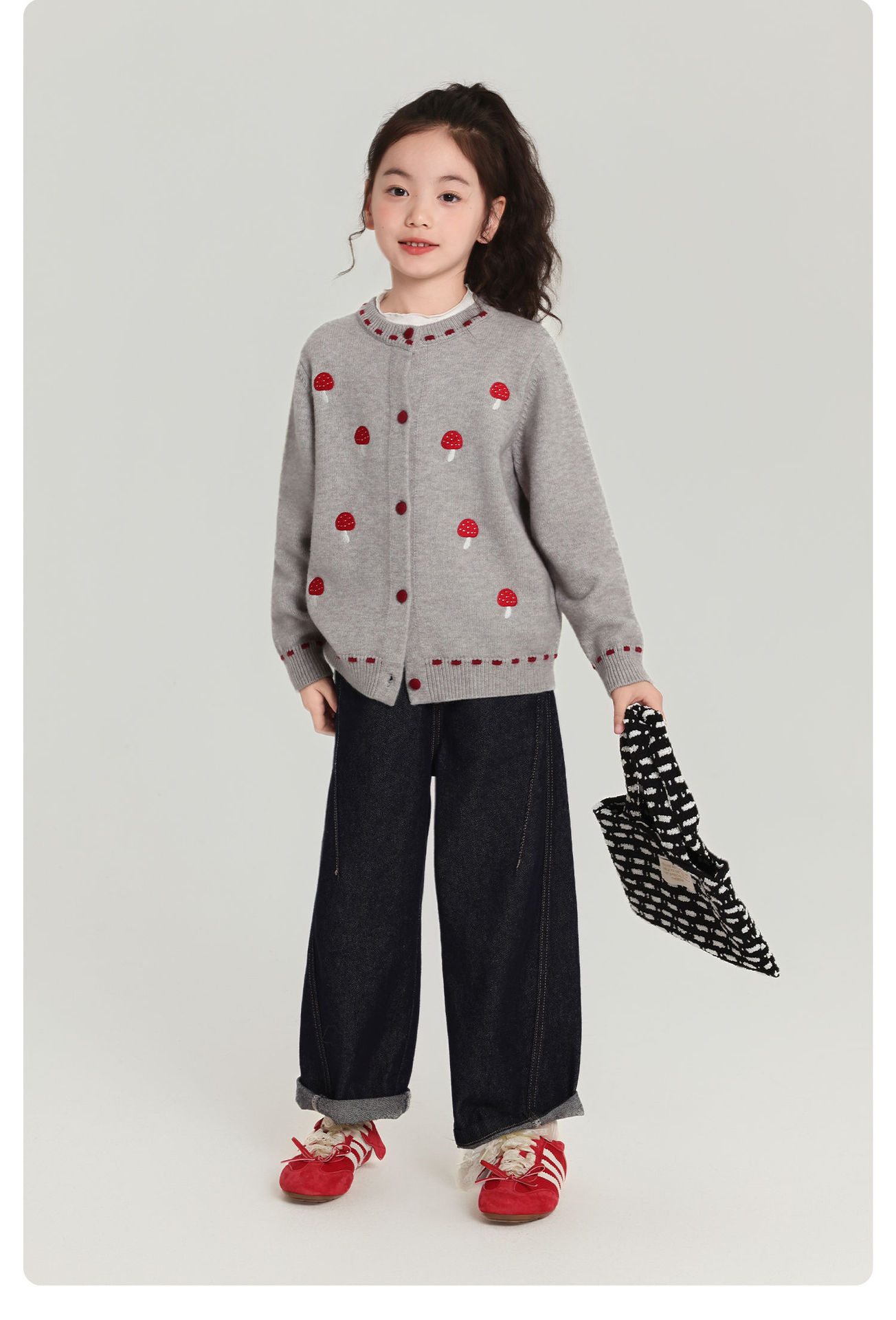 Pudding Haru Girls Top 2025 새로운 어린이 긴팔 버섯 자수 스웨터 카디건 소녀 가을 코트