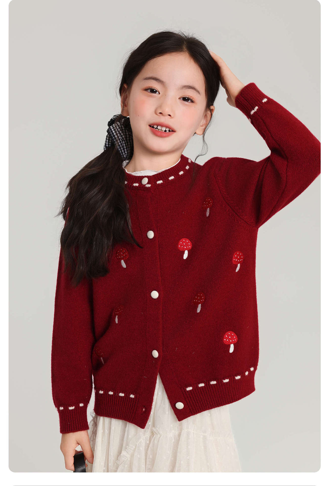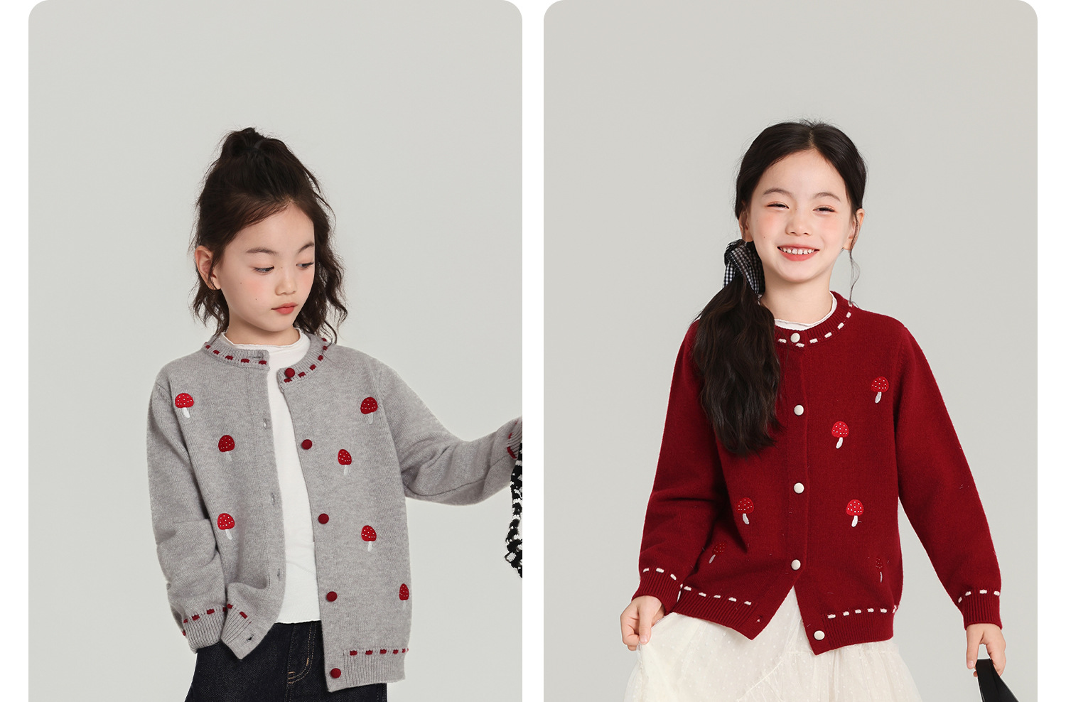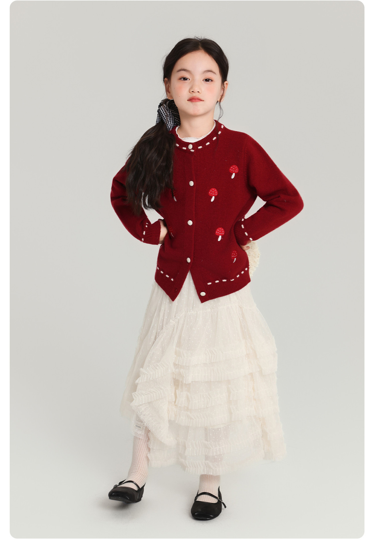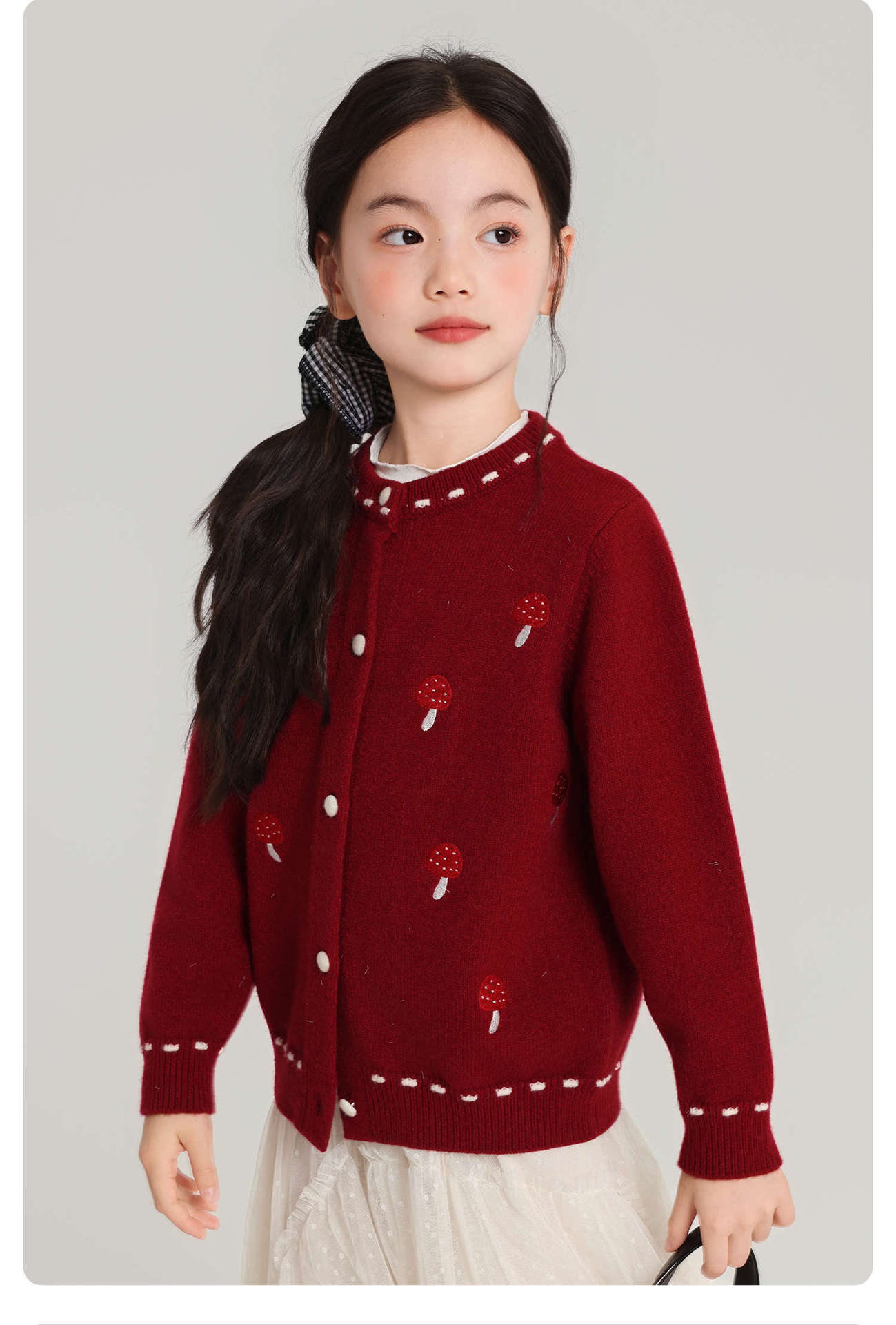 Pudding Haru Girls Top 2025 새로운 어린이 긴팔 버섯 자수 스웨터 카디건 소녀 가을 코트