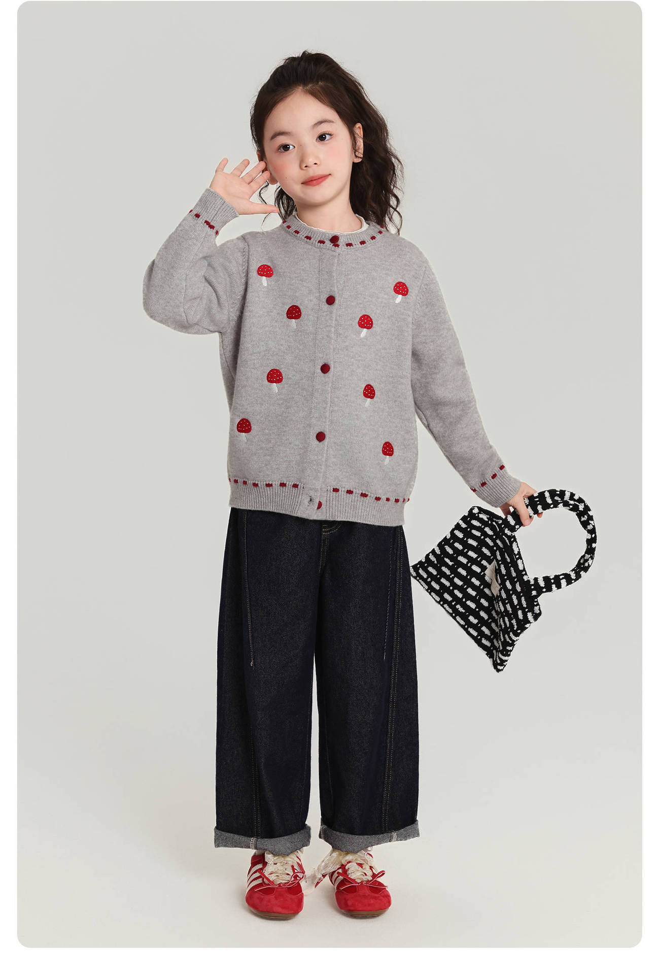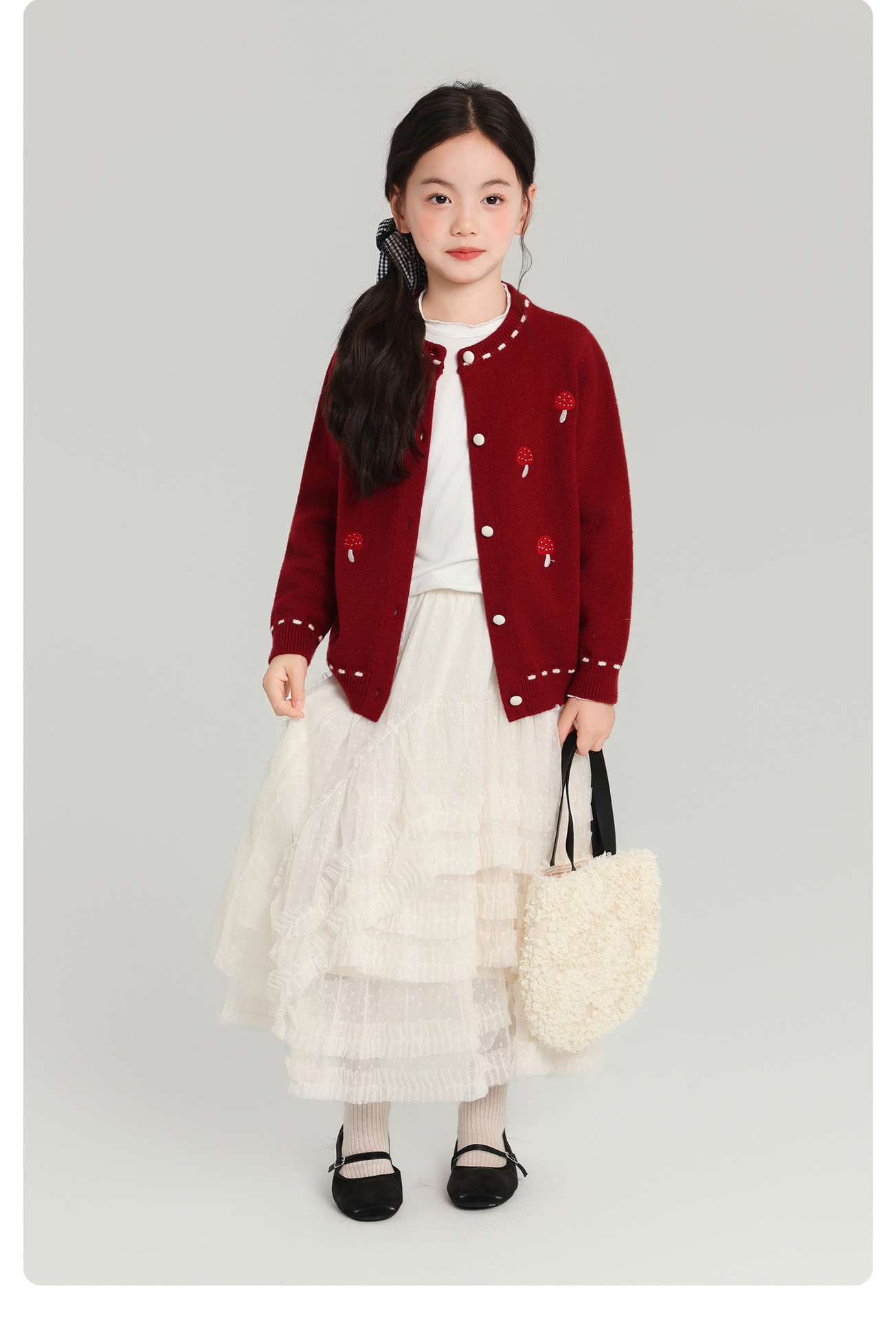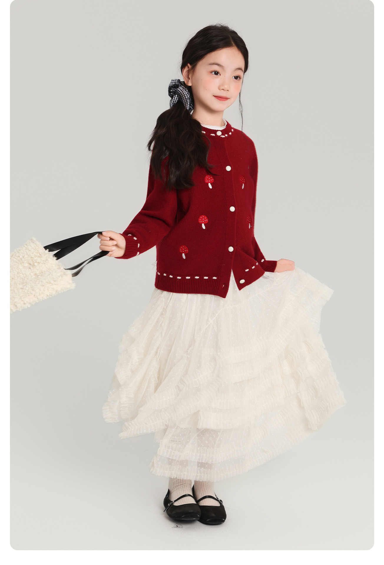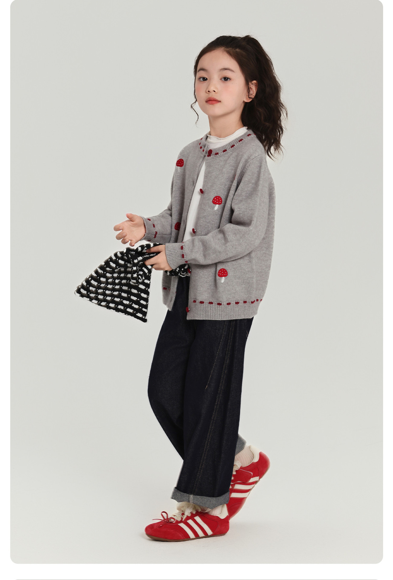 Pudding Haru Girls Top 2025 새로운 어린이 긴팔 버섯 자수 스웨터 카디건 소녀 가을 코트