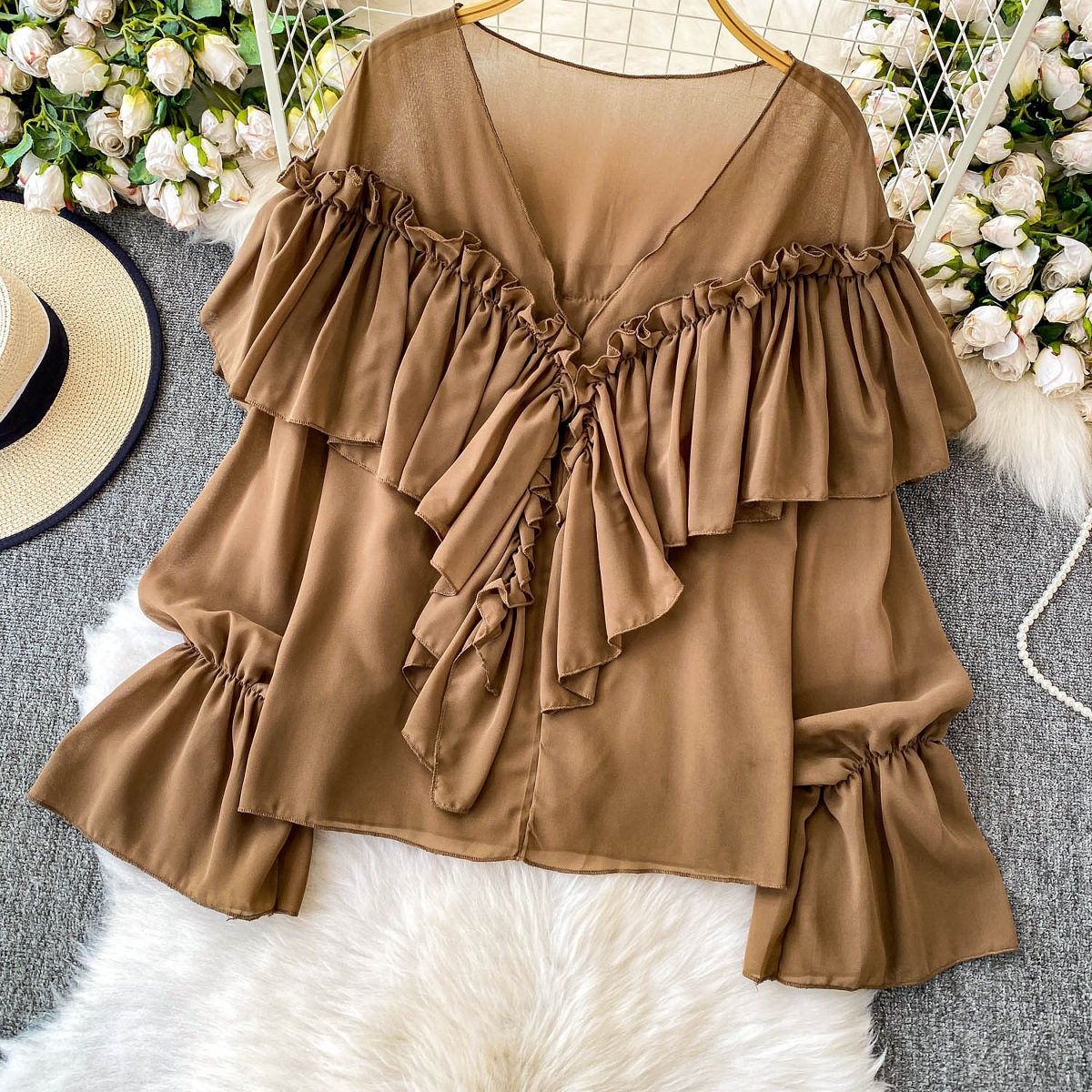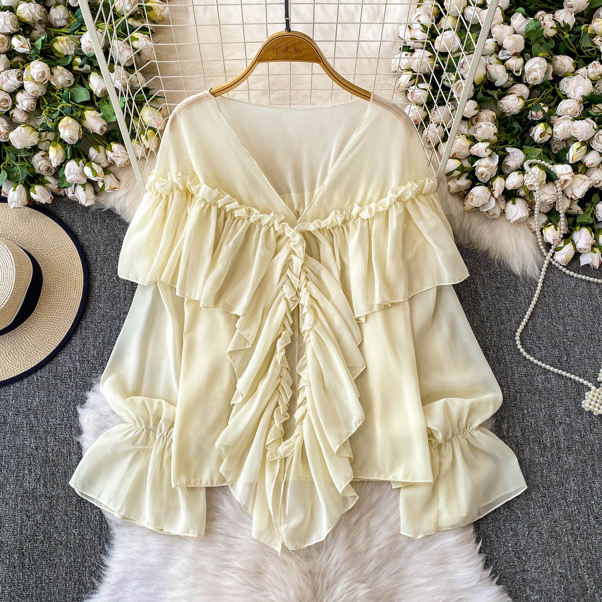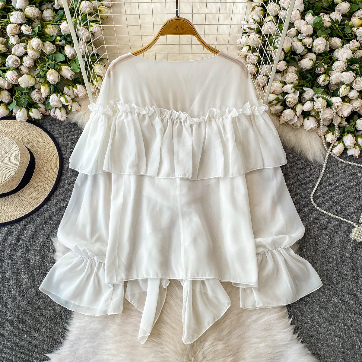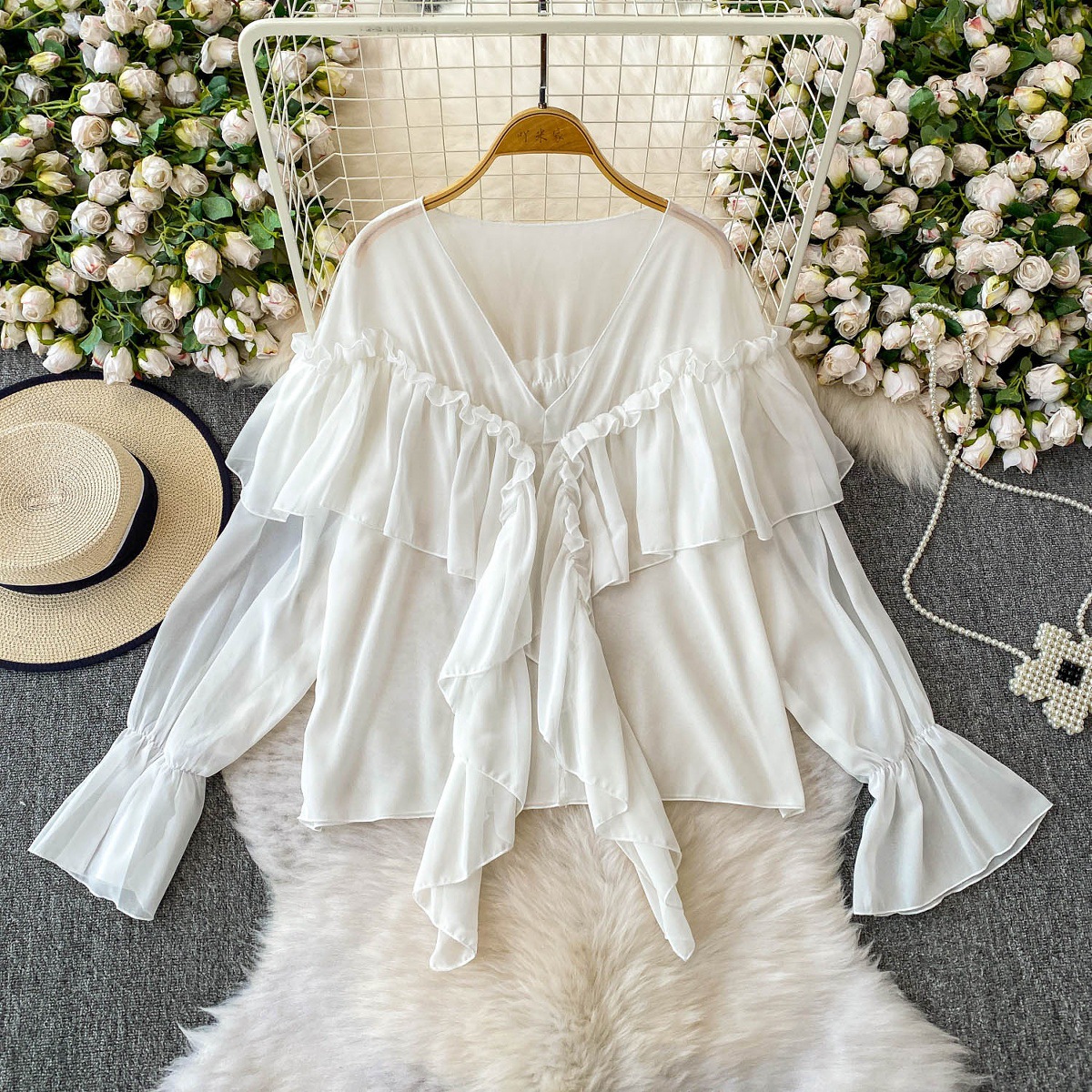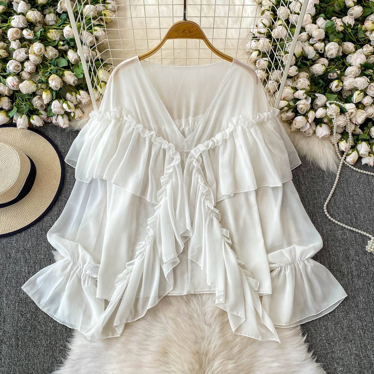 여성을위한 흰색 v 넥 벨 슬리브 자외선 차단제 주름 방지 쉬폰 셔츠 2025 여름 기질 느슨한 슬리밍 프릴 셔츠