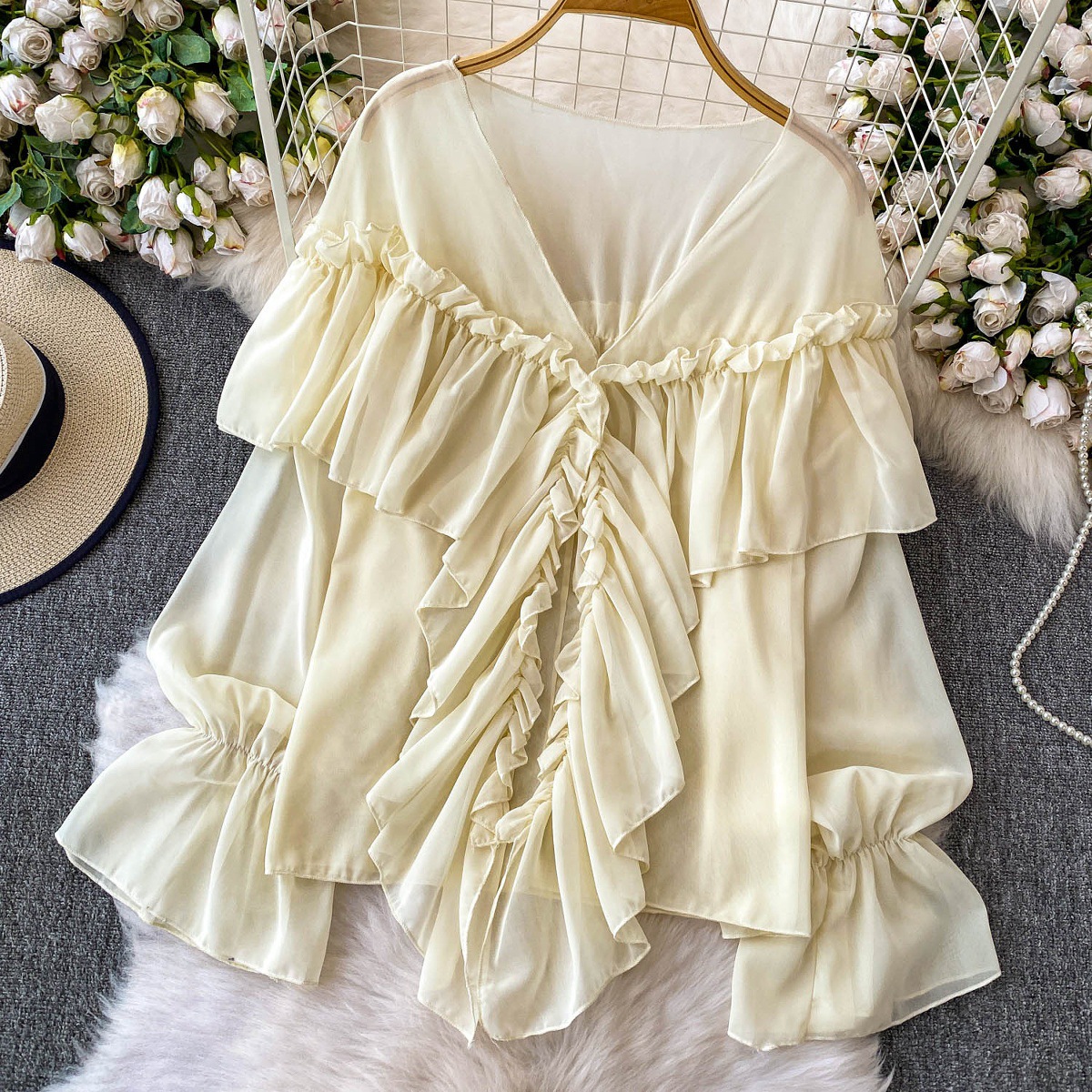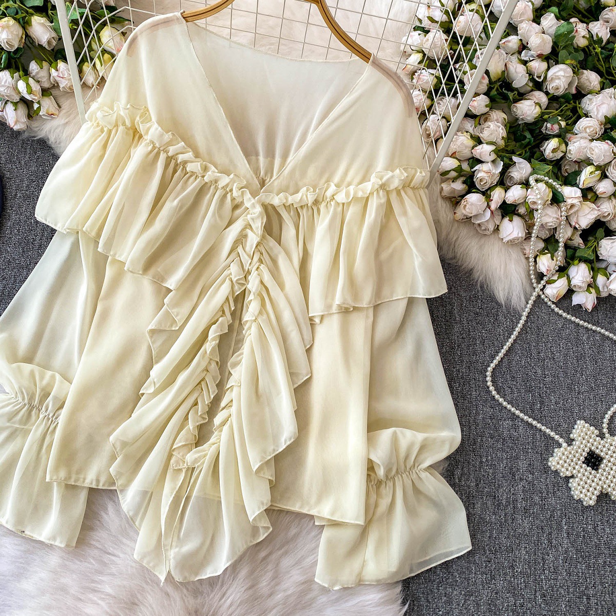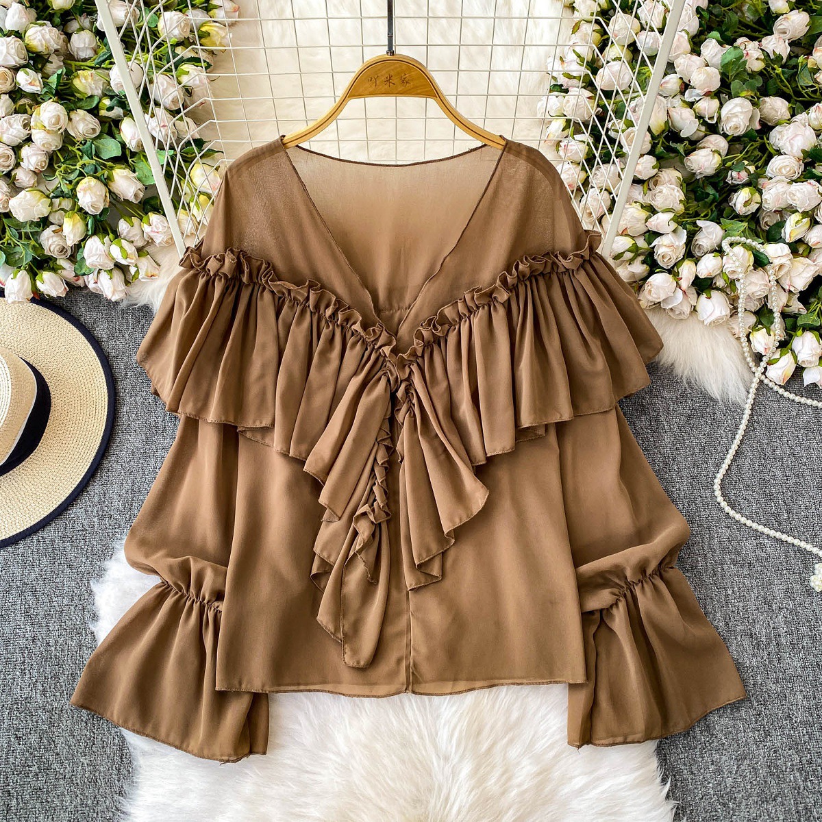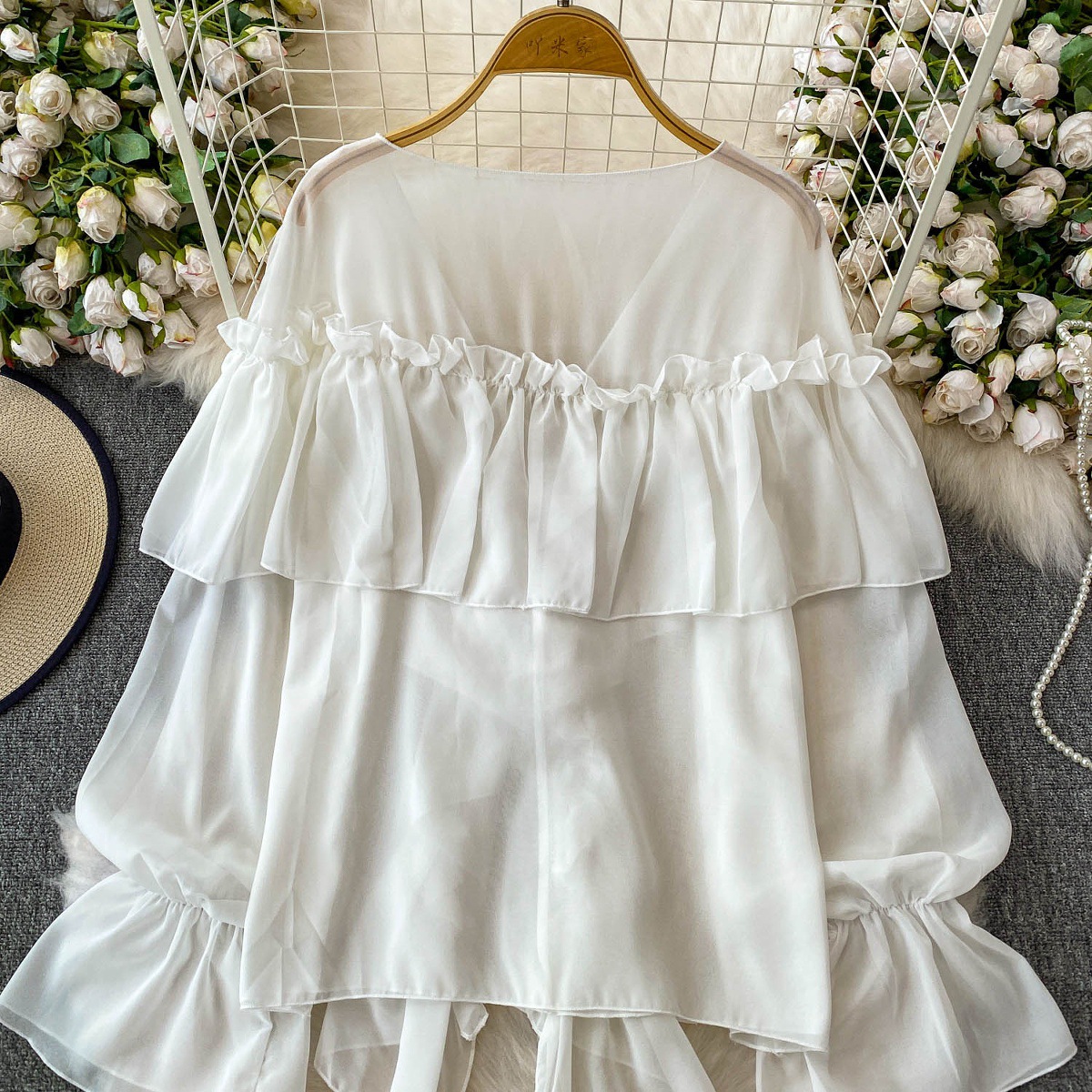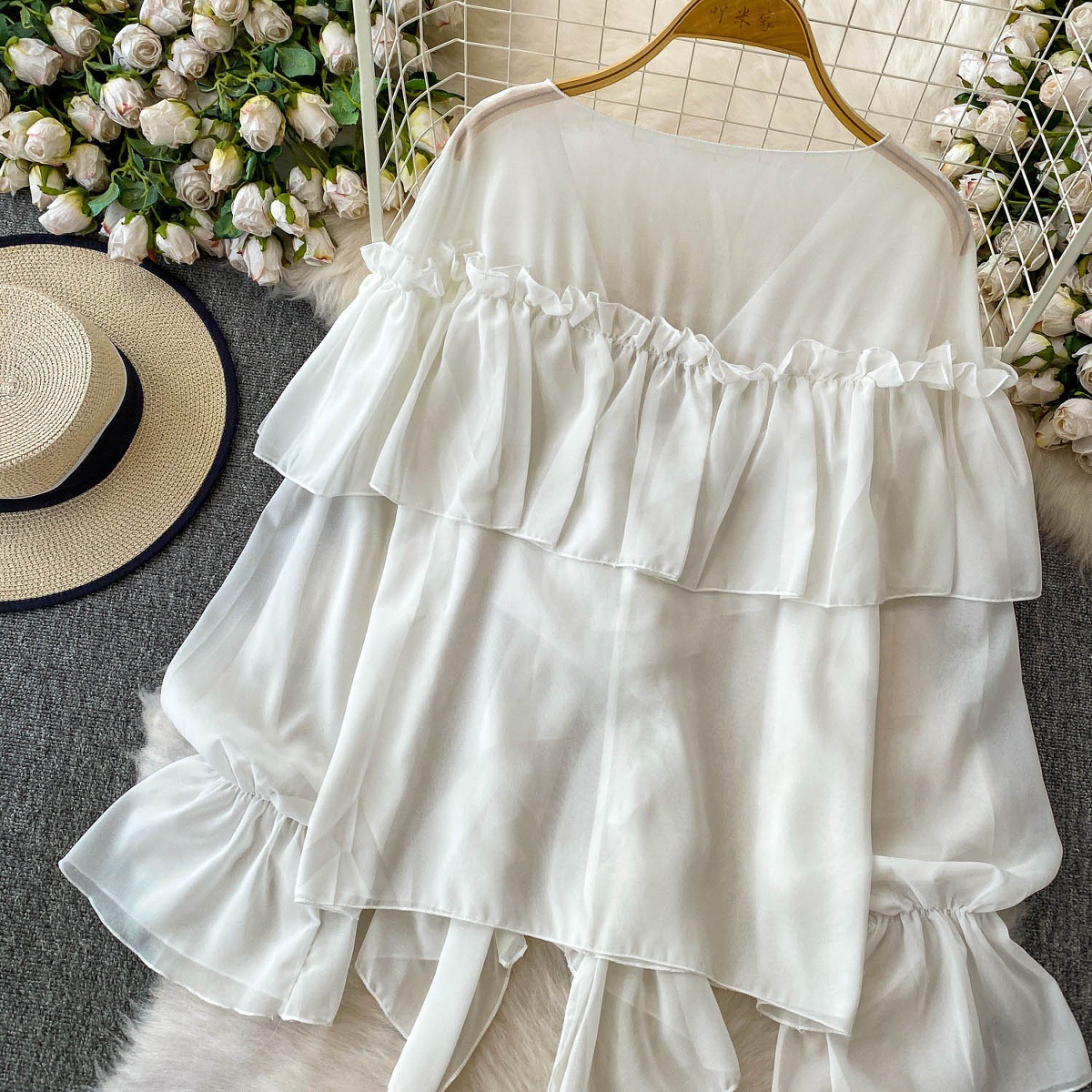 여성을위한 흰색 v 넥 벨 슬리브 자외선 차단제 주름 방지 쉬폰 셔츠 2025 여름 기질 느슨한 슬리밍 프릴 셔츠