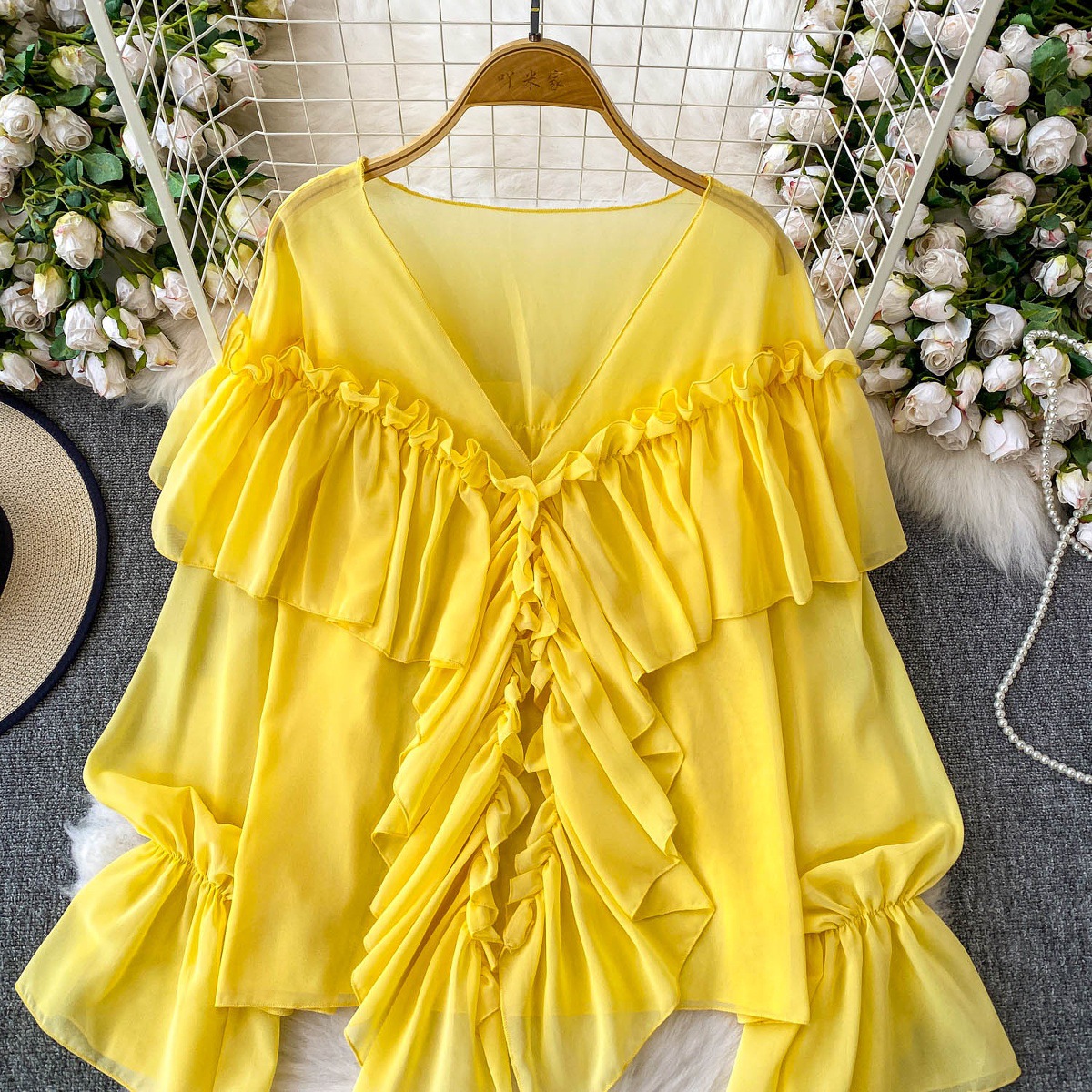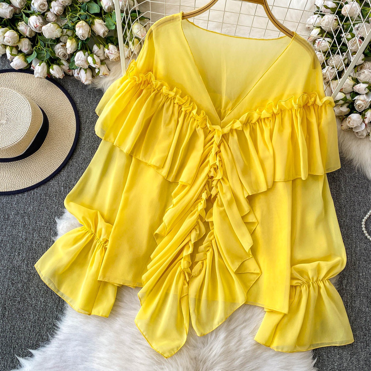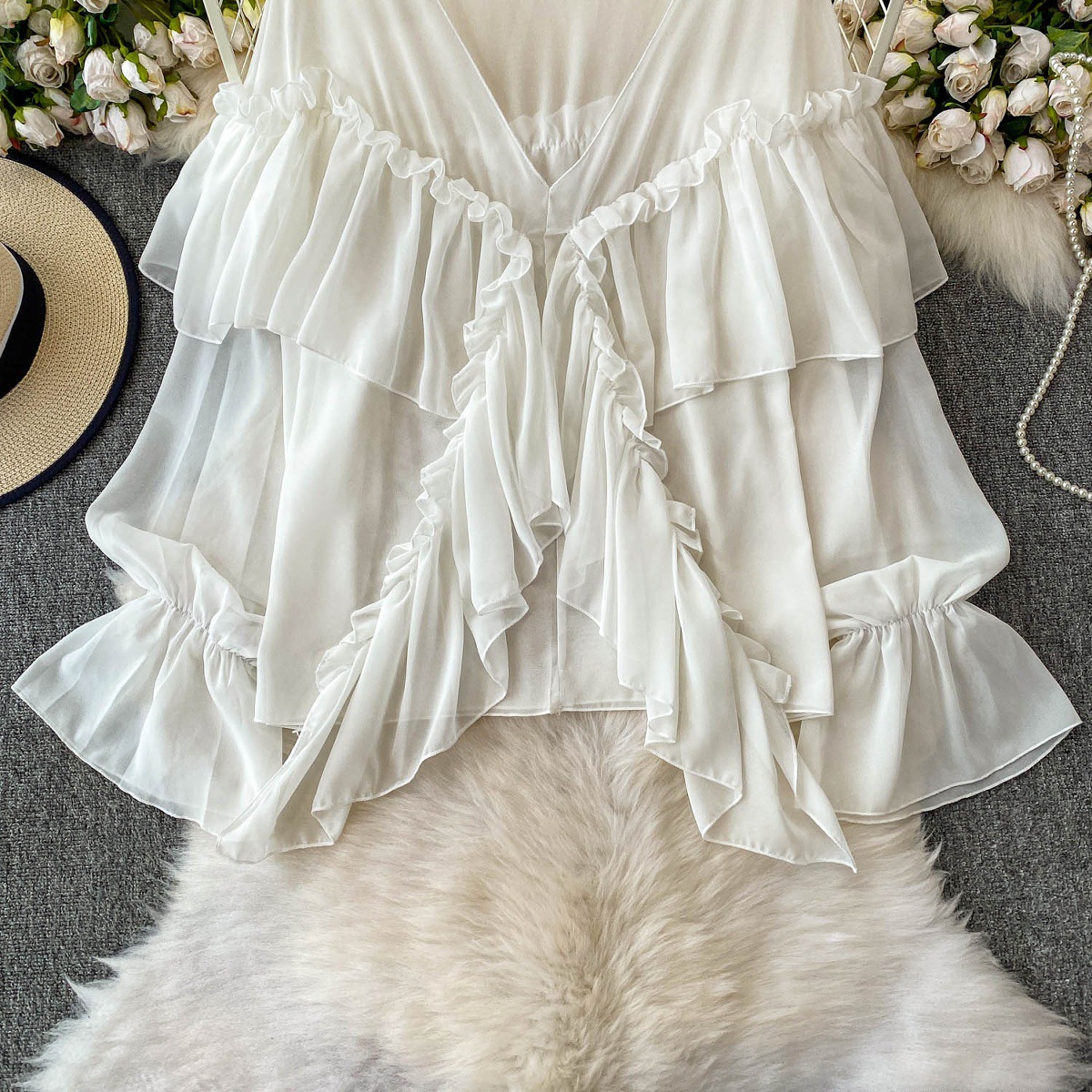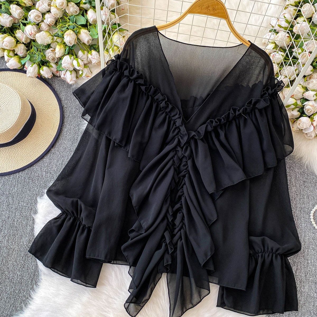 여성을위한 흰색 v 넥 벨 슬리브 자외선 차단제 주름 방지 쉬폰 셔츠 2025 여름 기질 느슨한 슬리밍 프릴 셔츠
