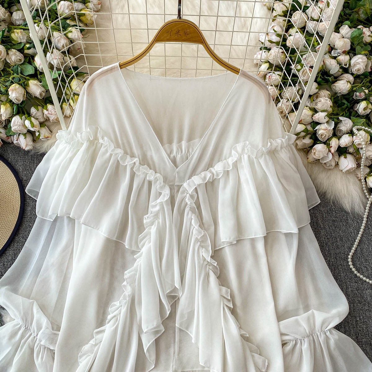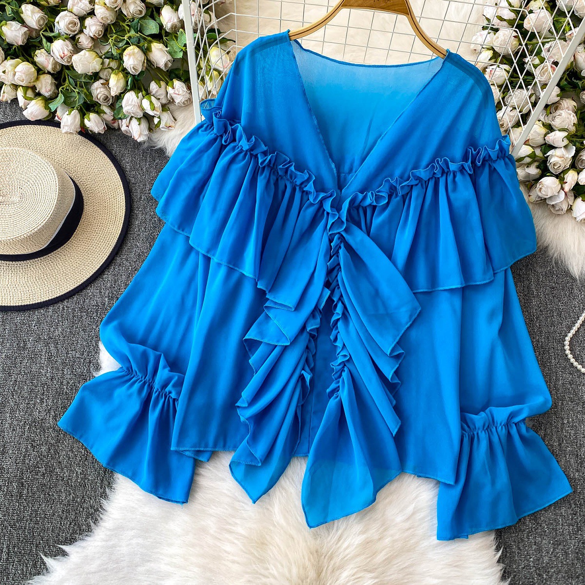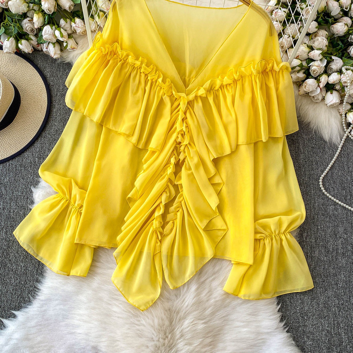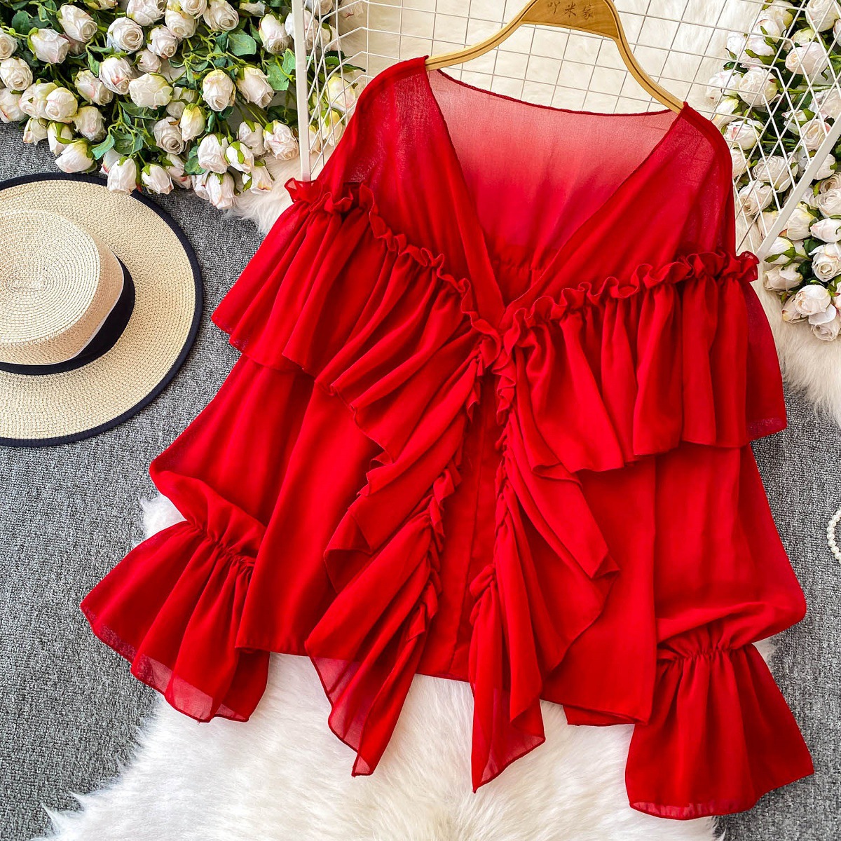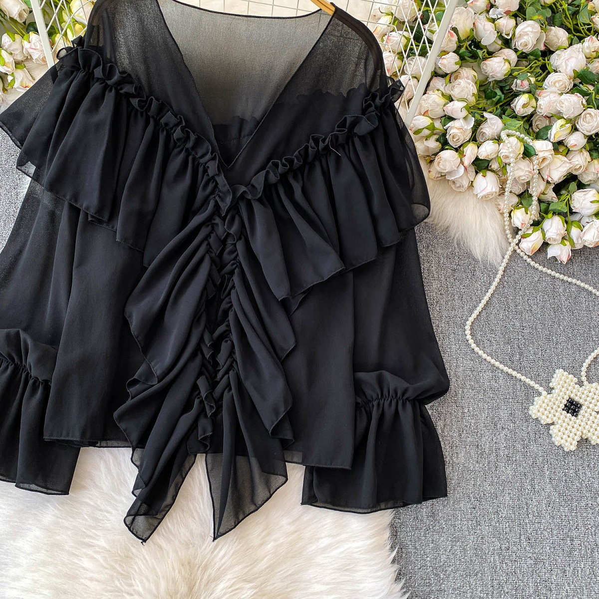 여성을위한 흰색 v 넥 벨 슬리브 자외선 차단제 주름 방지 쉬폰 셔츠 2025 여름 기질 느슨한 슬리밍 프릴 셔츠